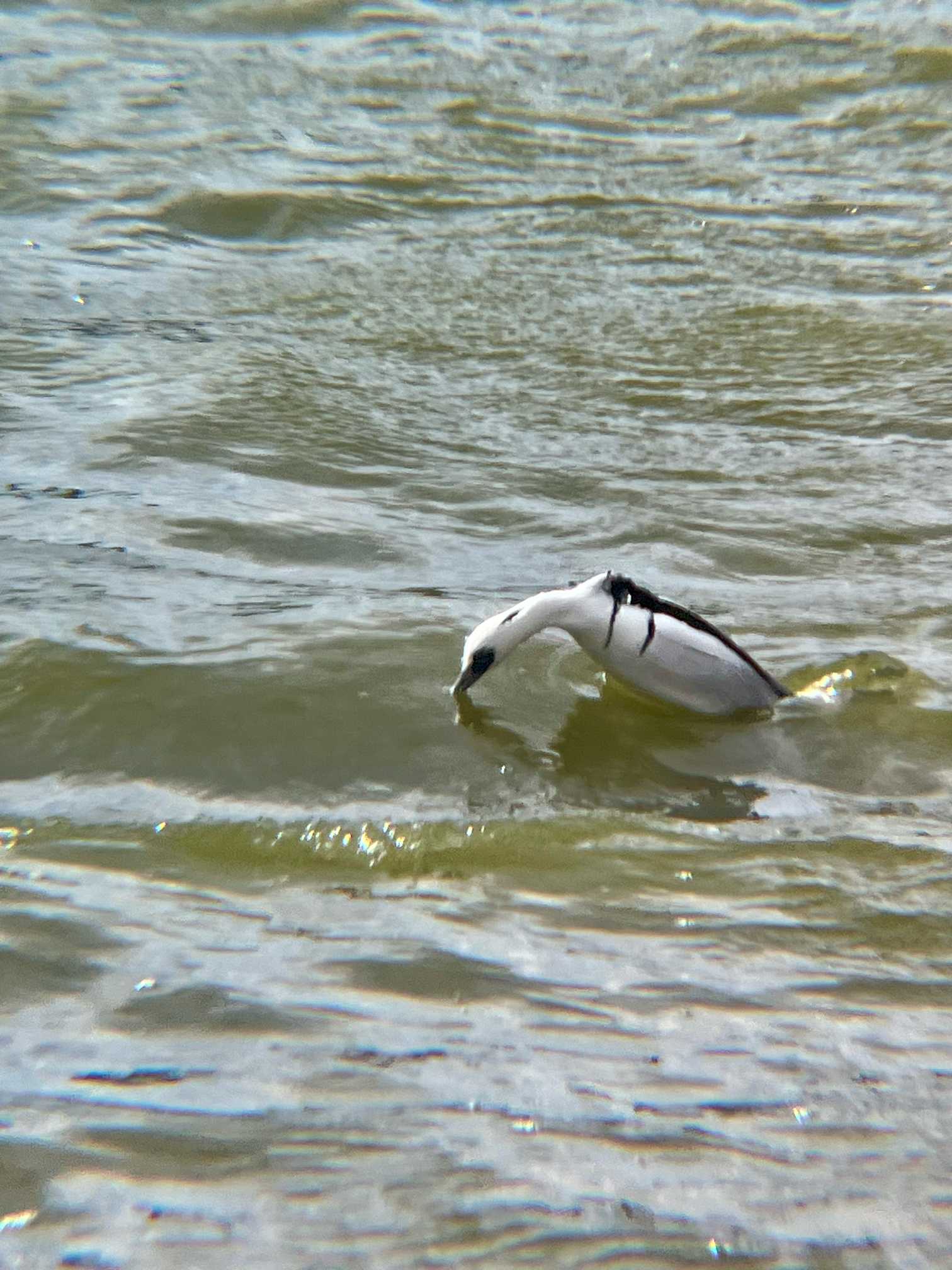 2月の初め頃、数十羽のミコアイサがあちこちで狩(食事)の最中でした。この写真は水の中に潜ろうとしているところです。