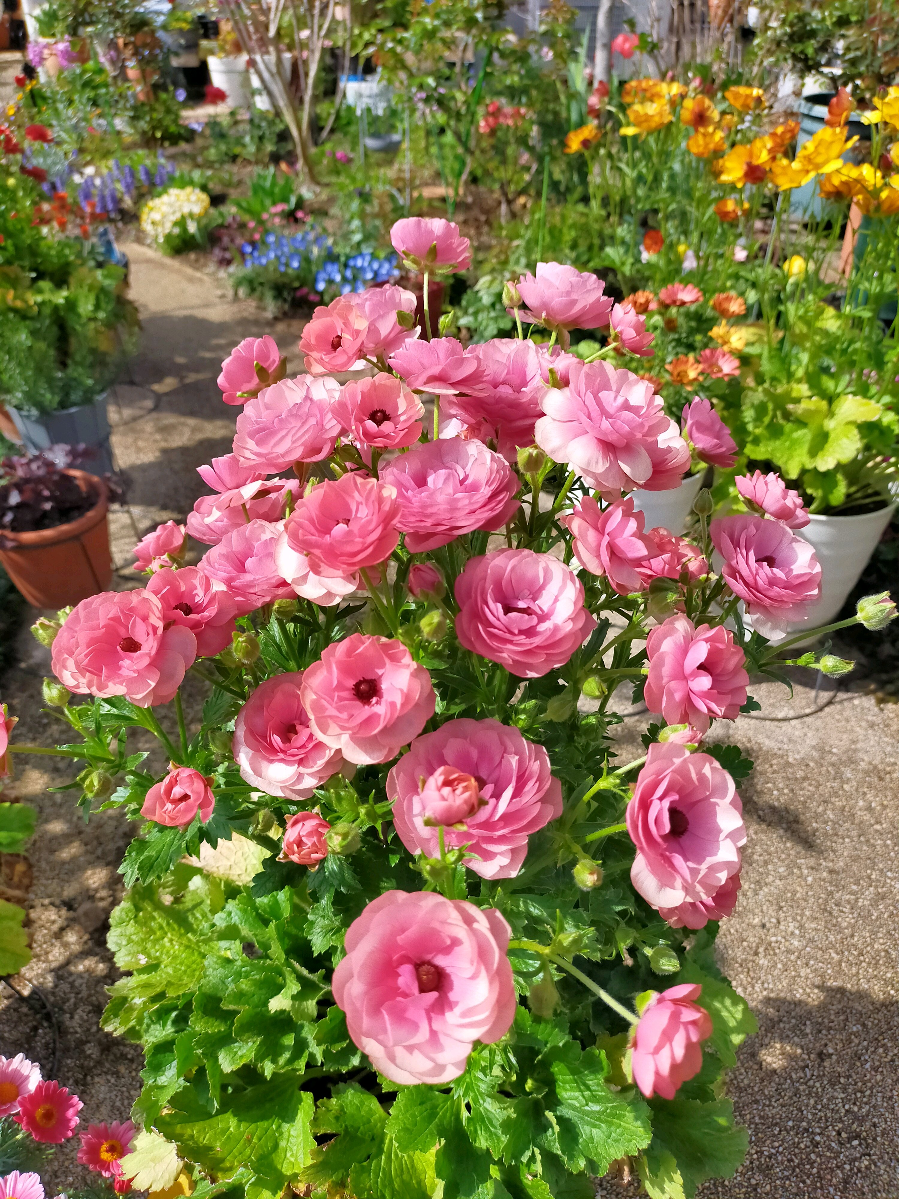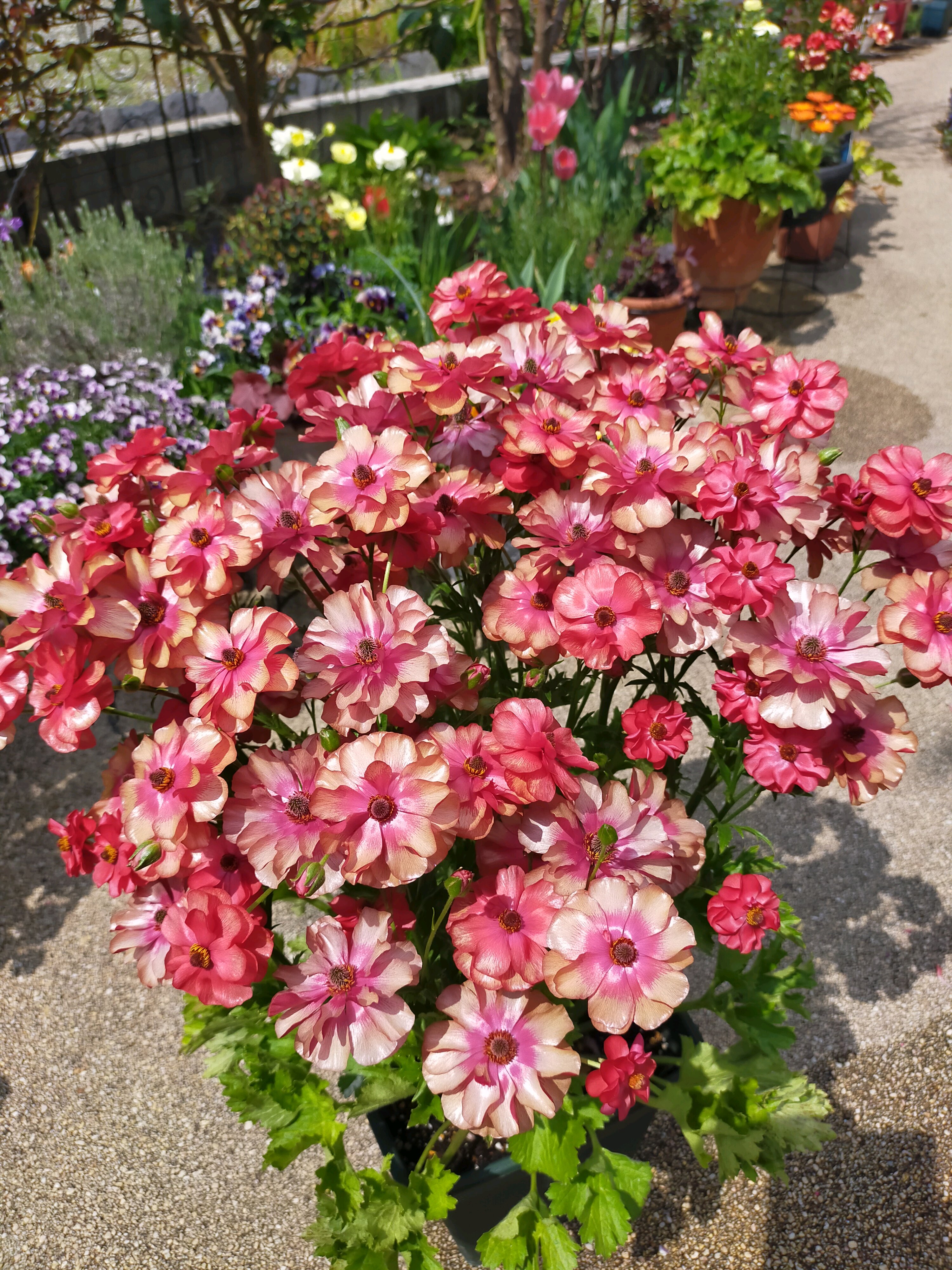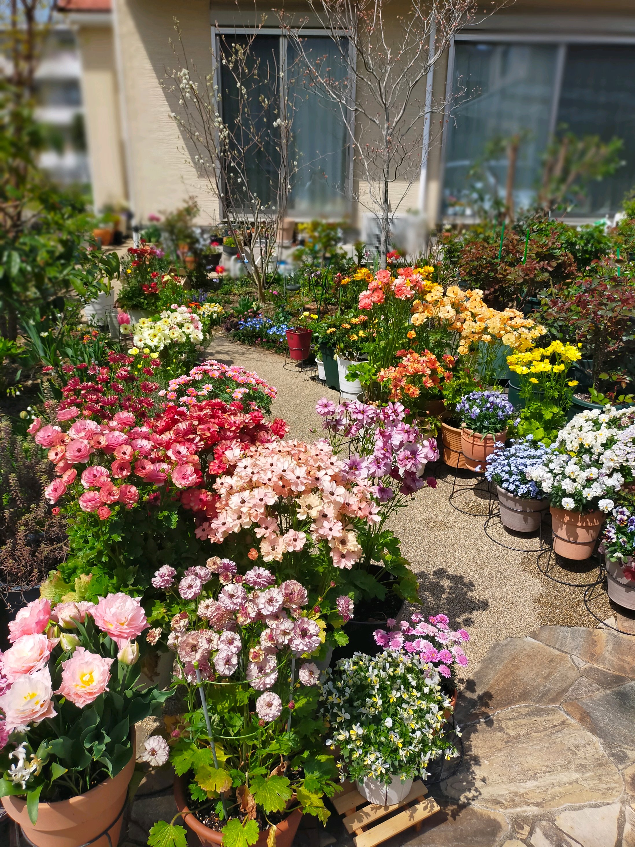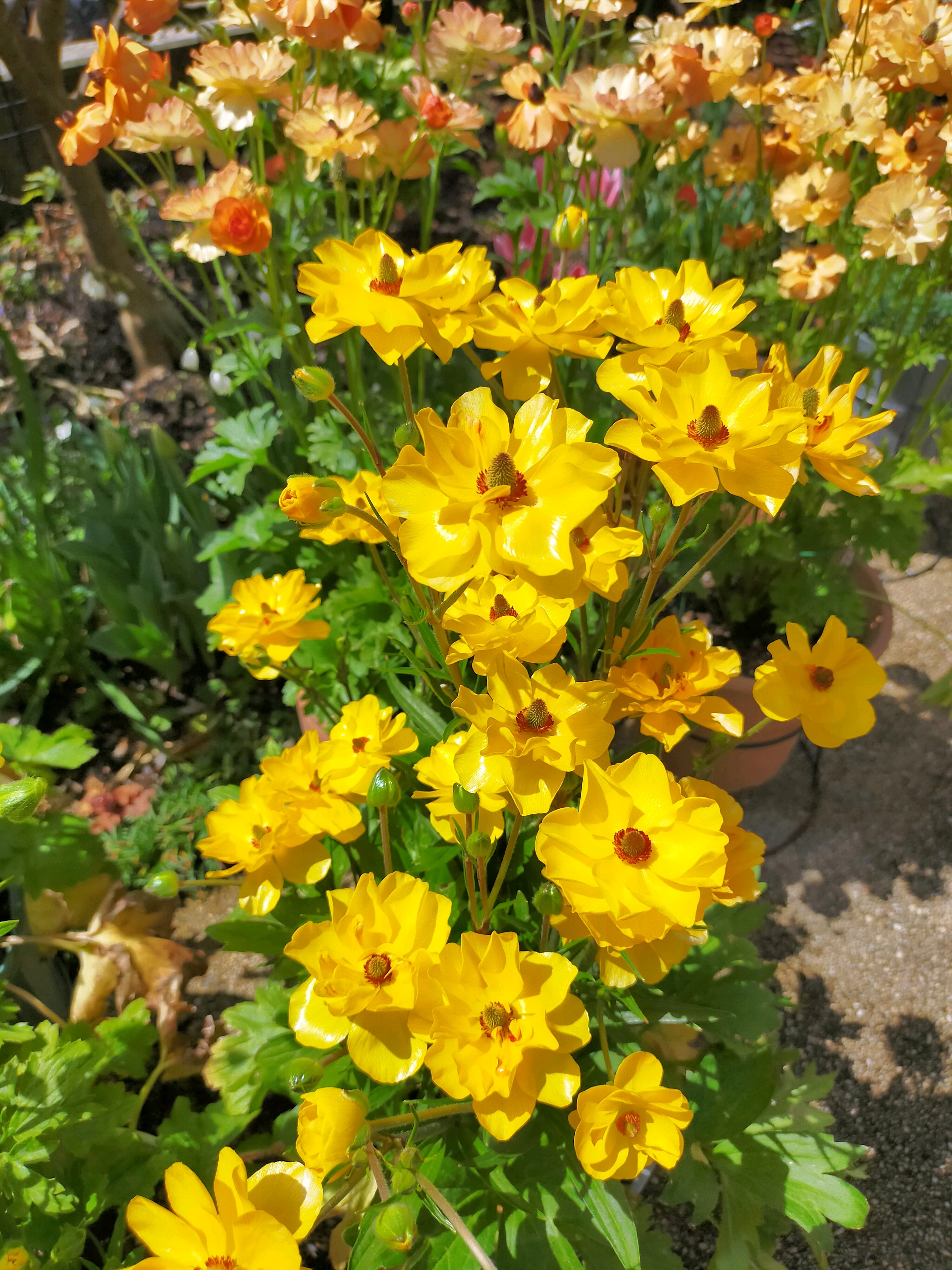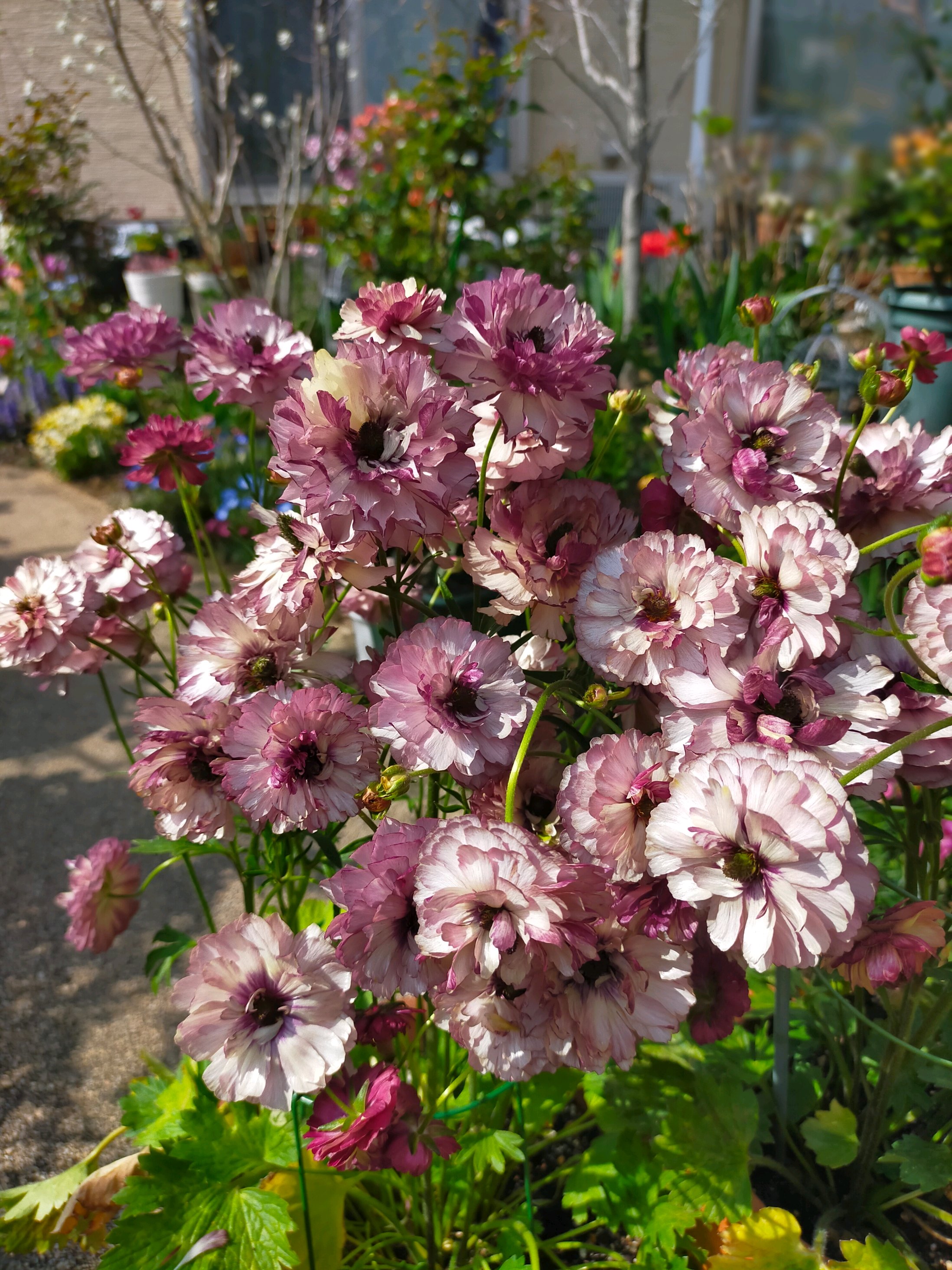 アプローチに集合してるラナンキュラスちゃんたちは、まるでお花屋さんデス😃