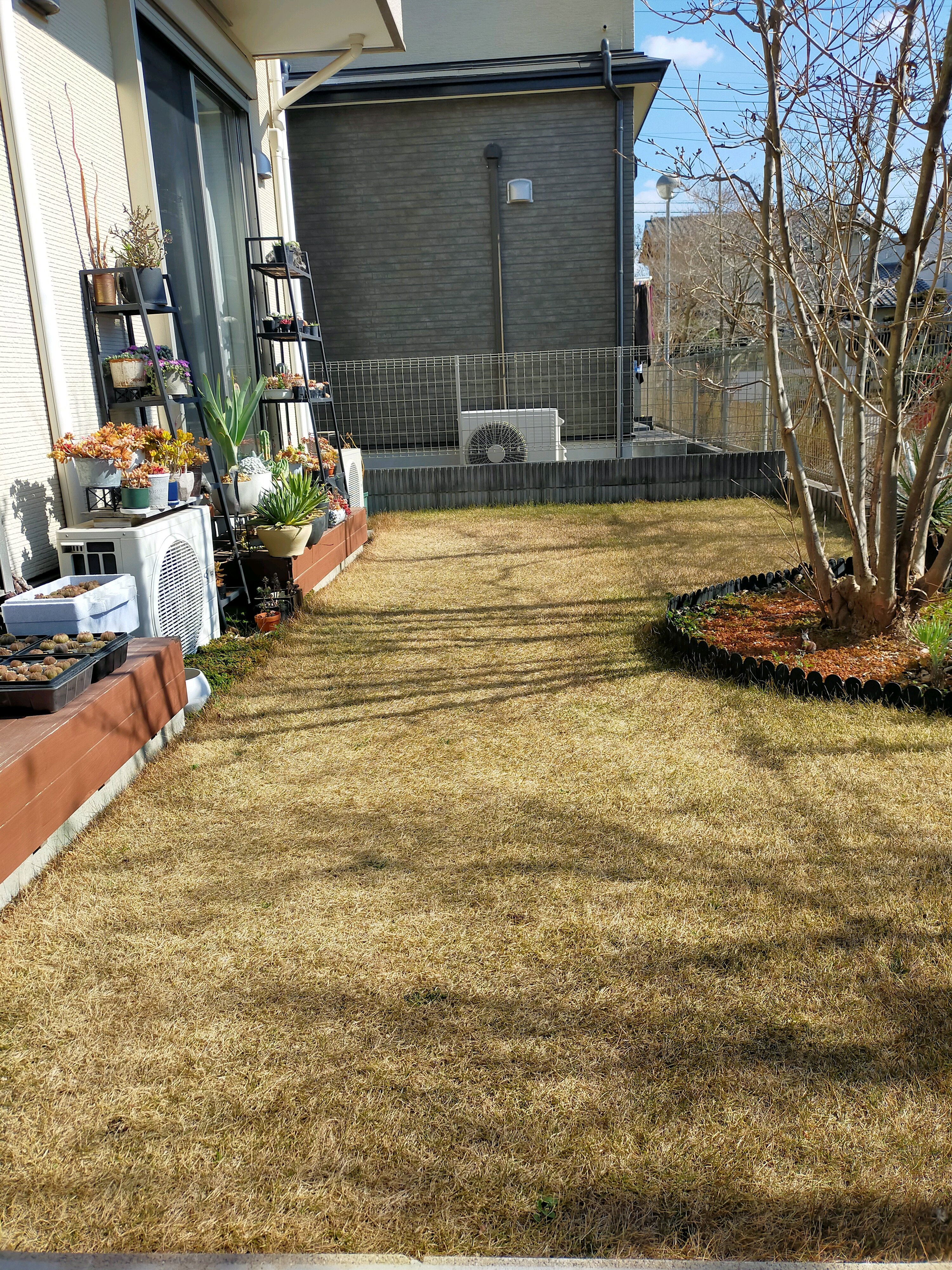 薄っすら雪が降りました。芝生は休眠中。時々雑草を抜いてます。