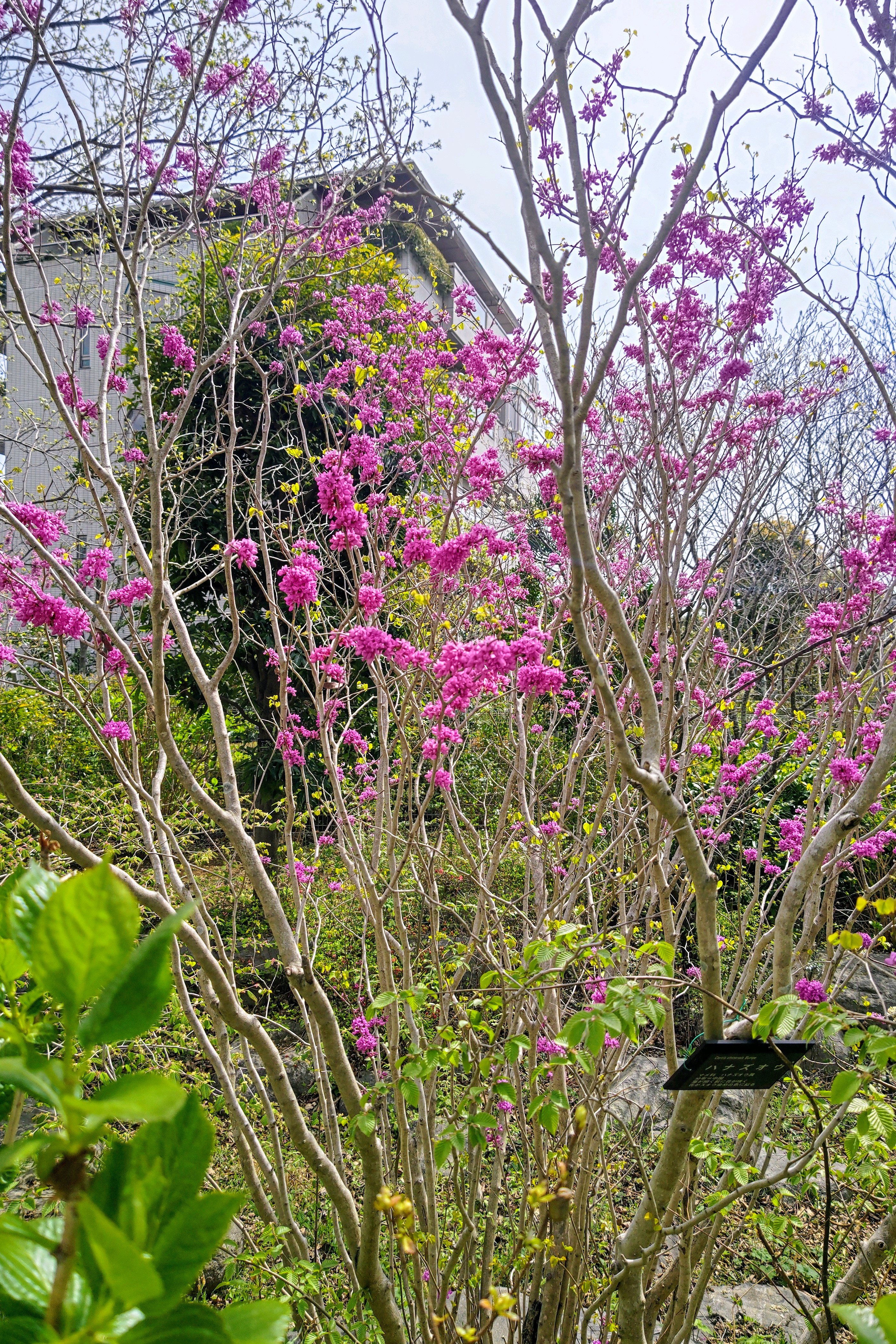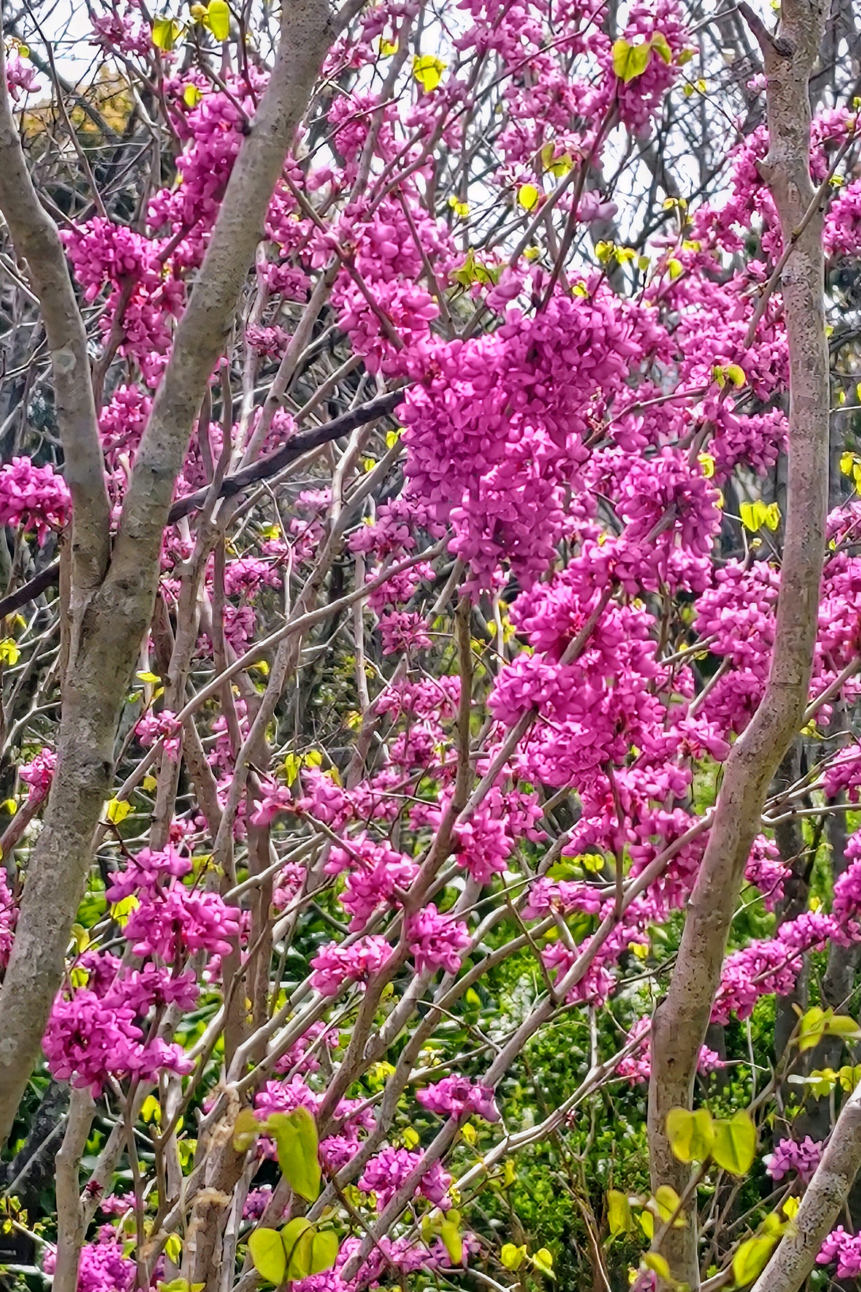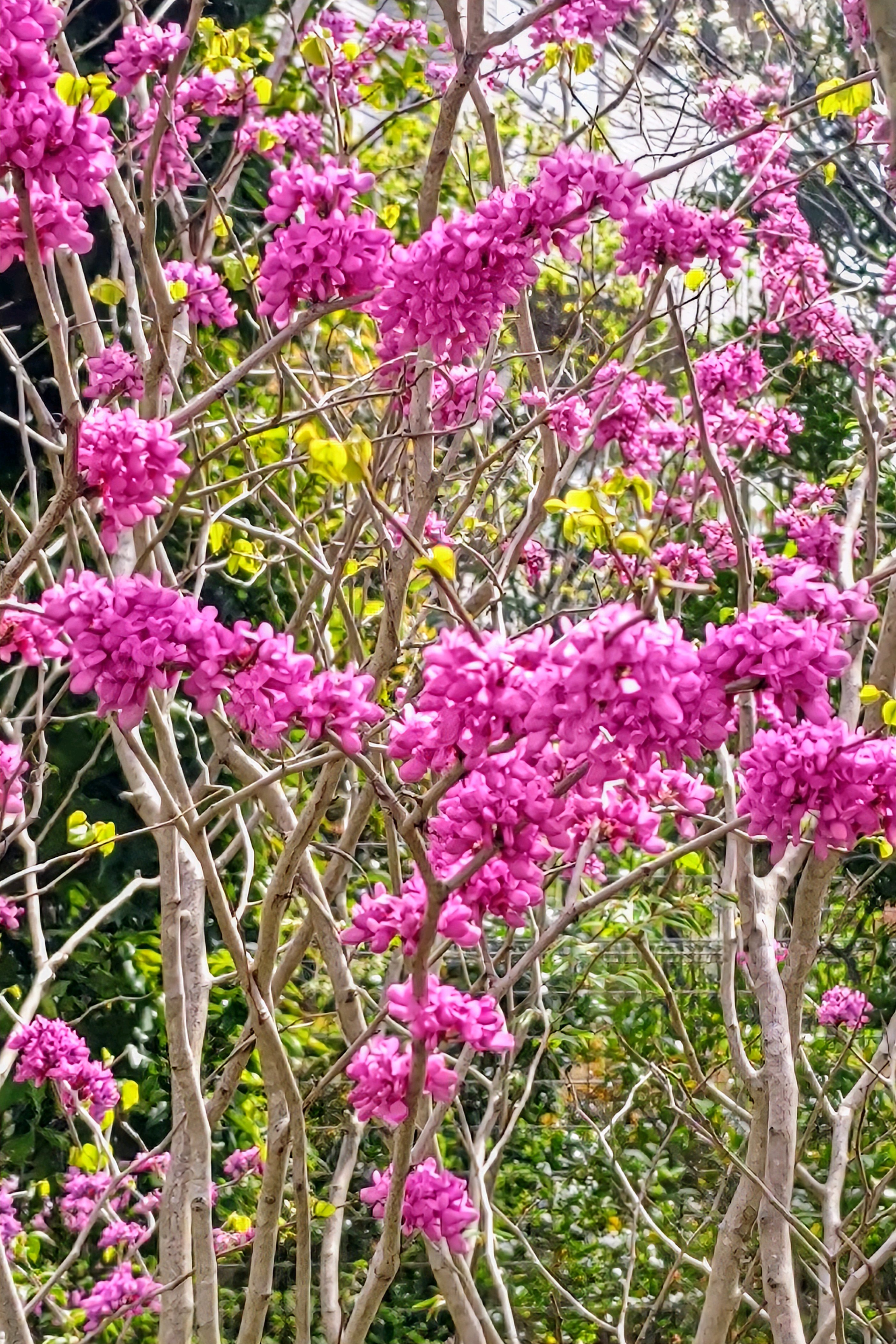 ハナズオウ、鮮やかな赤紫の花を付けて