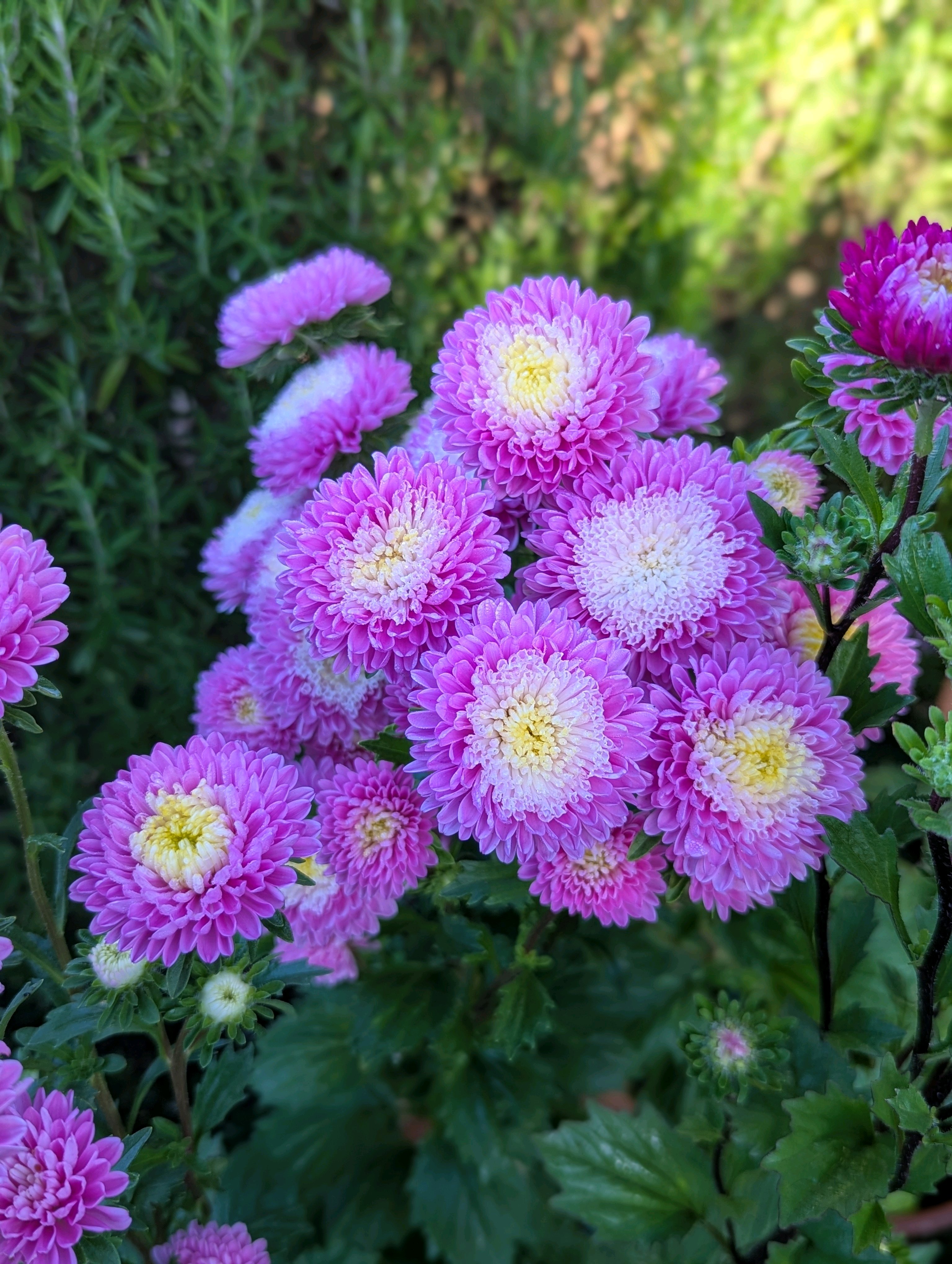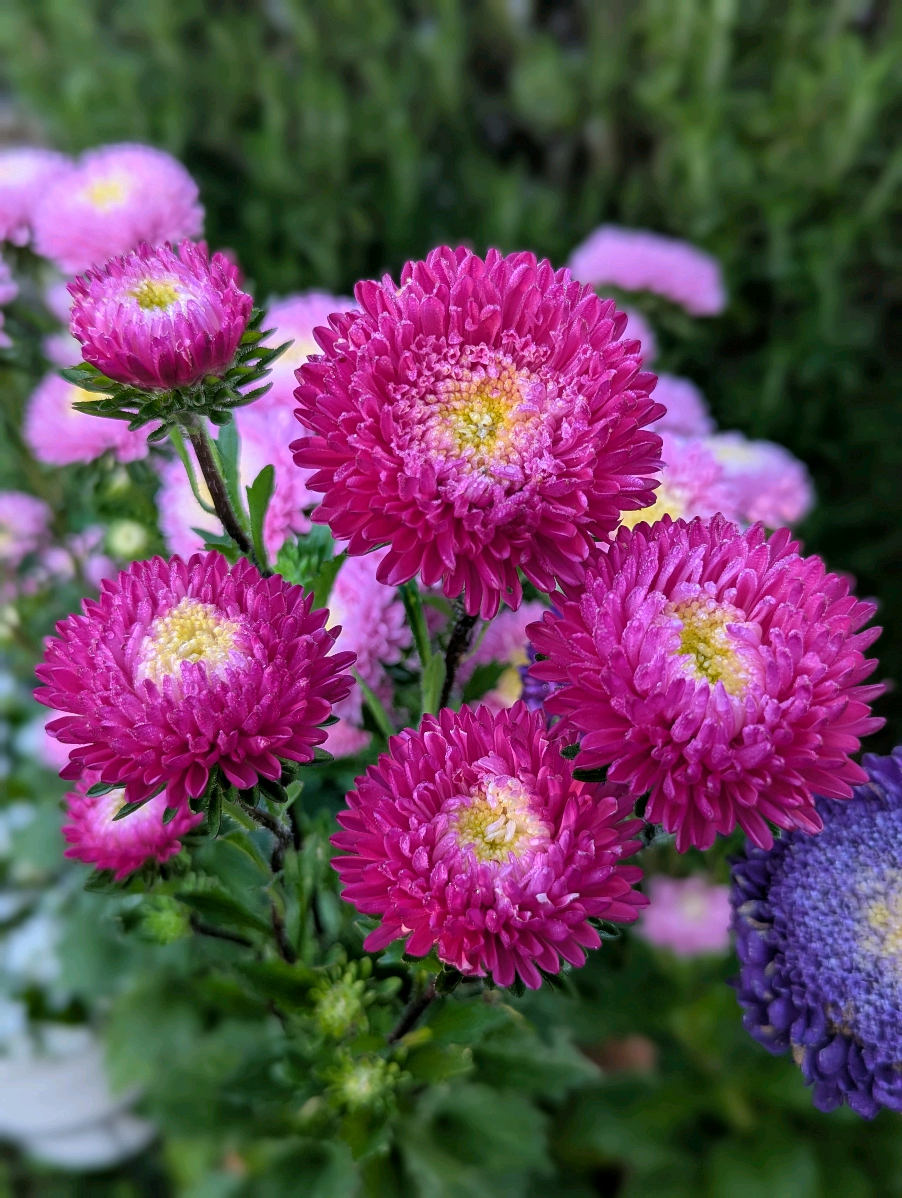 アスター『あずみXL』シリーズは、咲き進むと花がこんもりとした半球状になるポンポン咲きで、花径7~8cmになる大輪品種です