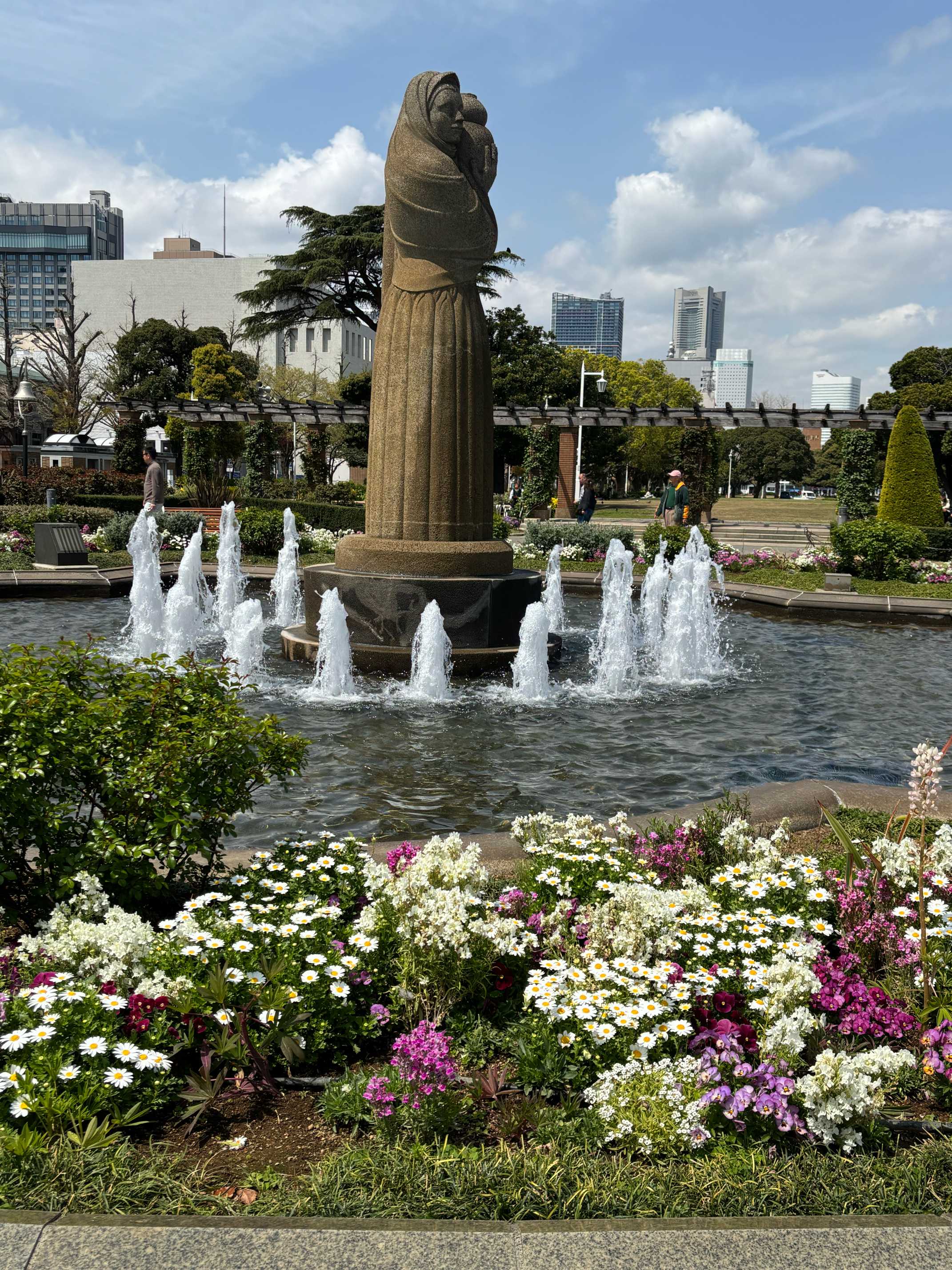 公園のほぼ中心にある像は、横浜と姉妹都市提携を結んだアメリカのサンディエゴ市から昭和35年(1960)に寄贈された。噴水の周りのベンチは、人々の憩いの場になっている。(ネットより)