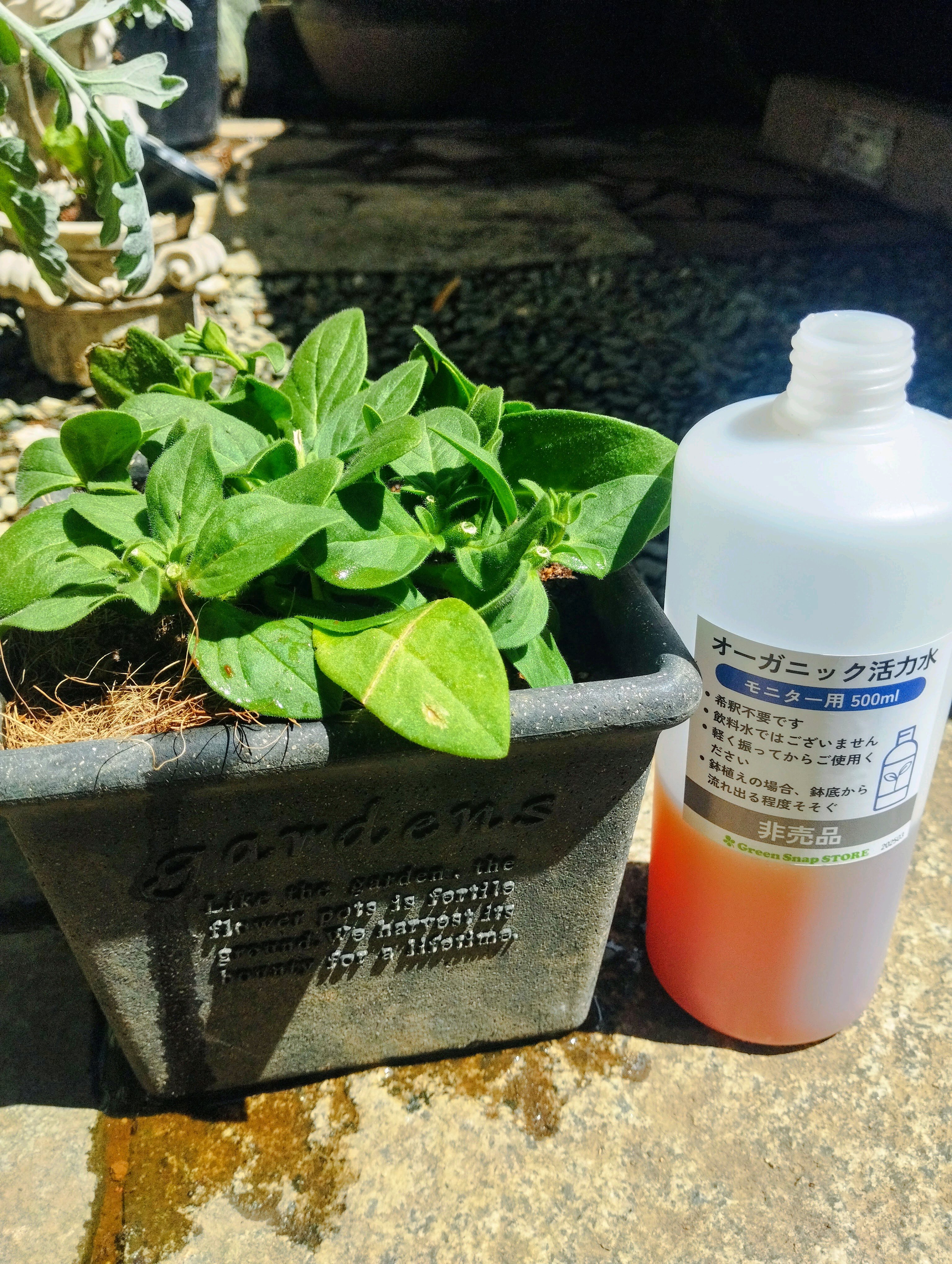 この活力水は希釈は不要で、そのまま直接根や土に鉢底から少し流れ出る程度に与えるとの事ですが500mlなので小さなポット苗でないと1回目で使いきってしまいそうなので野菜の苗(ミニトマトとバジル)とペチュニアの切戻した苗(小さい鉢)に使用したいと思います🪴