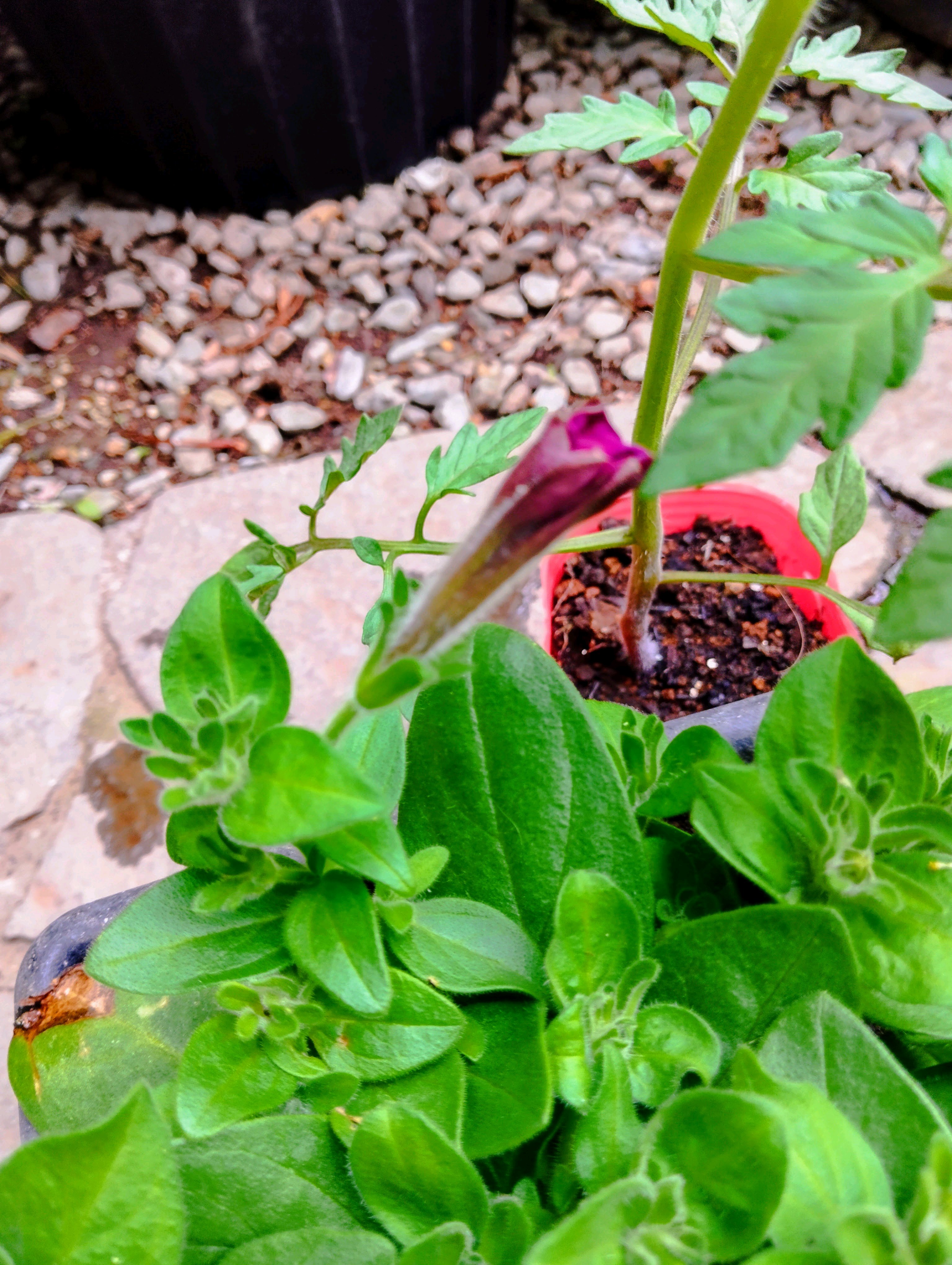 黒い鉢のペチュニアは活力水を与えて白い鉢は水やりのみです。