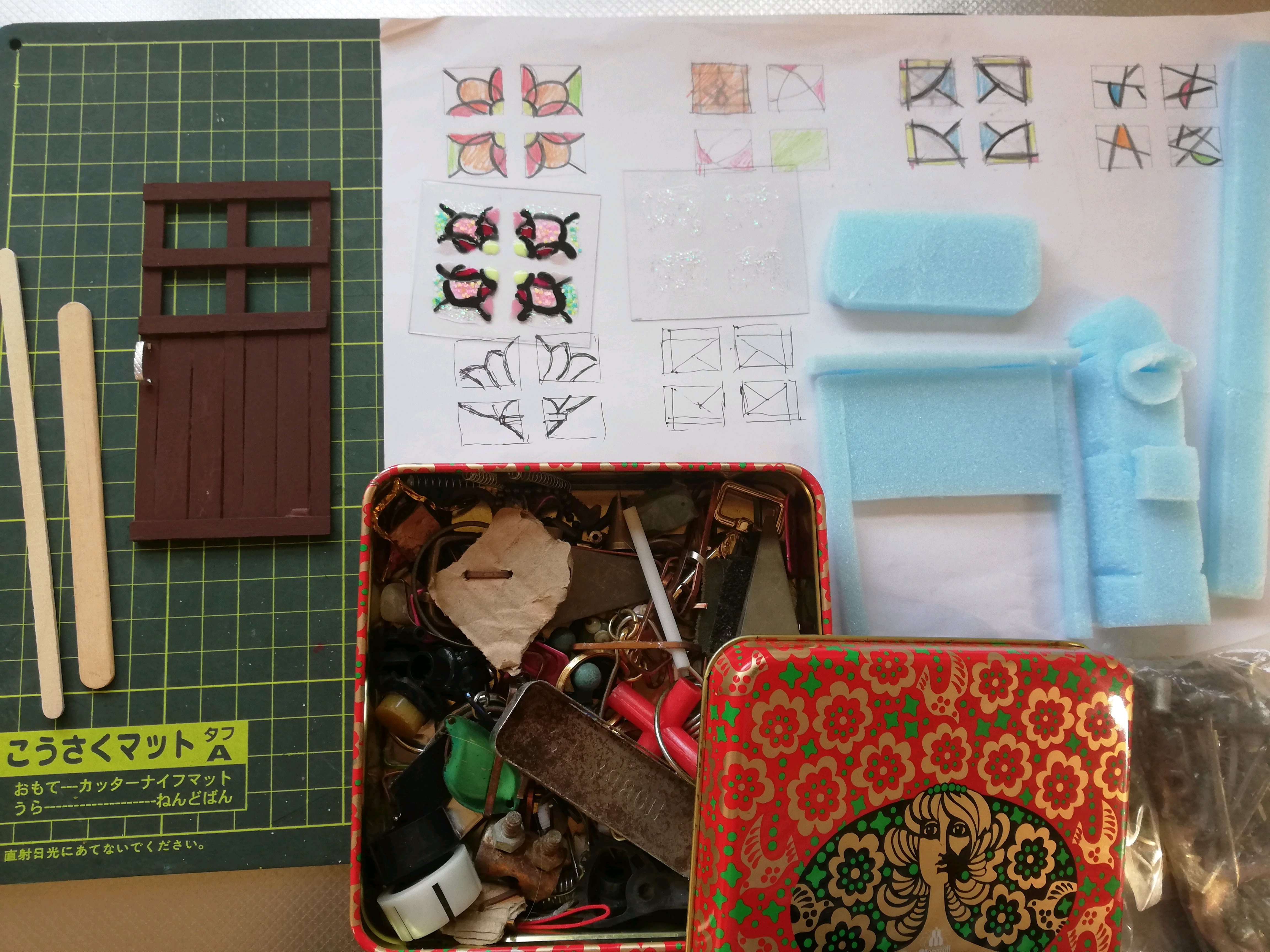 小さなクッキー缶の中に日頃から 棄てられるような 物を 材料に使えるとちよこちよこいれて この中から使えるもの さがす😅🎶