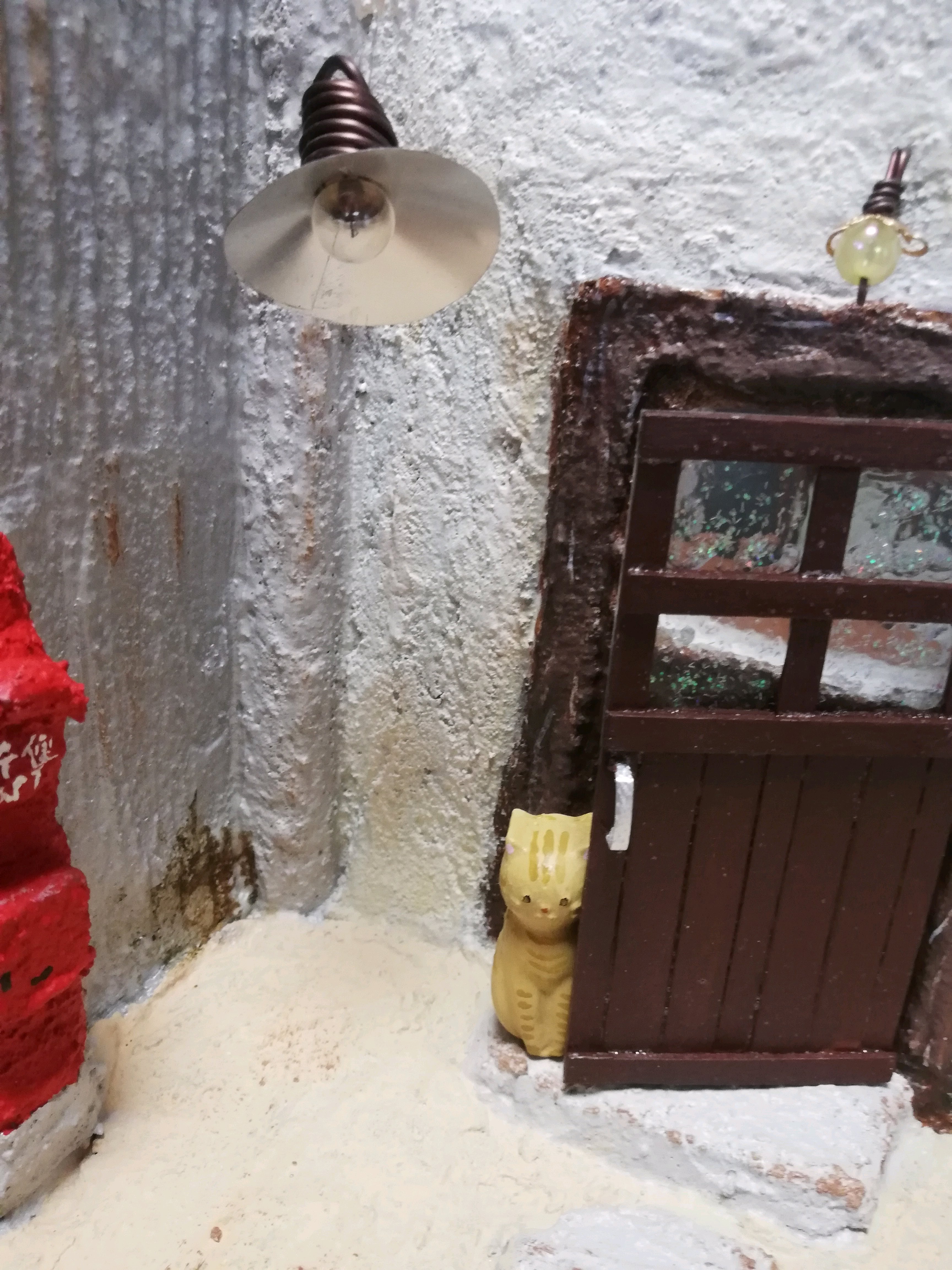 ドアノブは 廃材の小さなホッチキス金具(前ページ写真クッキー缶の中の段ボール切れっぱしについてるホッチキス針)