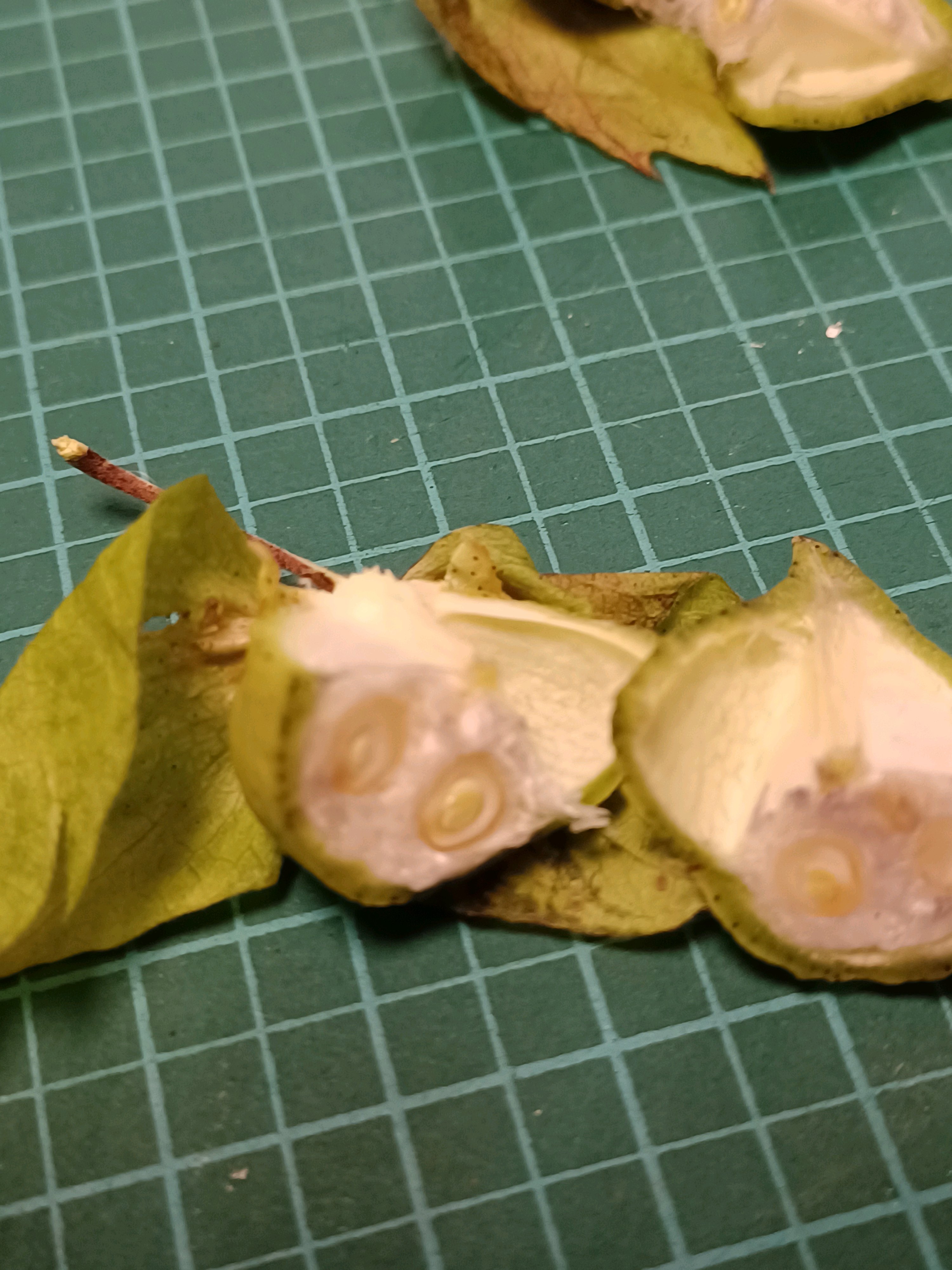 ひとつの房の中に、種は5~7個、1つの実に15~20個、入っています。結構種だらけ。