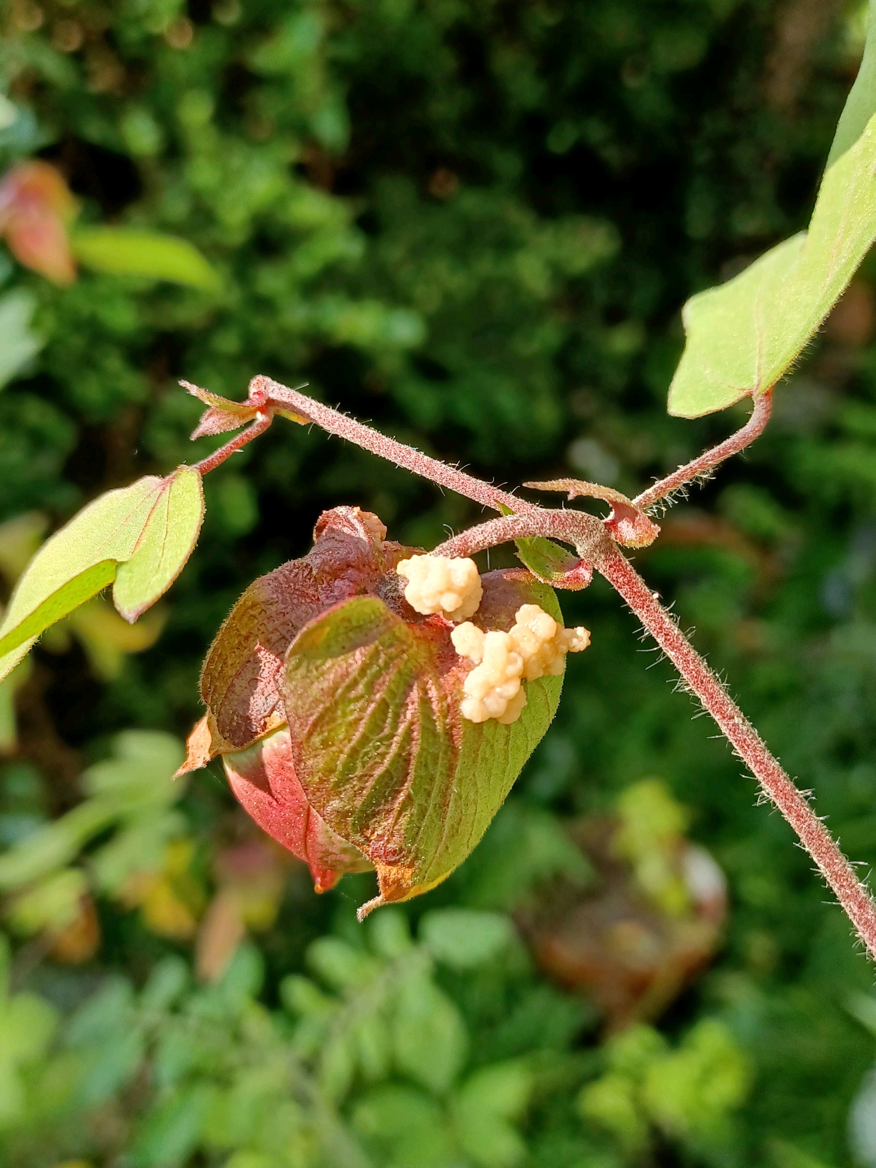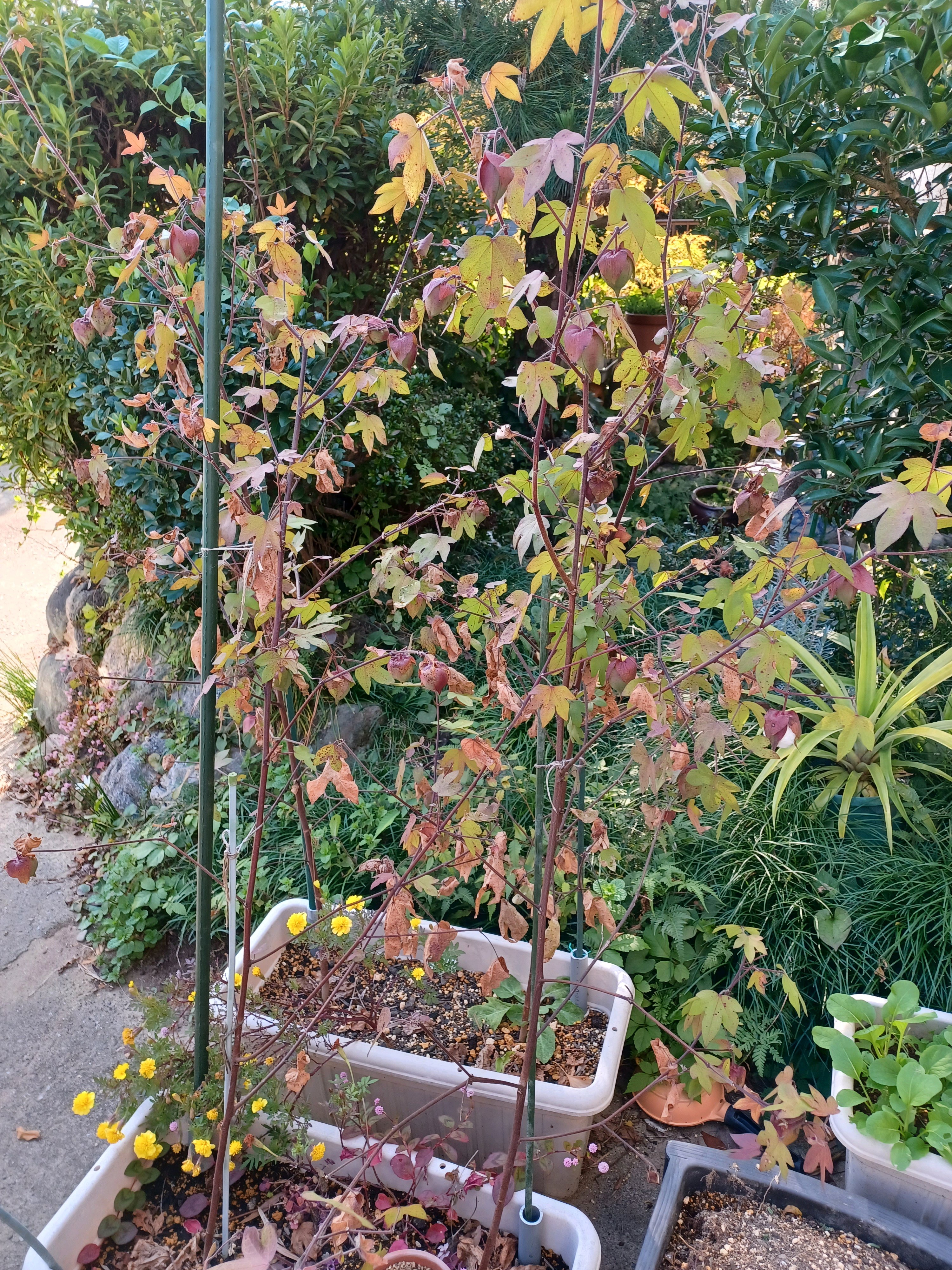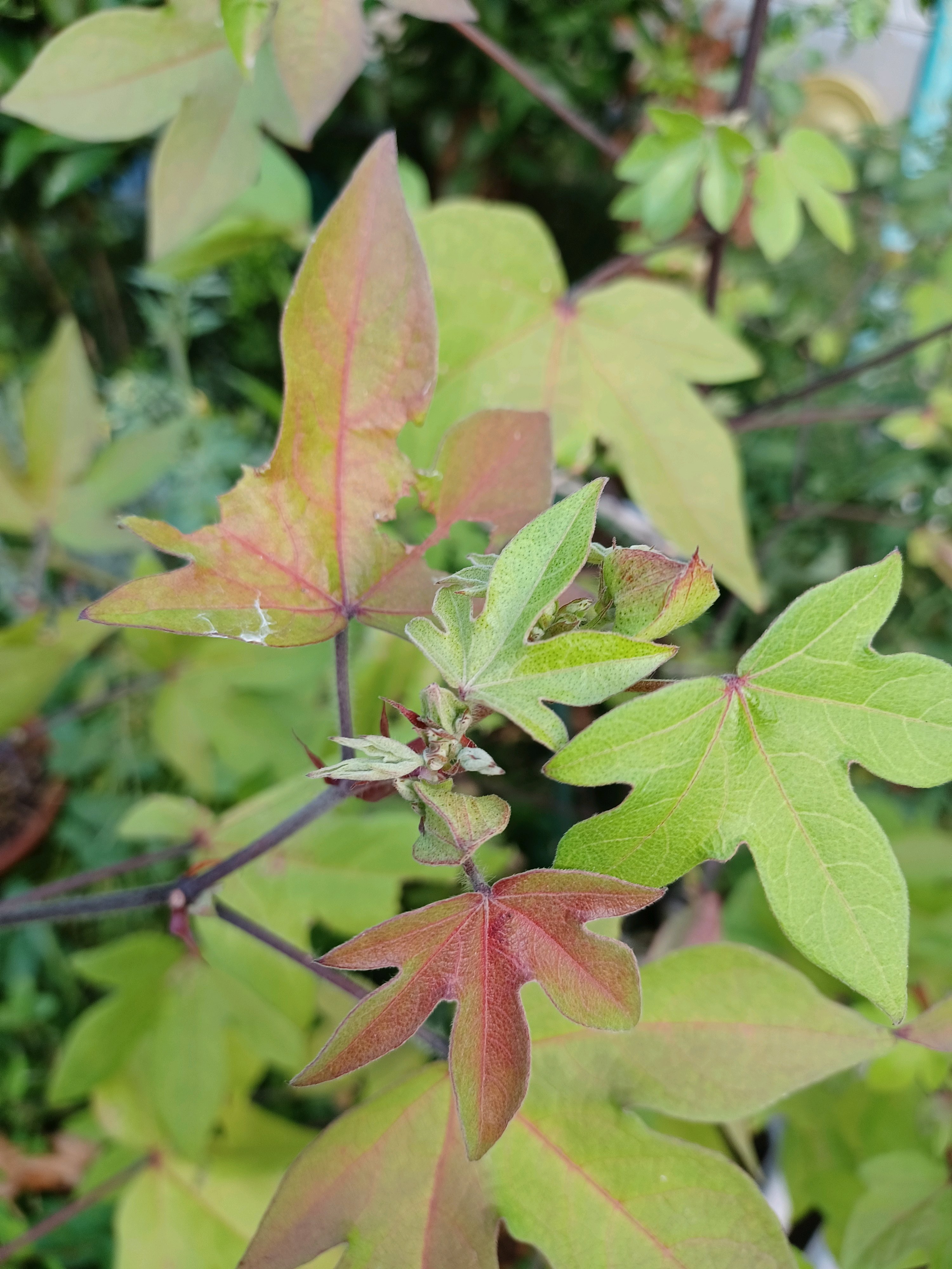 後から咲いた花の実が大きくなってきました。最近寒暖差が大きくなってきたせいか、紅葉のように赤くなっています