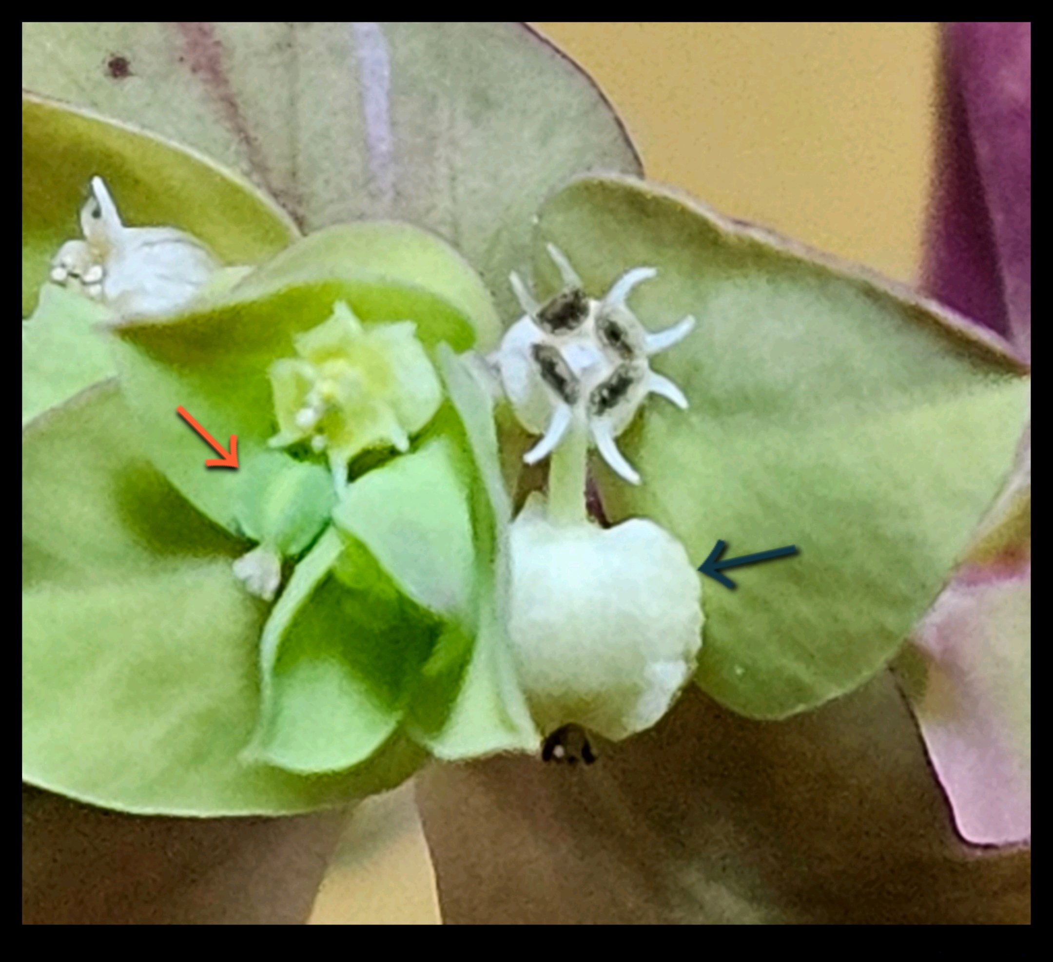 ·真ん中にポヨンと垂れ下がっているのが雌花 (蒴果) です