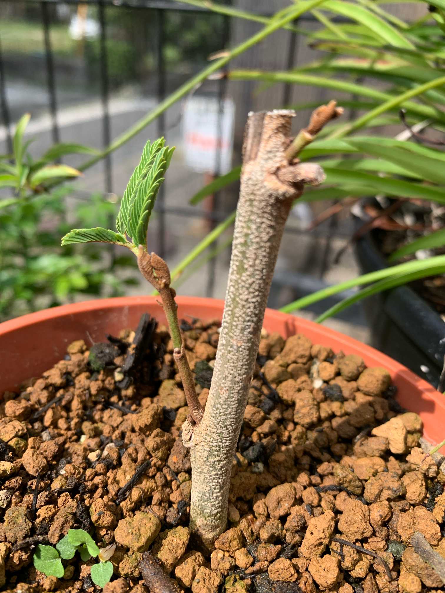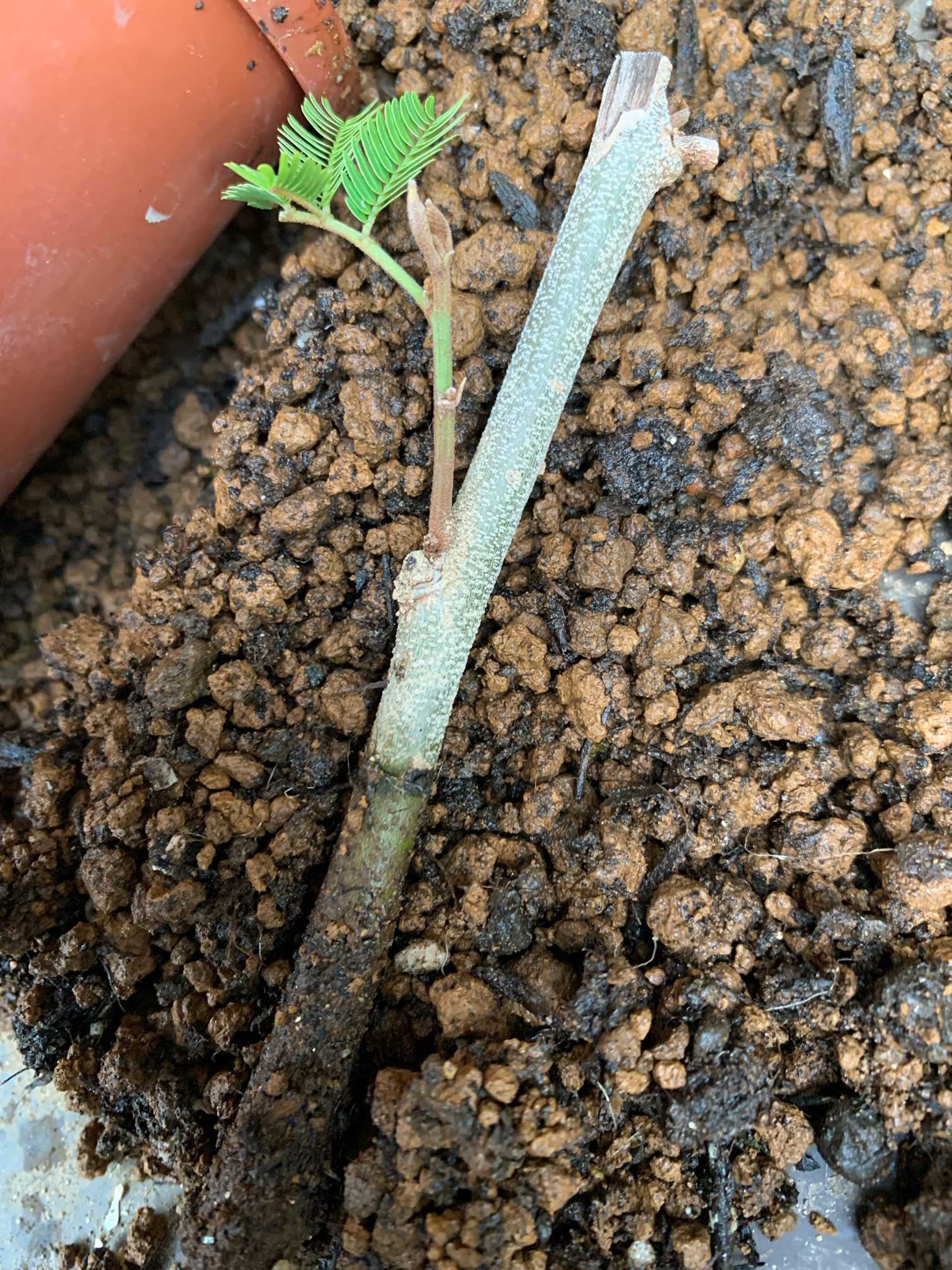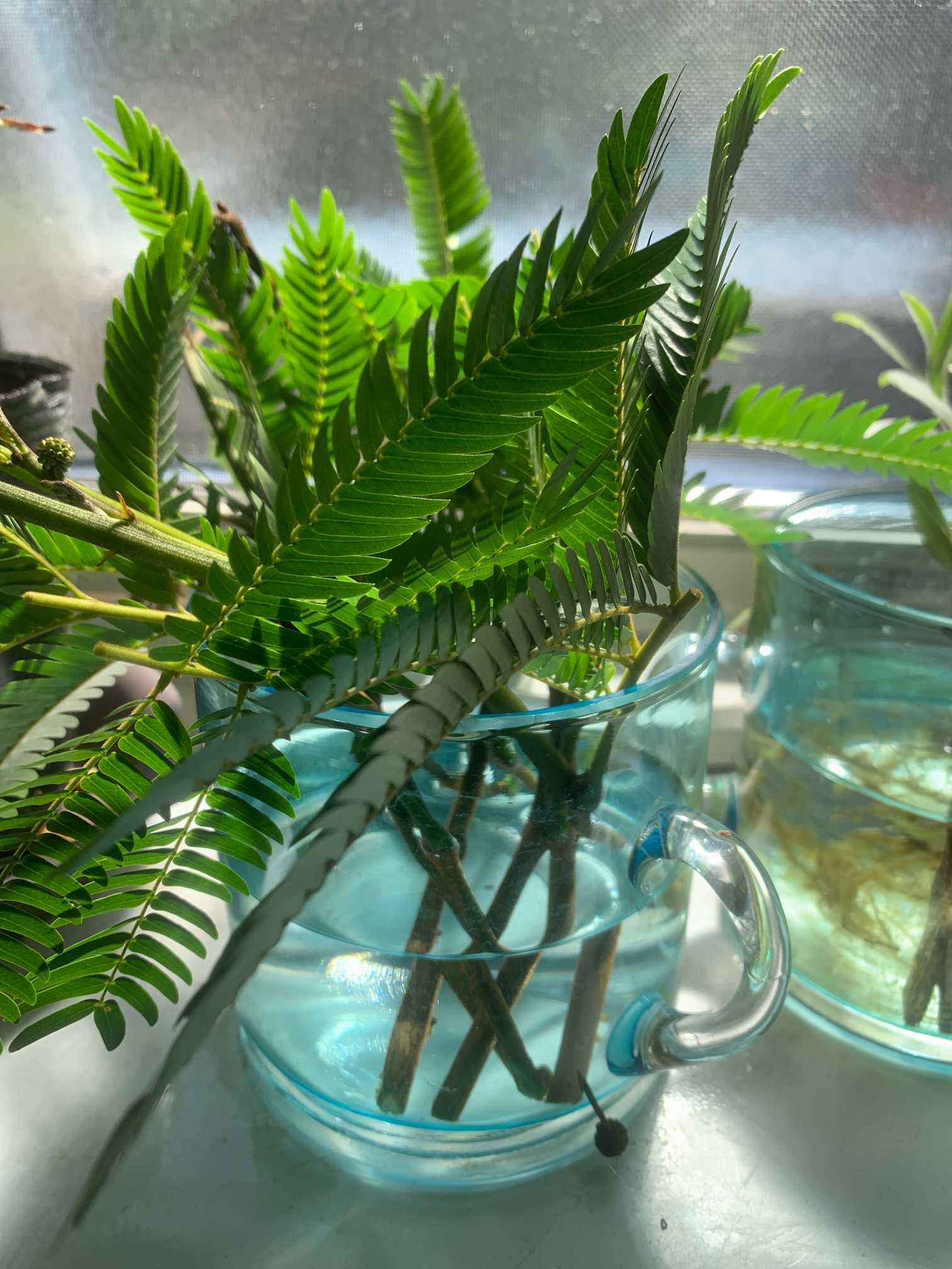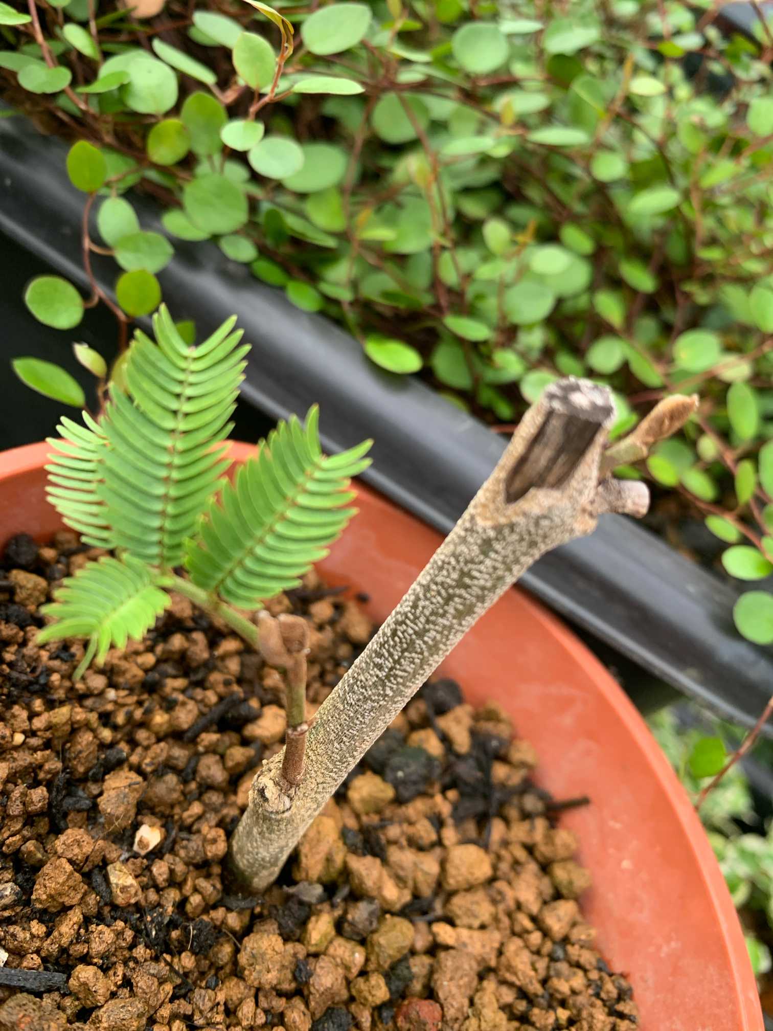 ワイヤープランツの挿し木に居候中のエバーフレッシュ…去年秋から他の水栽培に居候してた枝を5/20日頃から土に植えてました。