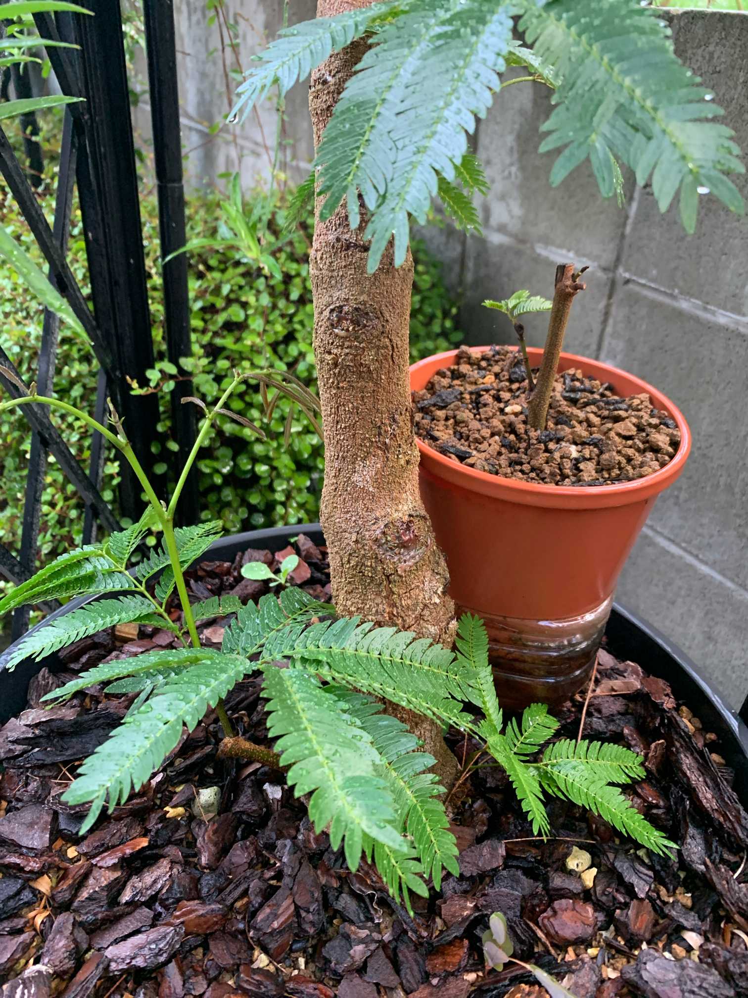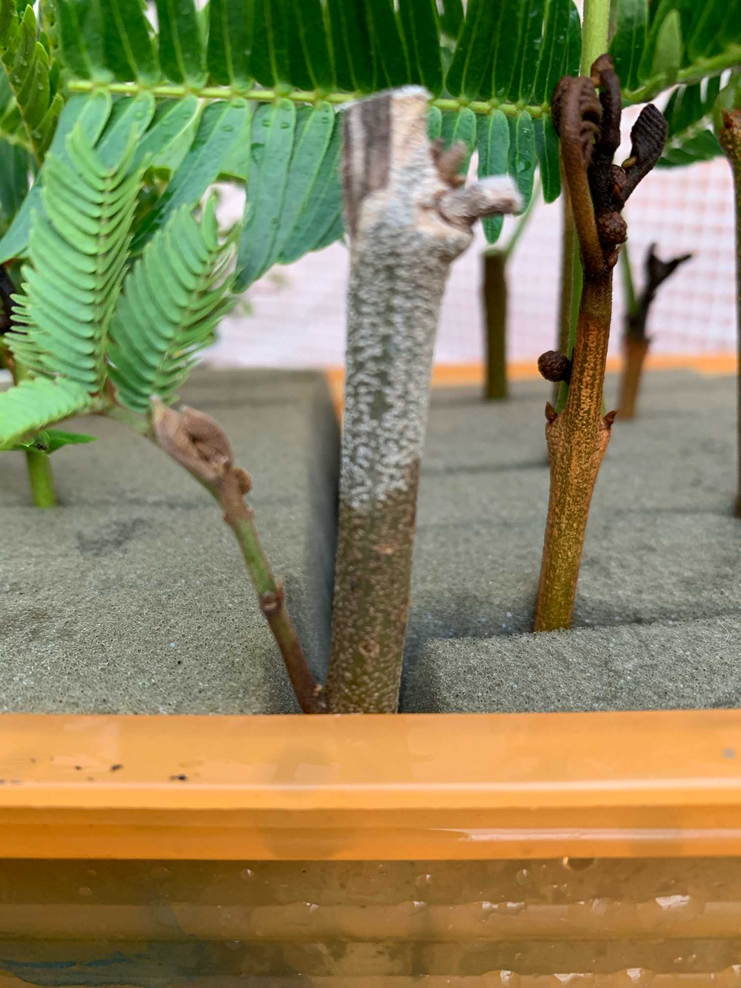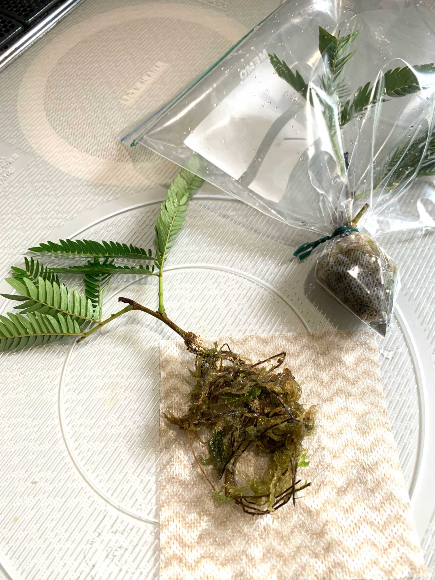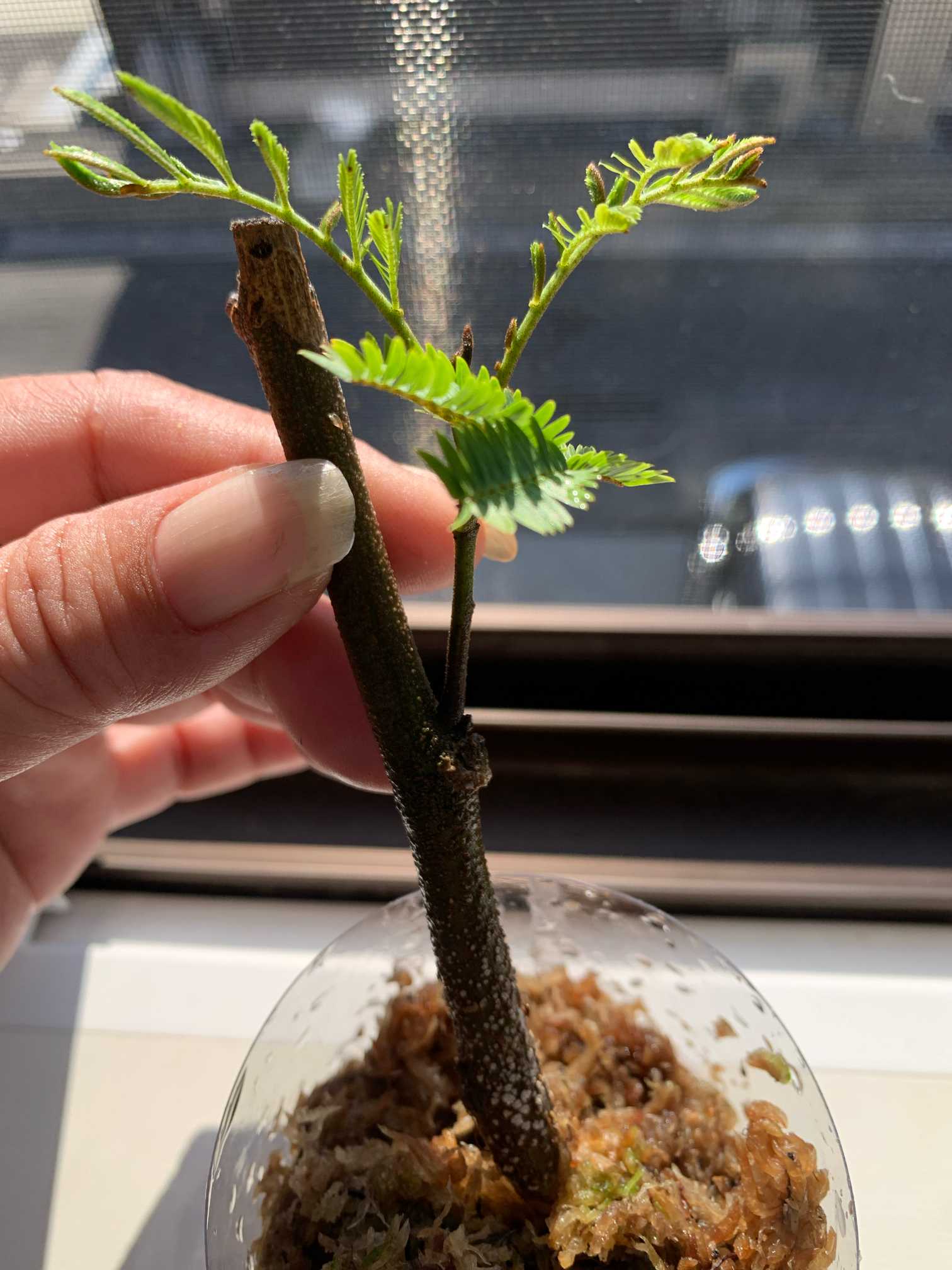 ワイヤープランツの挿し木に居候中のエバーフレッシュ…去年秋から他の水栽培に居候してた枝を5/20日頃から土に植えてました。
