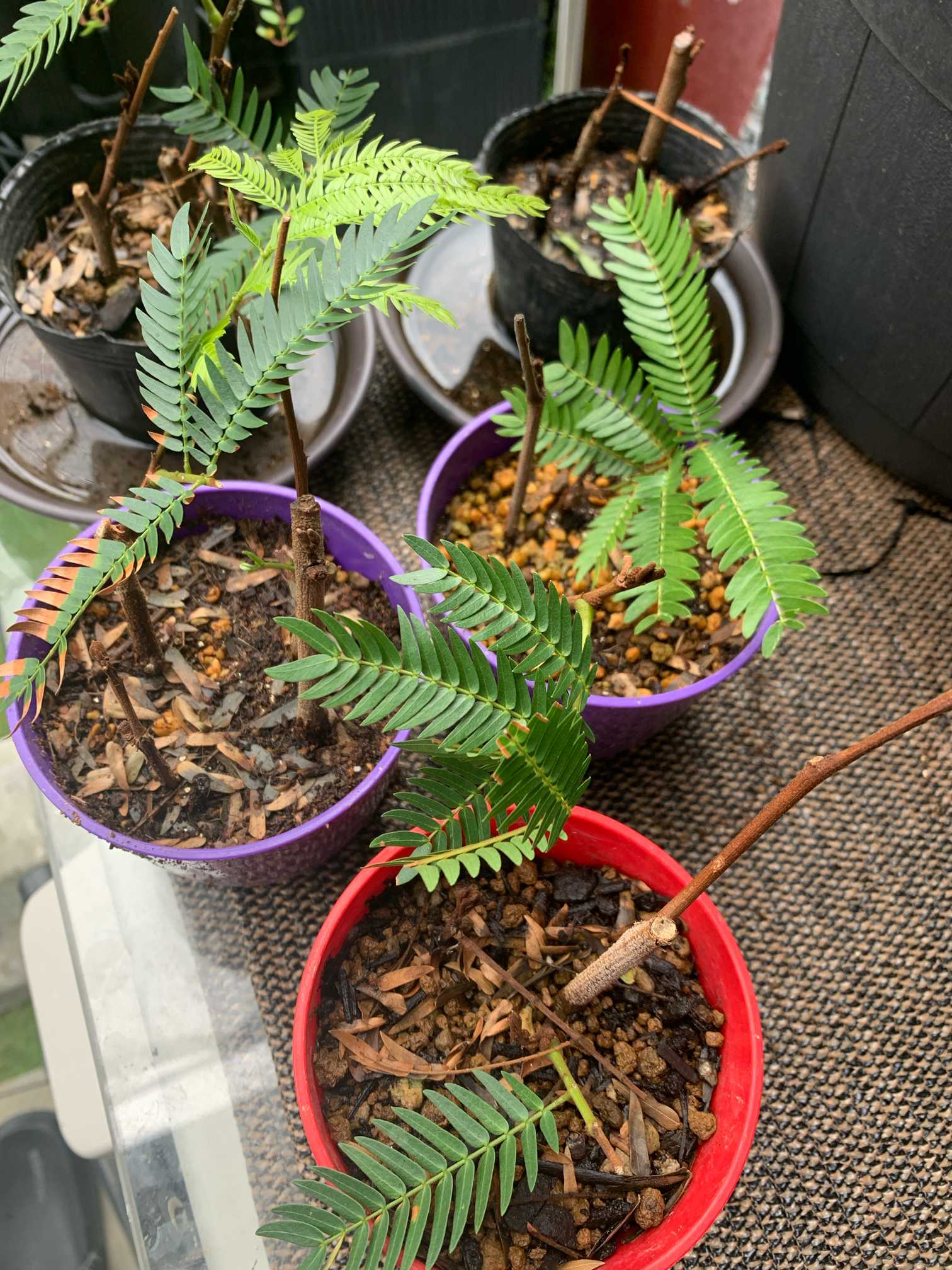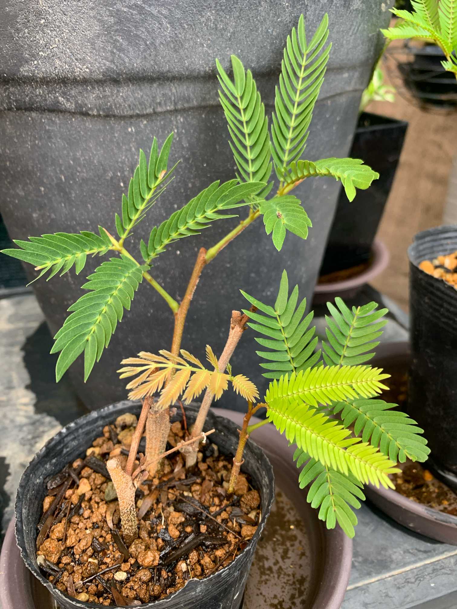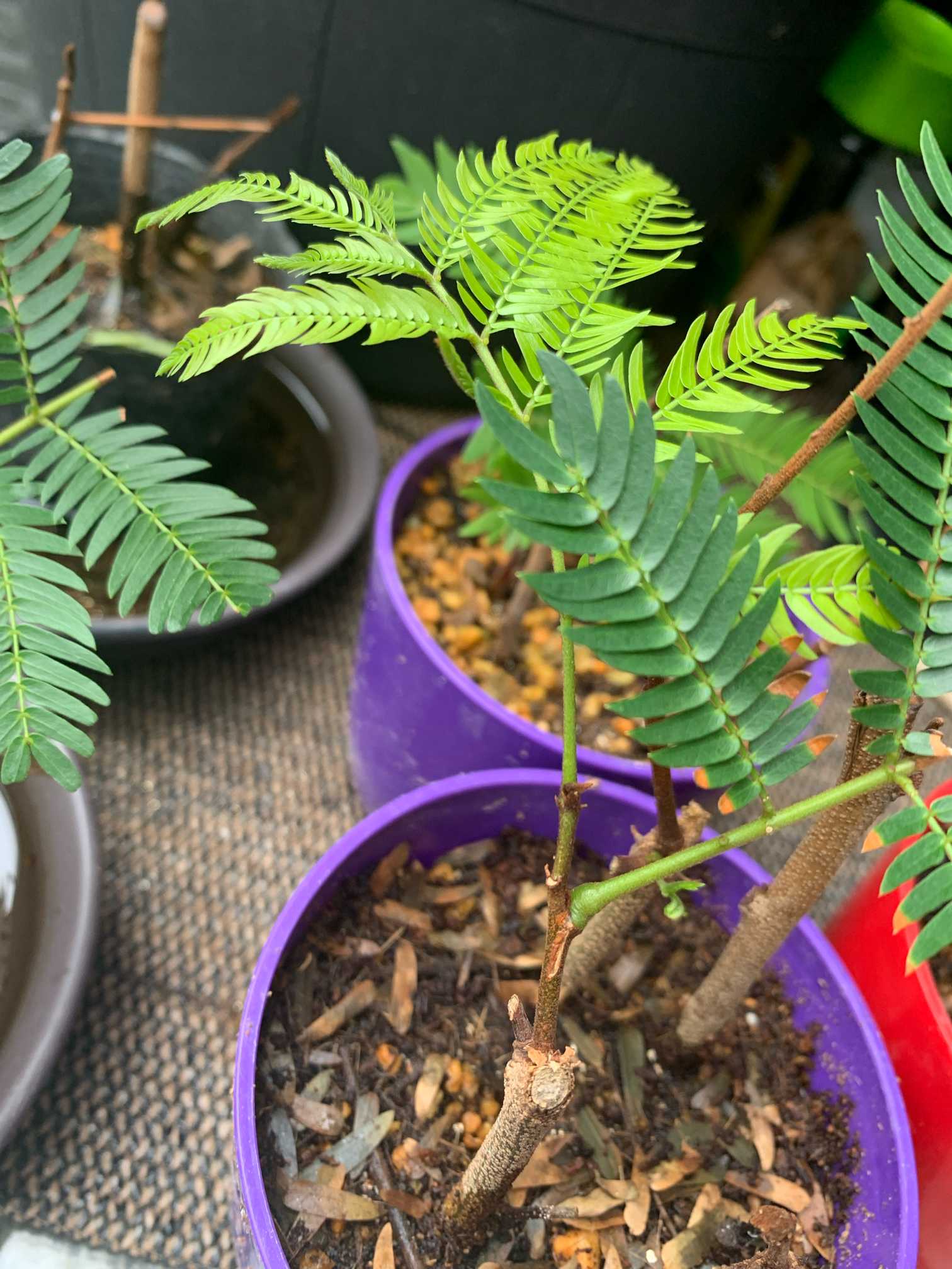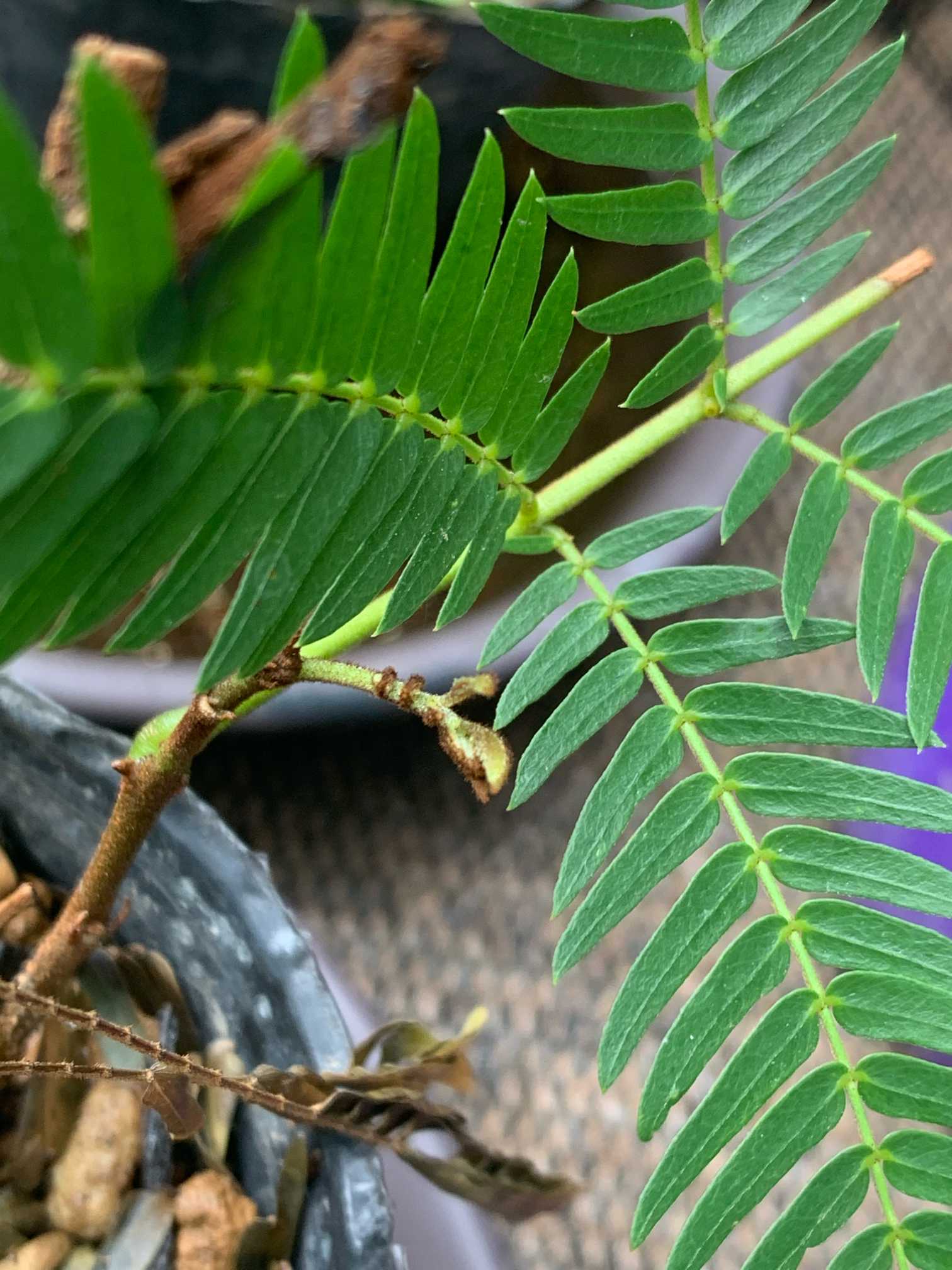 ワイヤープランツの挿し木に居候中のエバーフレッシュ…去年秋から他の水栽培に居候してた枝を5/20日頃から土に植えてました。