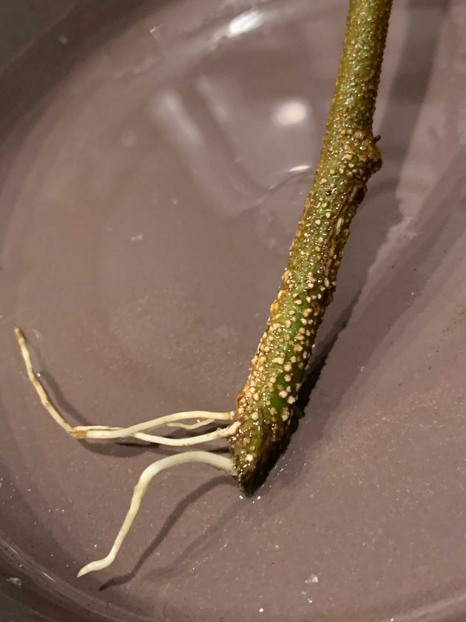 古い枝をエバフレの挿し木に居候させてたんだけど、白い点々が…