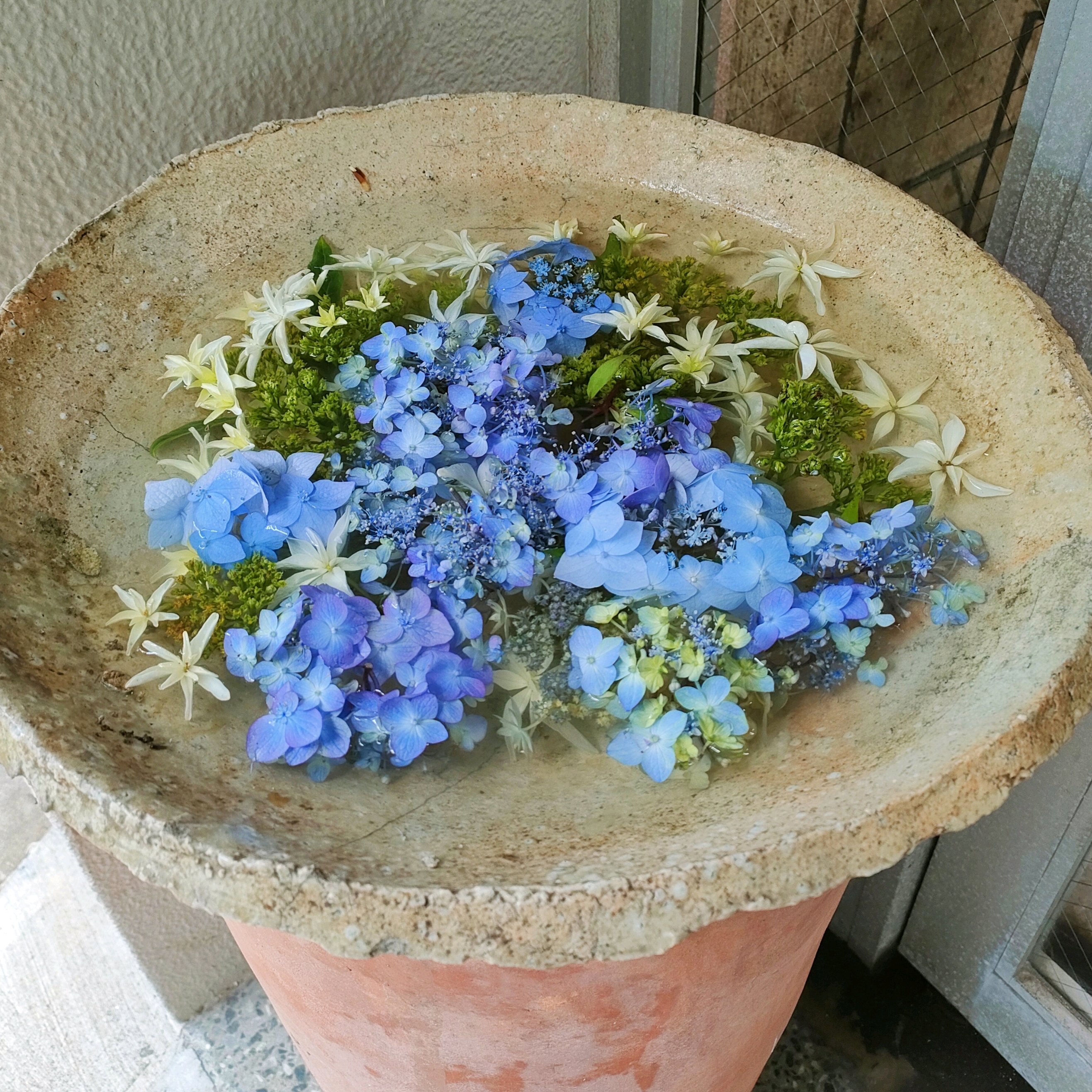 ブルーを主体にした涼しげでキリッとしたヤマアジサイの花手水がお出迎え〜💙