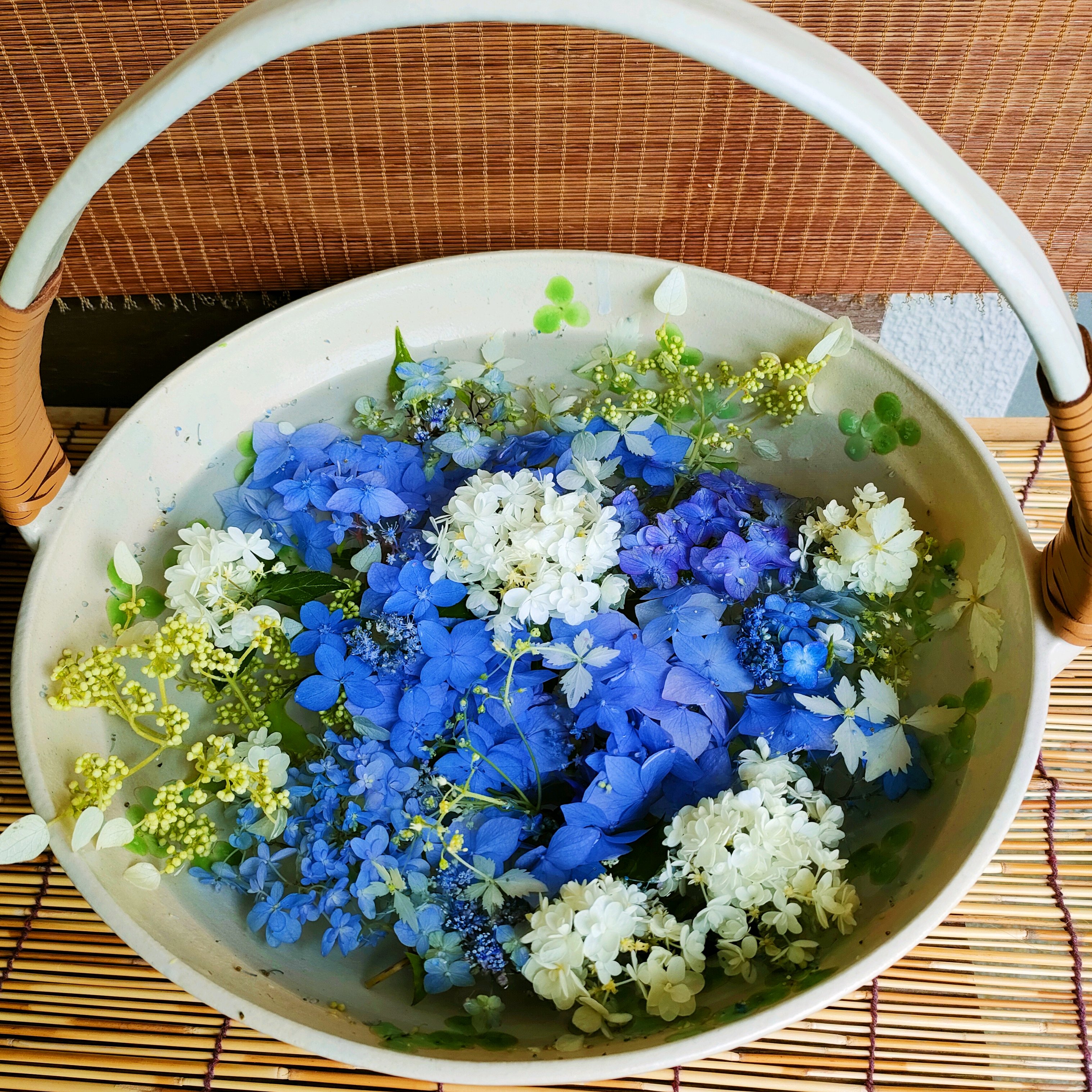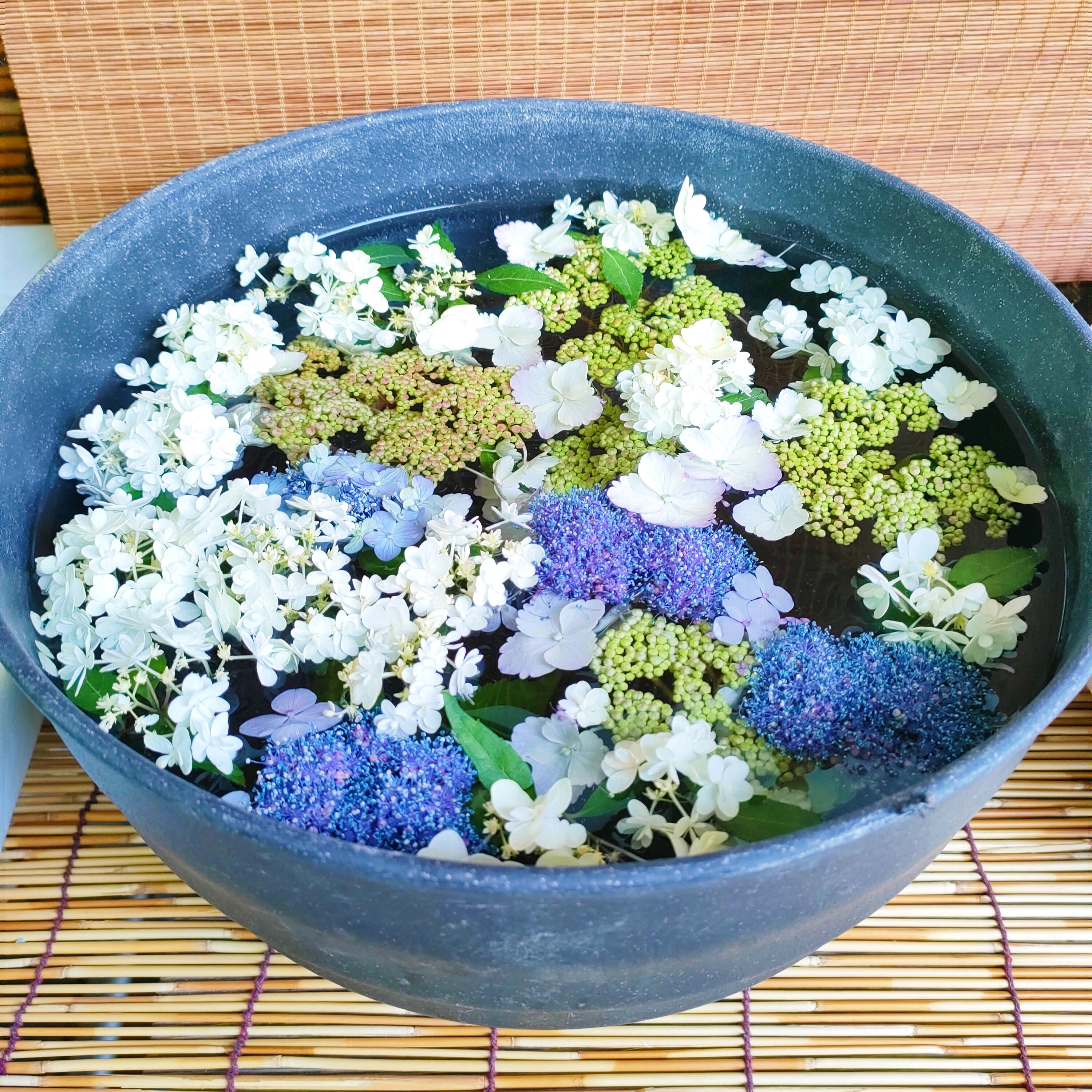 GSで花友になったばかりのMariakoさんの投稿で、ヤマアジサイの花手水の凛とした美しさに魅了されました💘