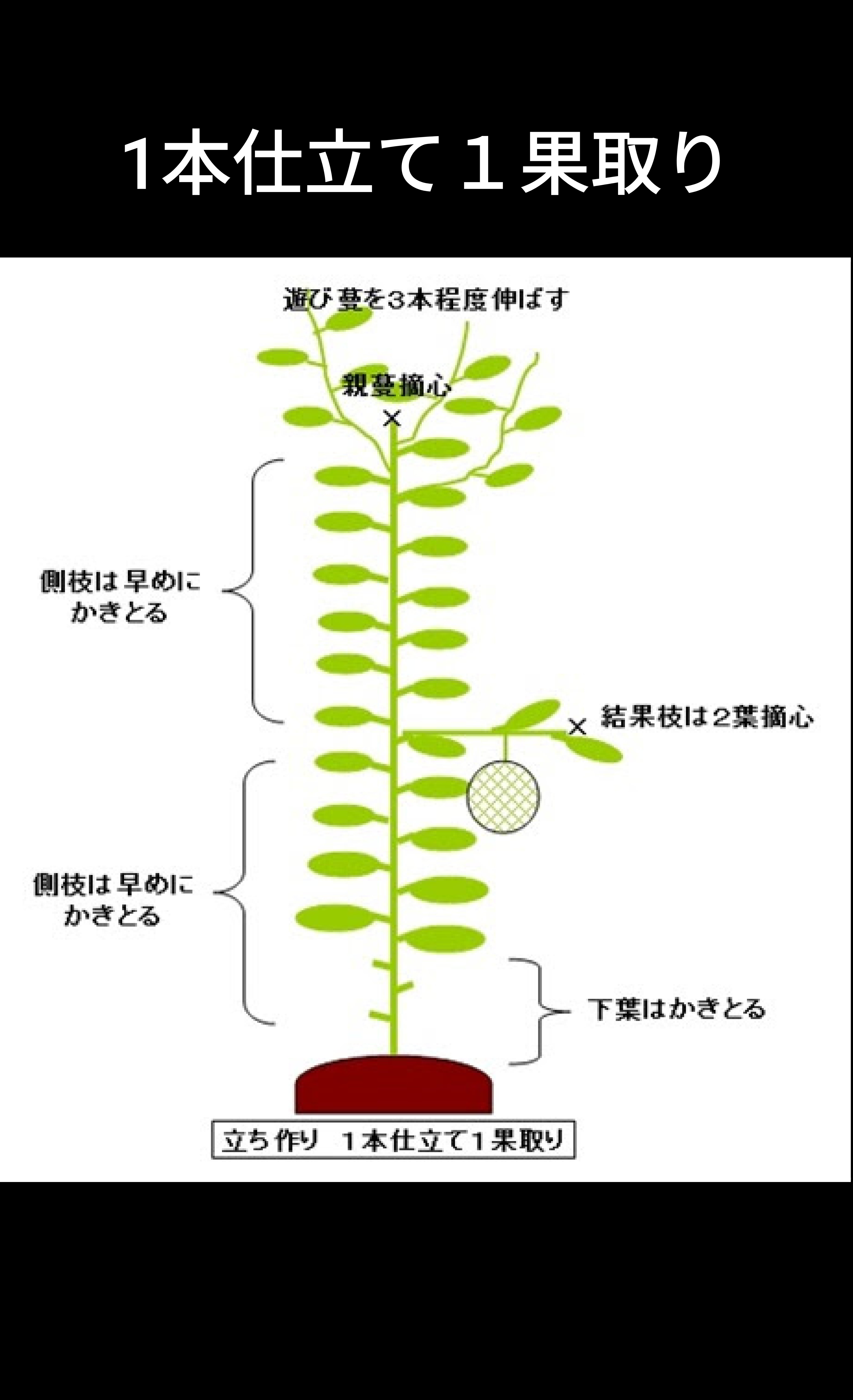 親づる一本仕立て:親づる以外の側枝は全て摘み取り、親づるに栄養を集中させます。