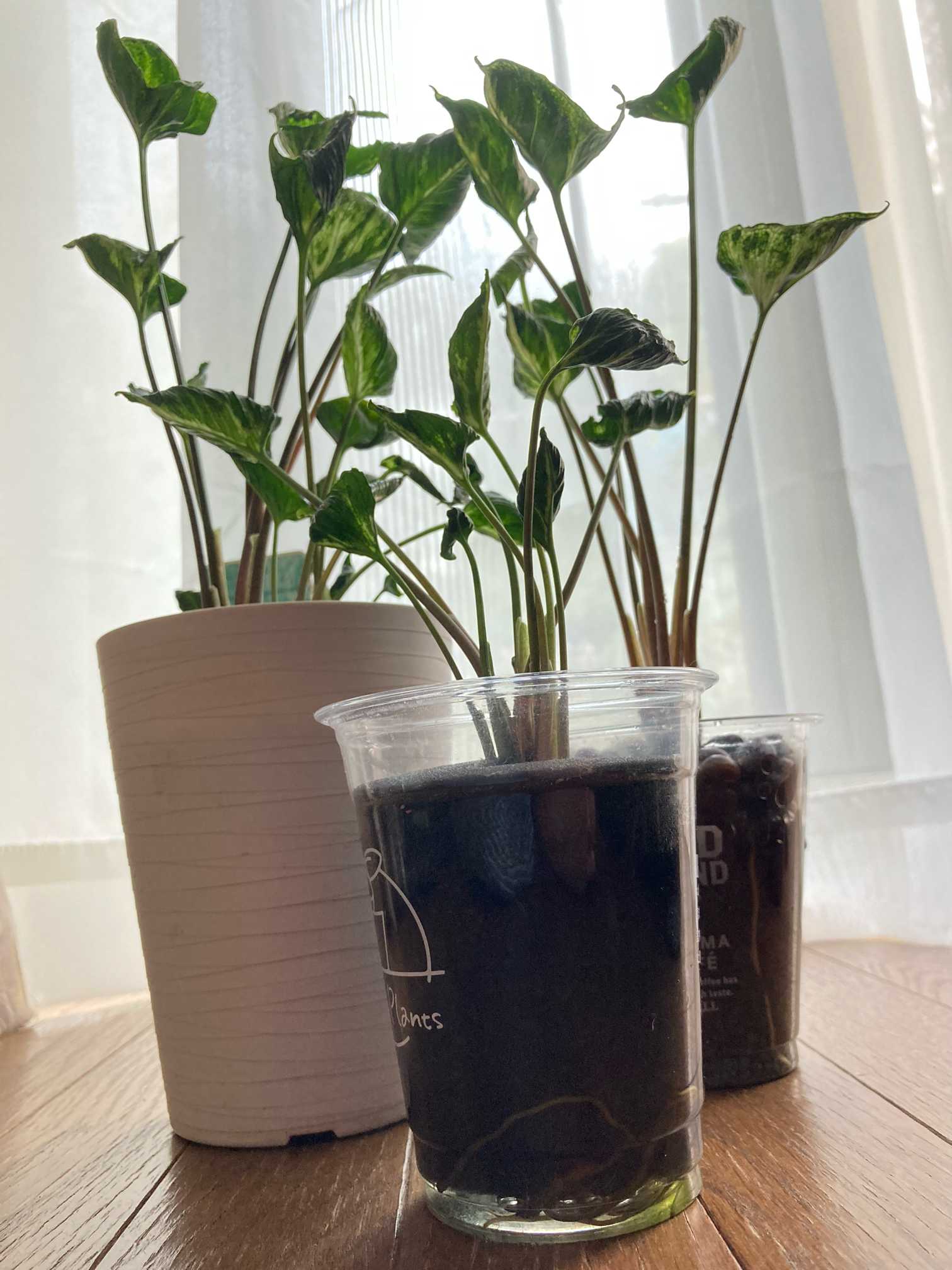 長い根を切らないように、絡まりを解きながら、3分割して、ひとつは水耕栽培にしてみました🚰💦