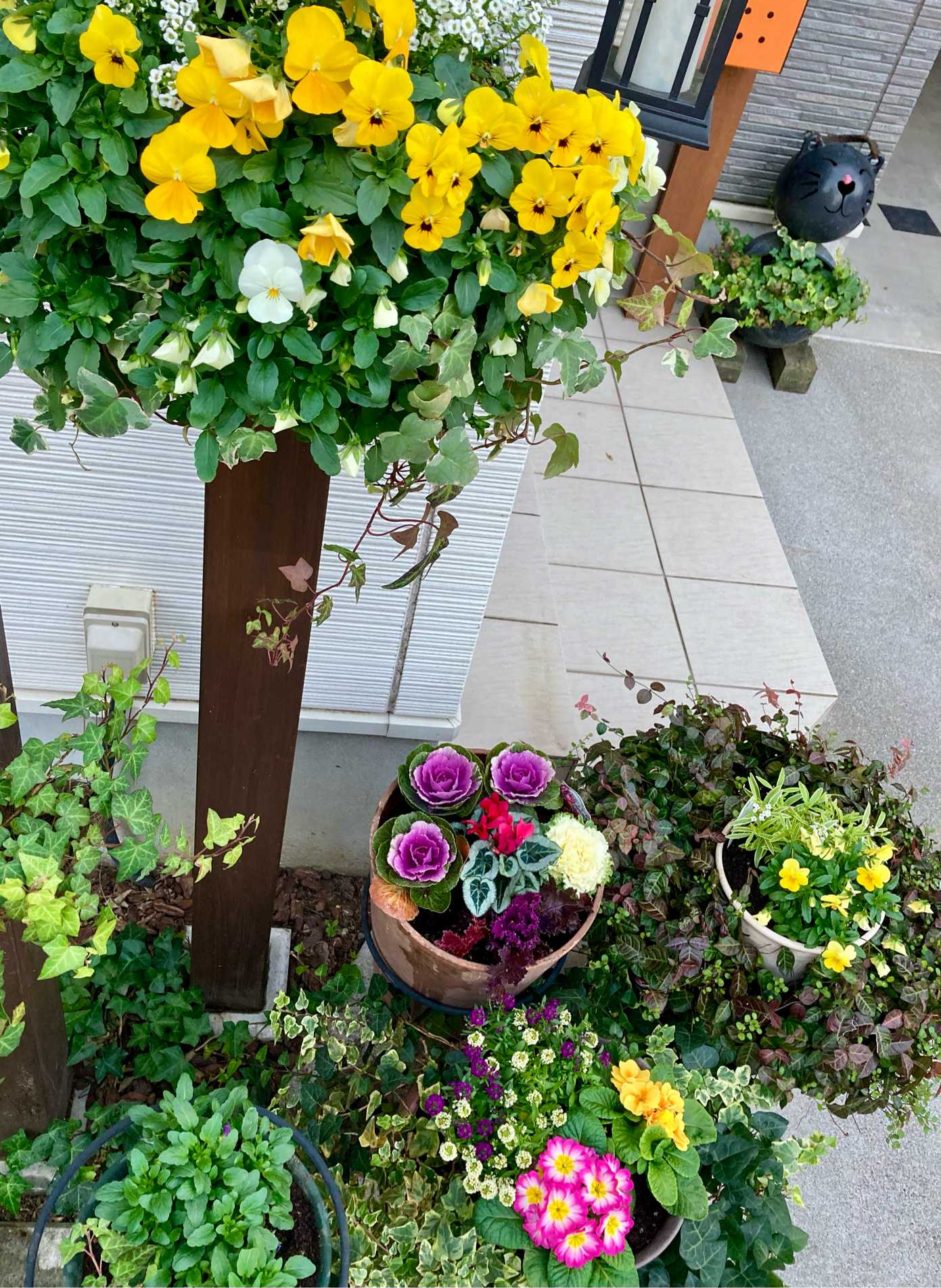 ハンギングバスケットは半年ぶりにビオラとアリッサムに植え替えました^_^