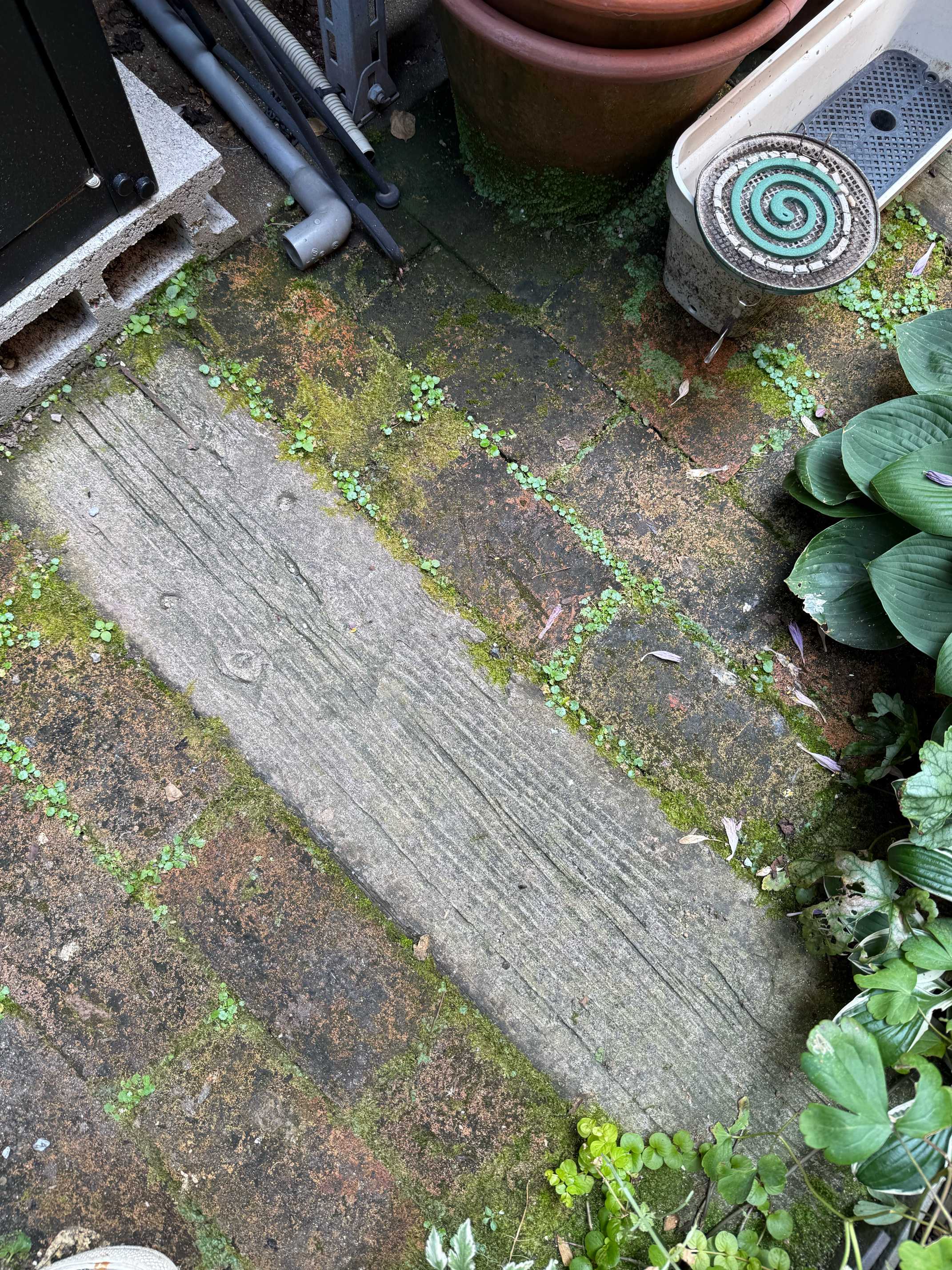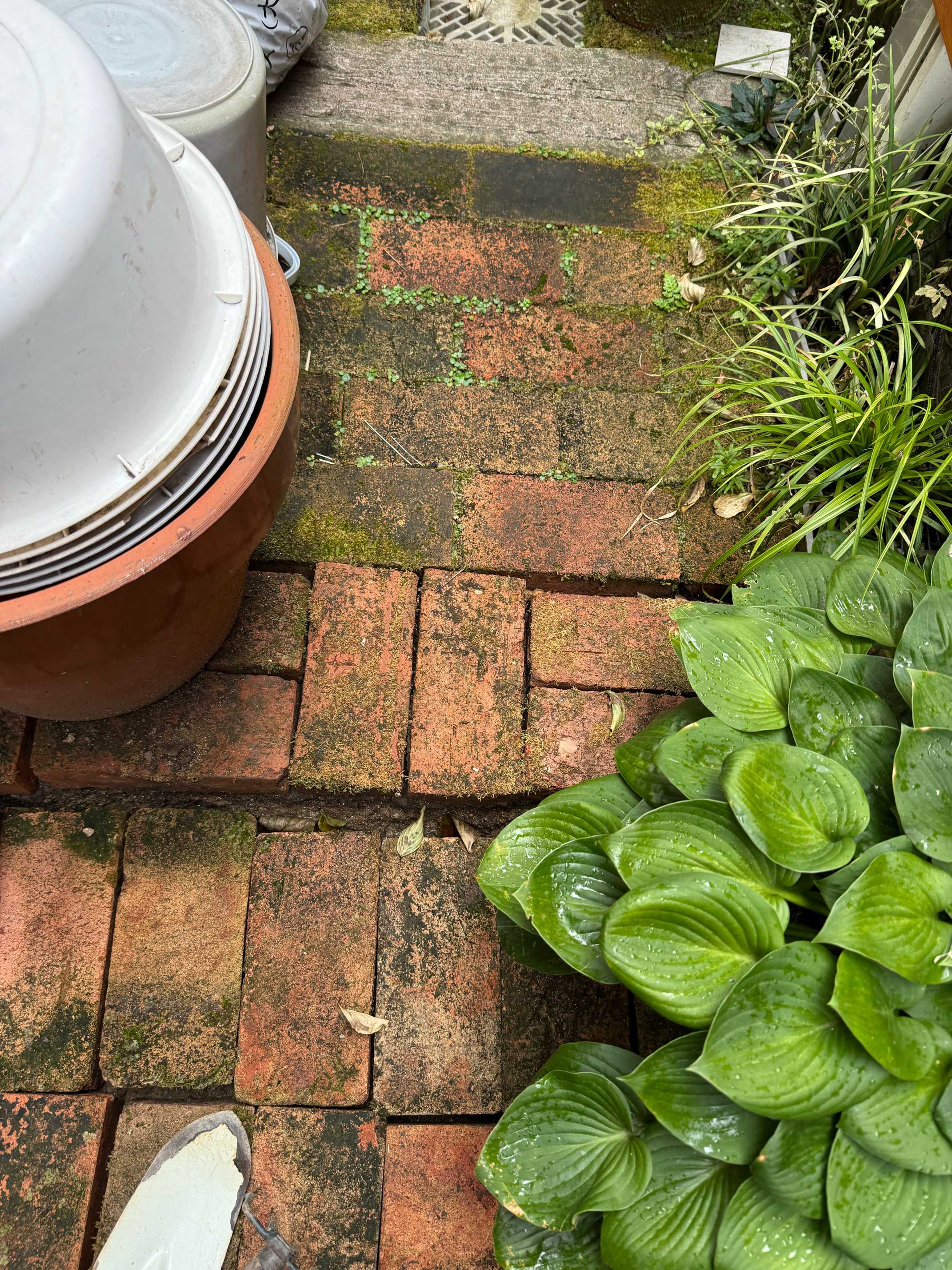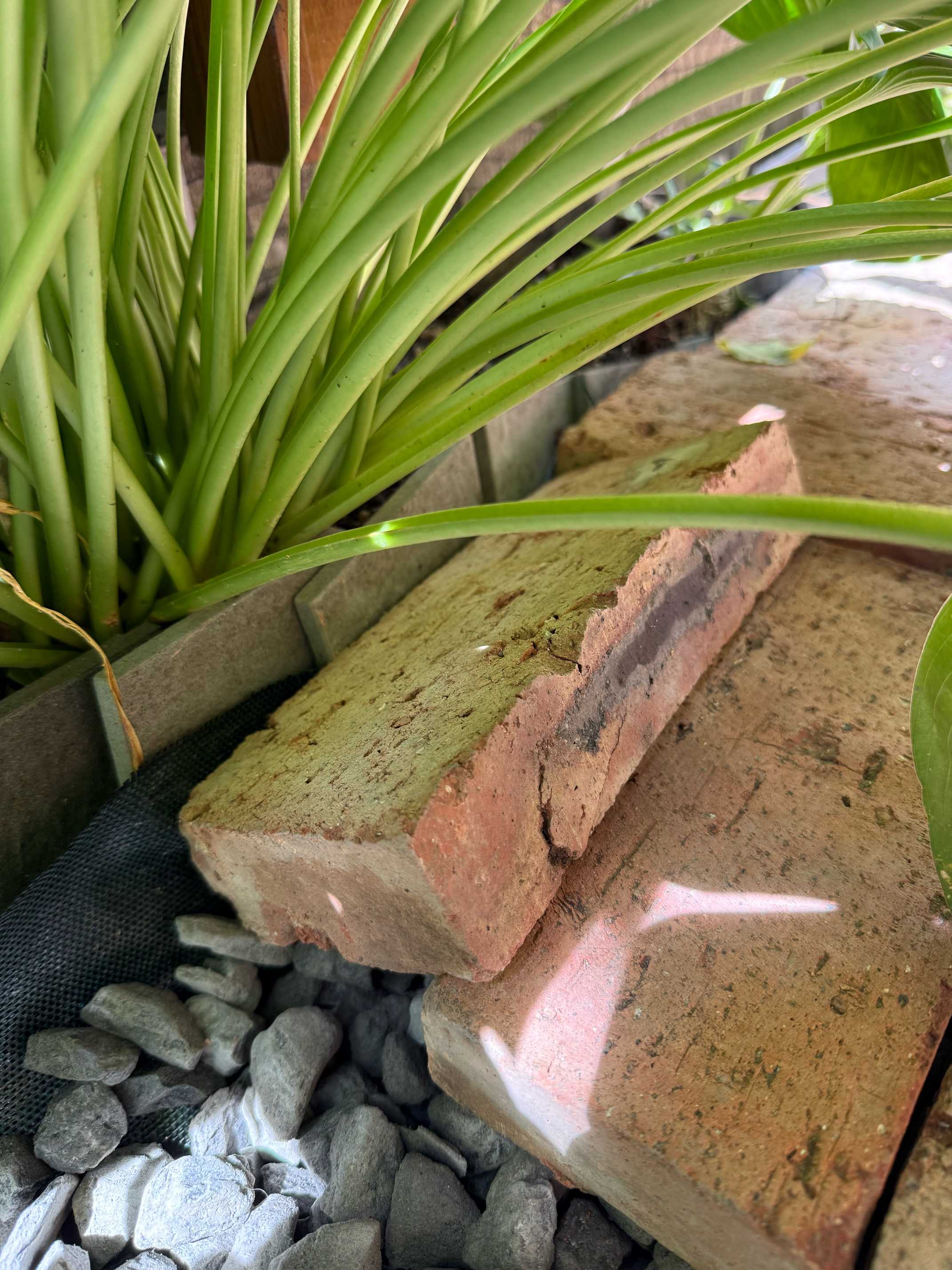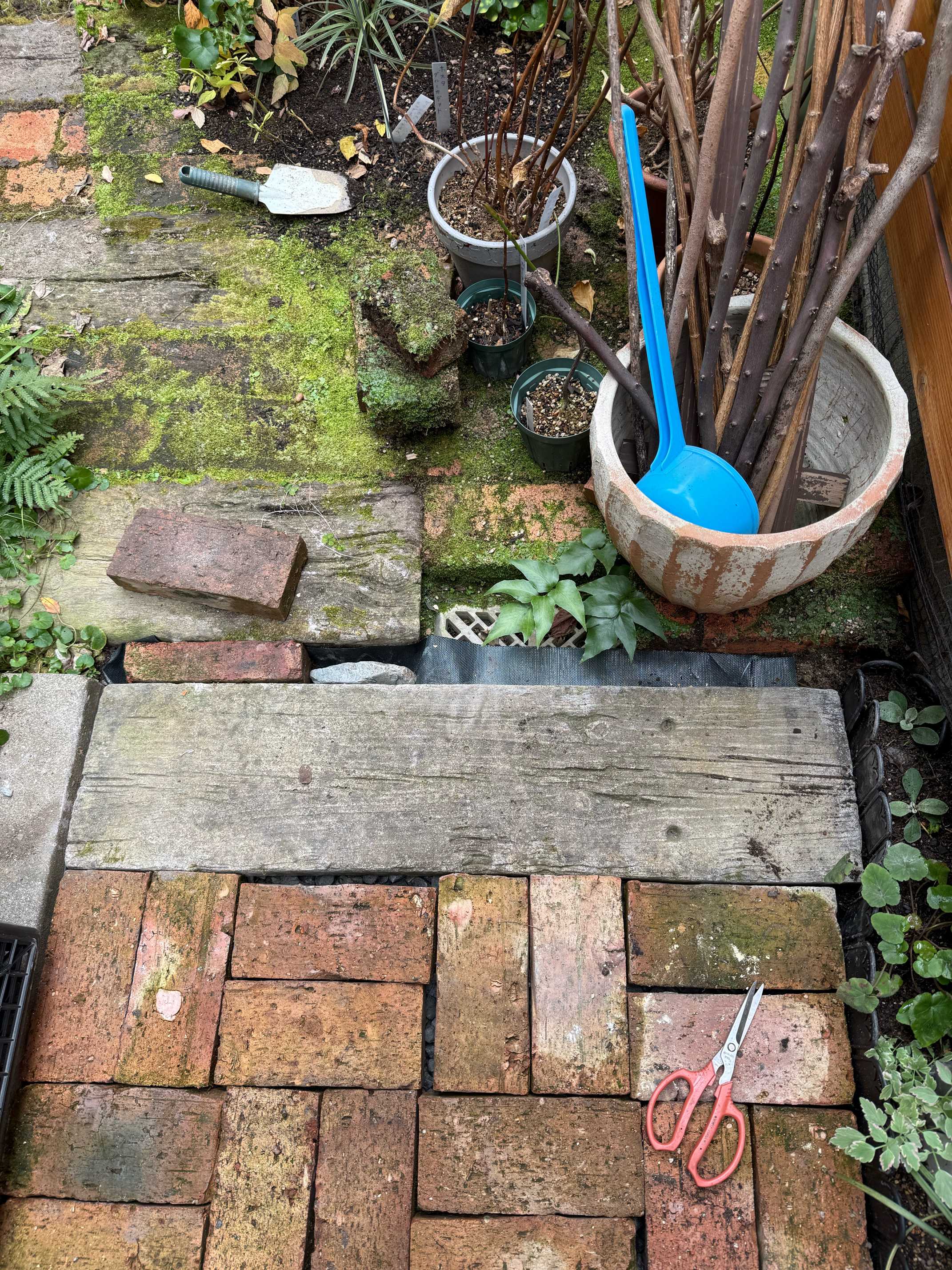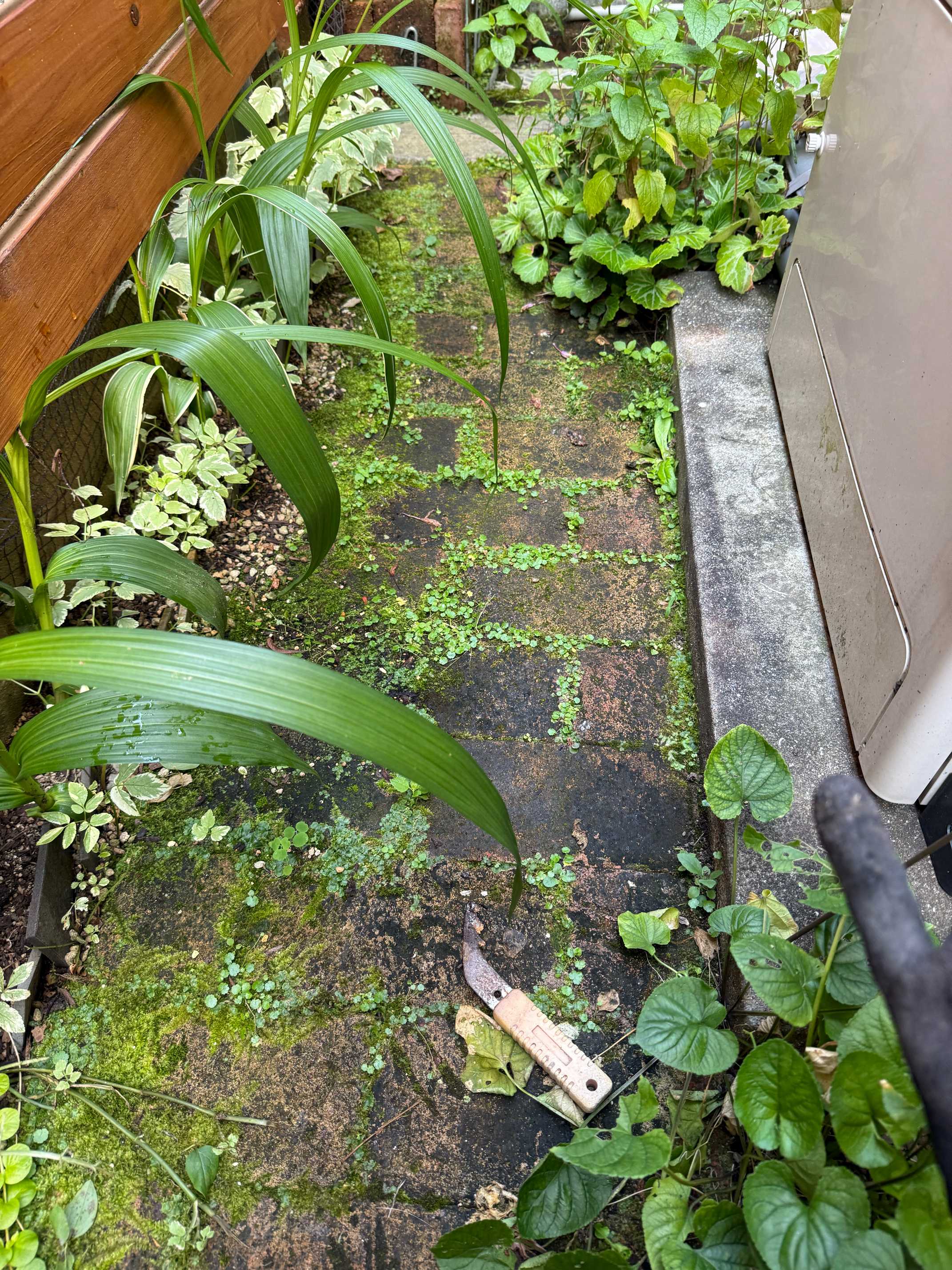 土に直接レンガを敷いたのでコケだらけになる。