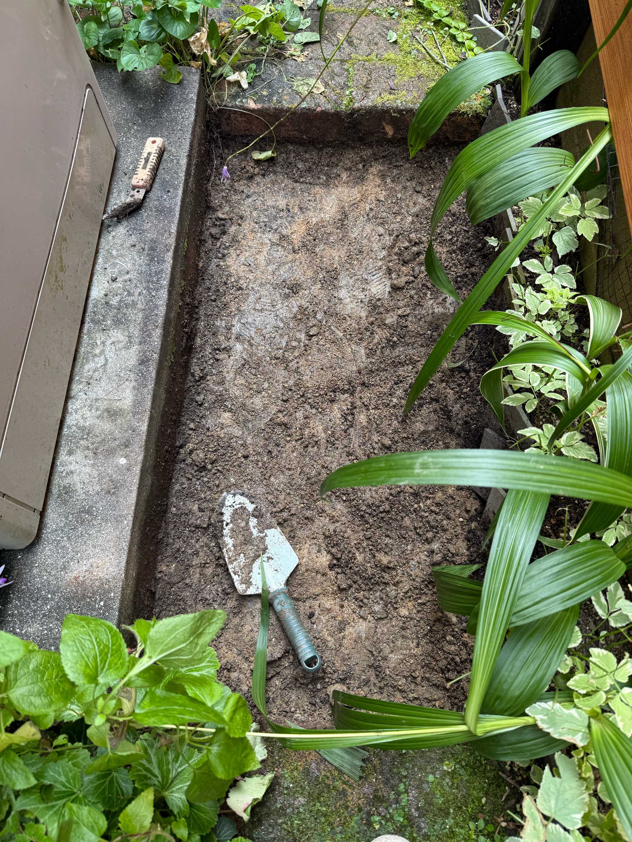 側面と底はコンクリート、反対の側面は粘土質の土なのでとにかく土は水はけ重視。