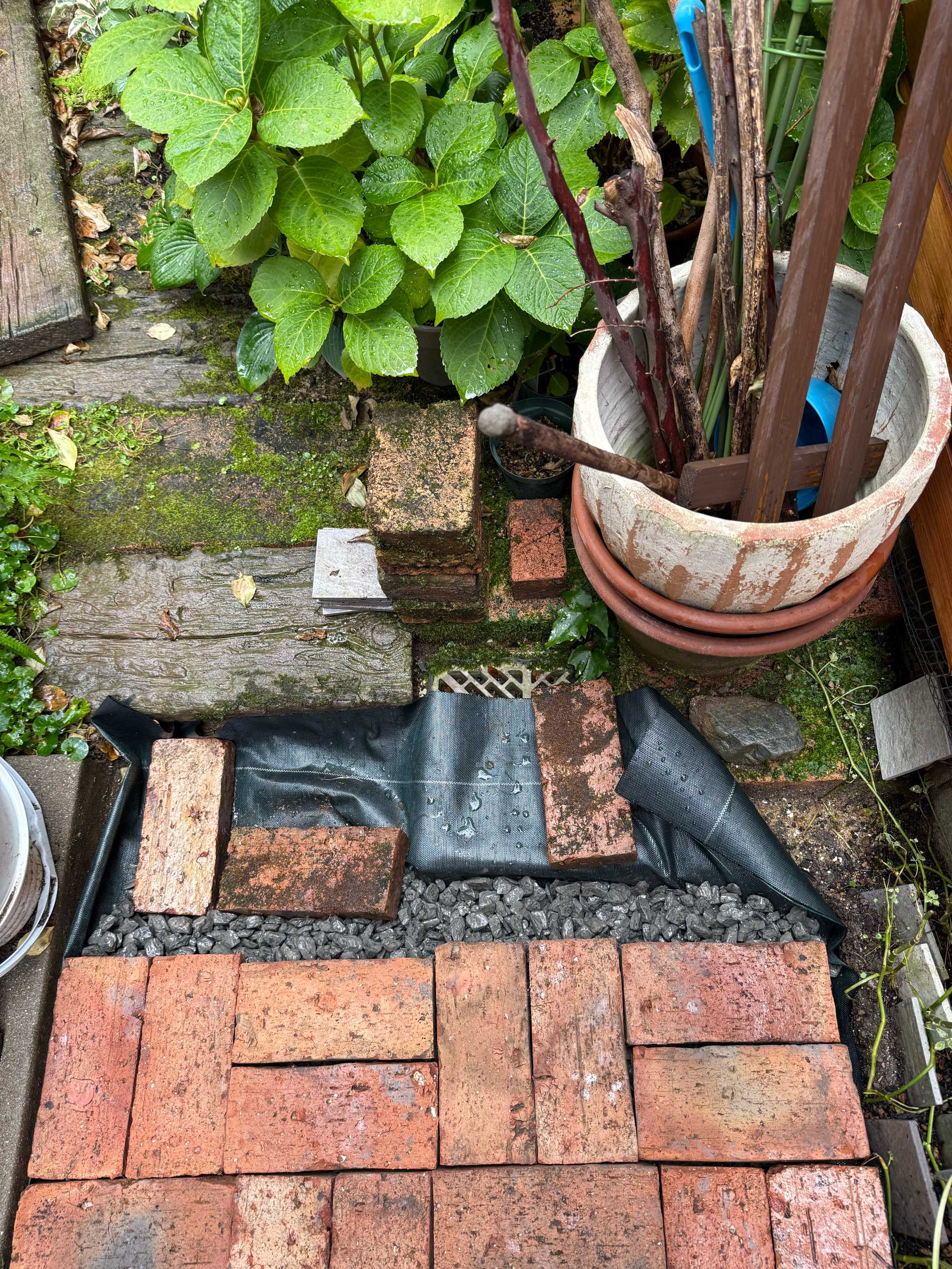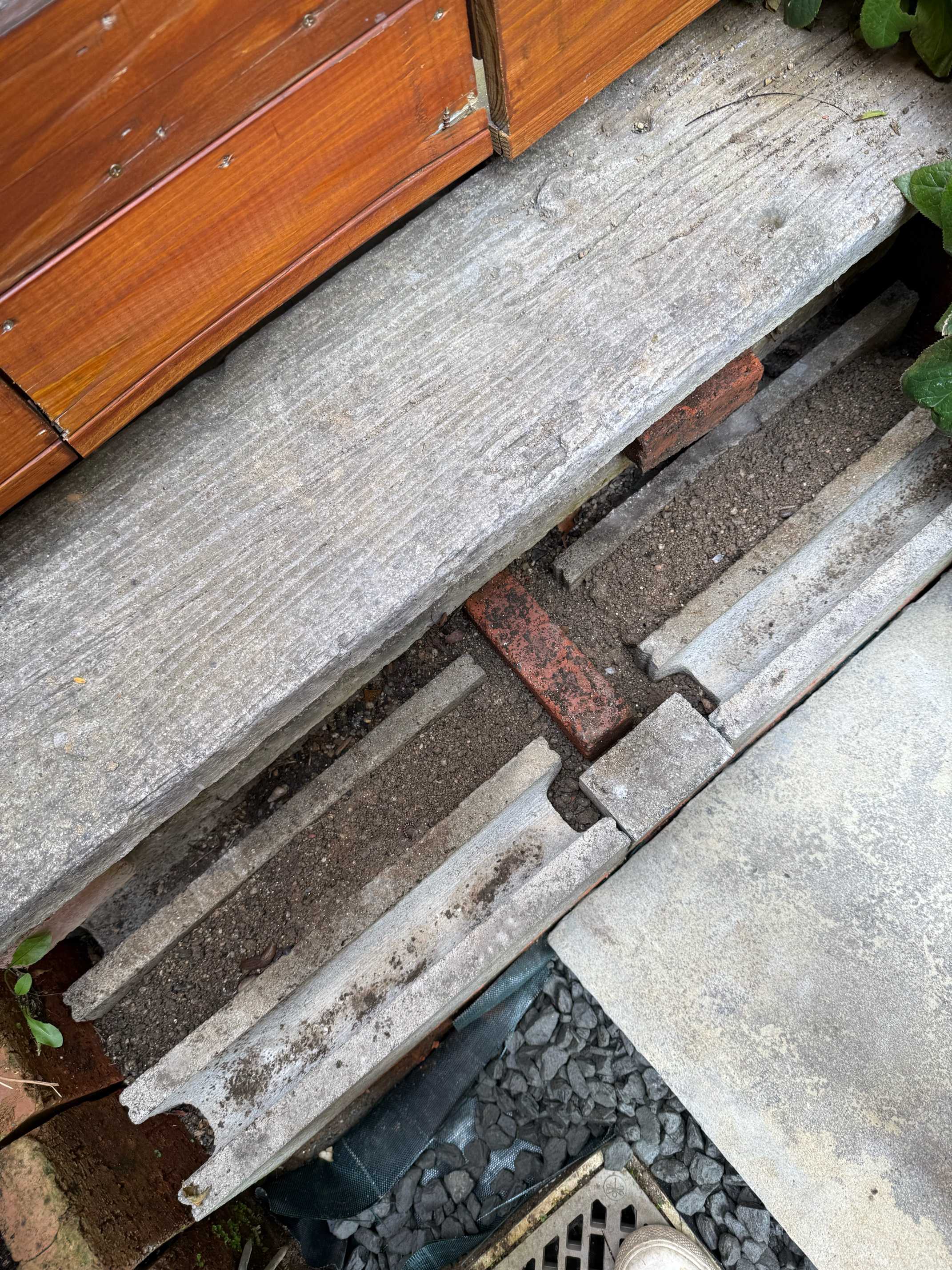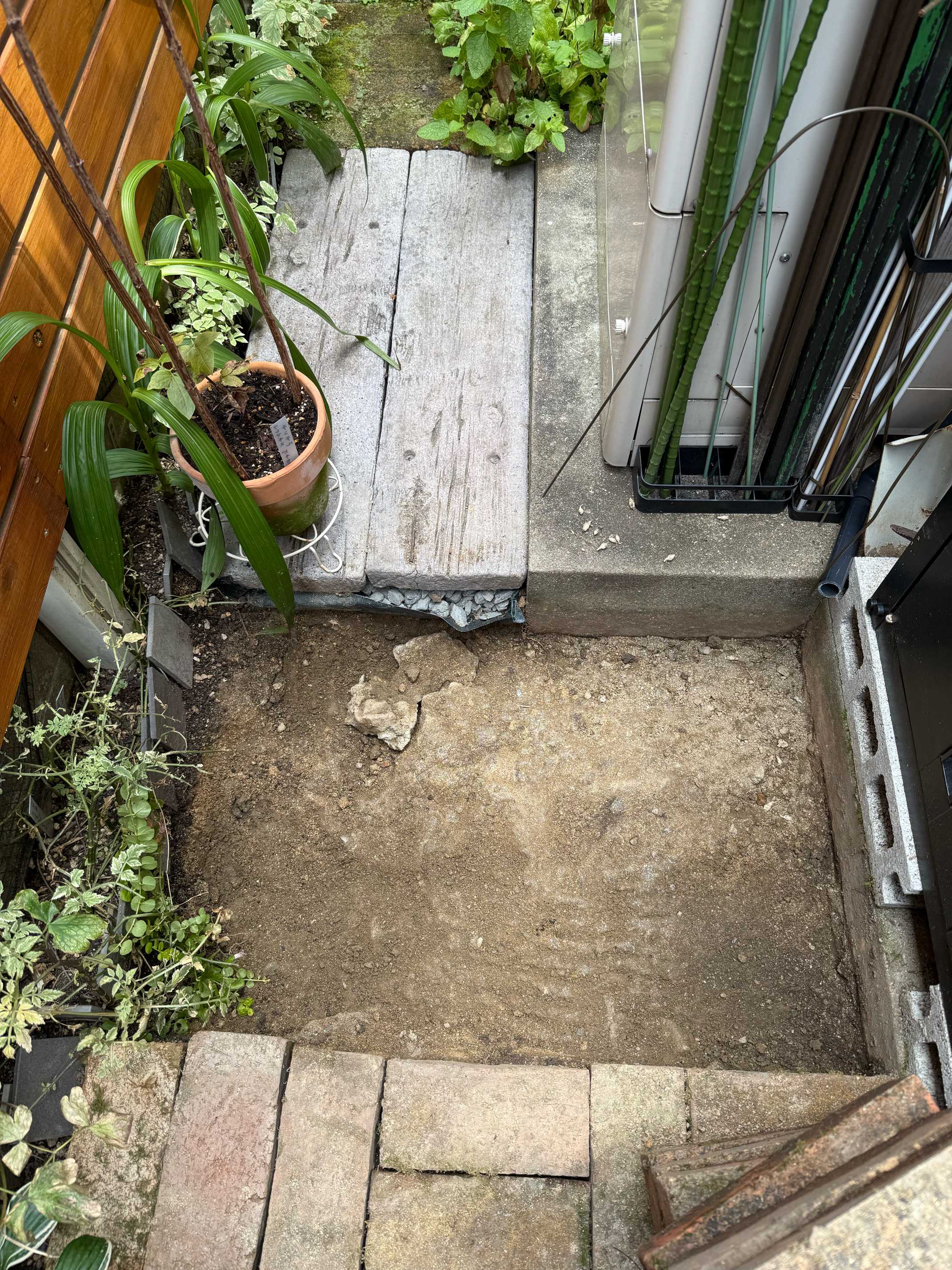 剥がしたレンガの幅に買ってきた石板と元々敷いてあったコンクリート枕木がピッタリハマるというミラクル👍