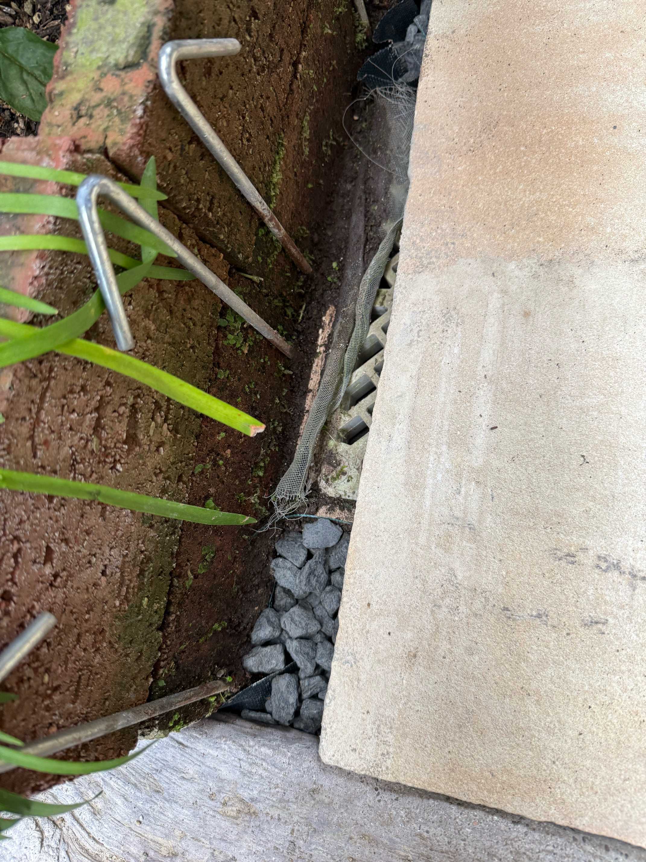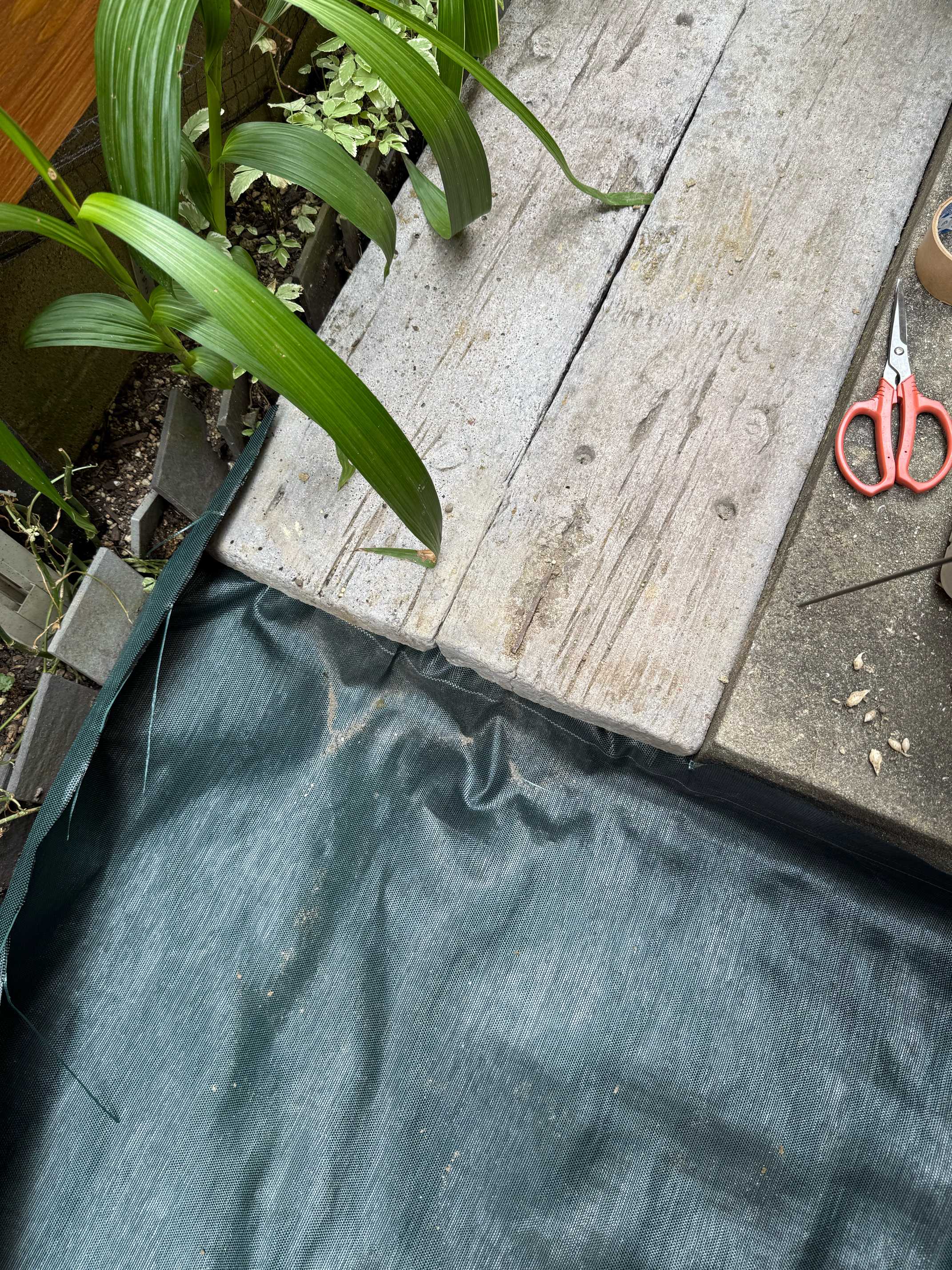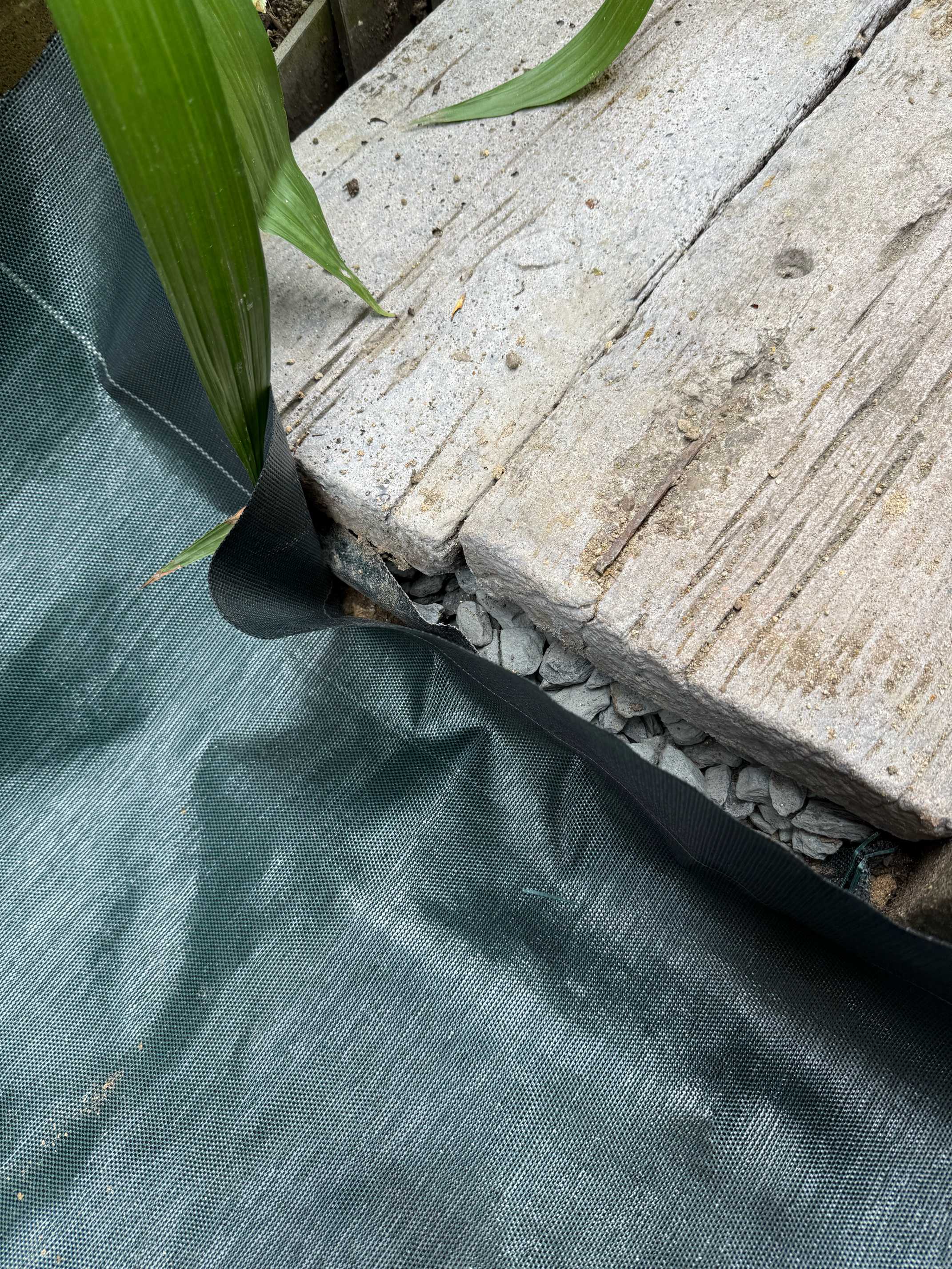 結局防草シートの下ではなくて、コンクリート枕木の下に挟み込むことにした。