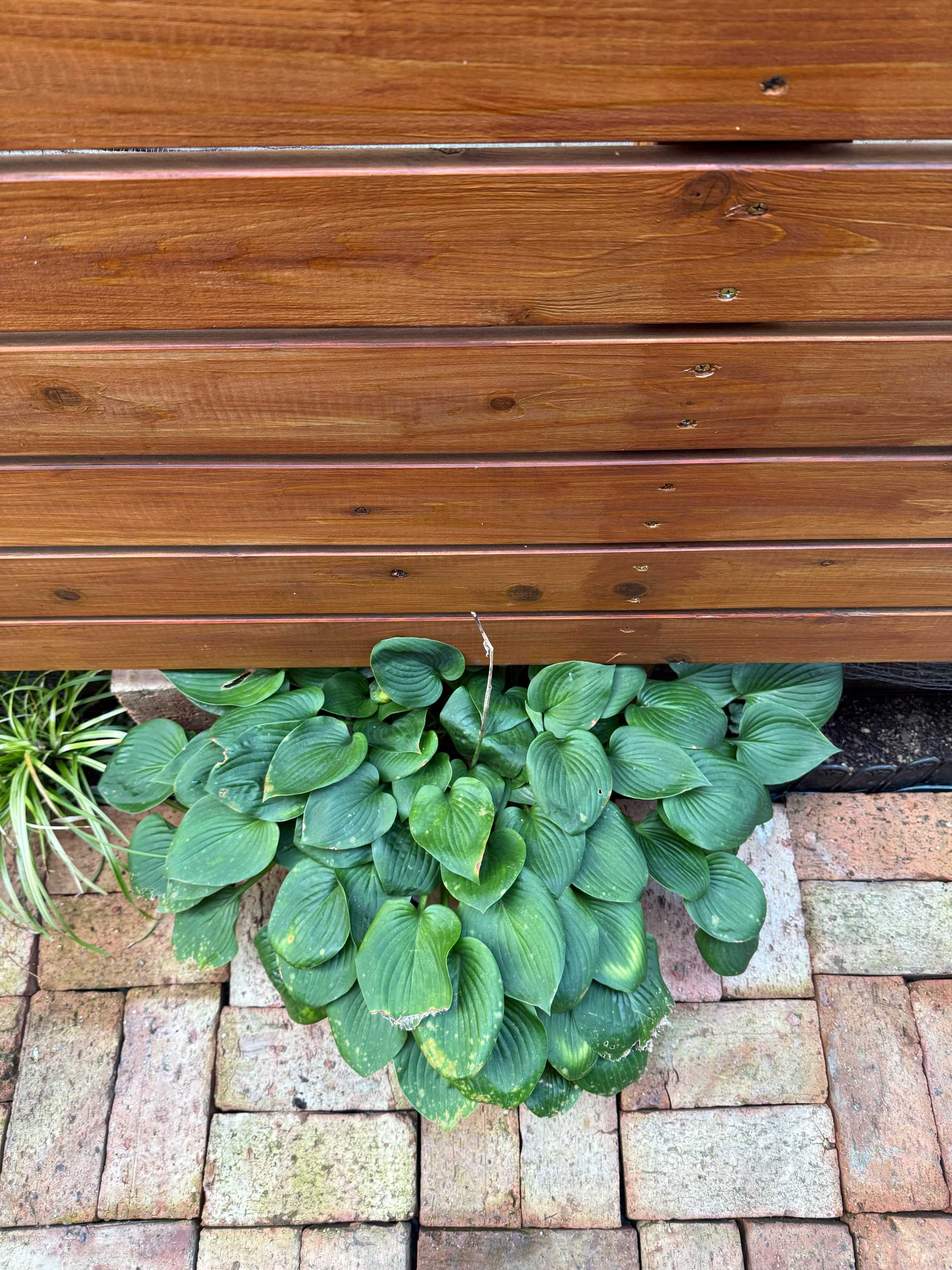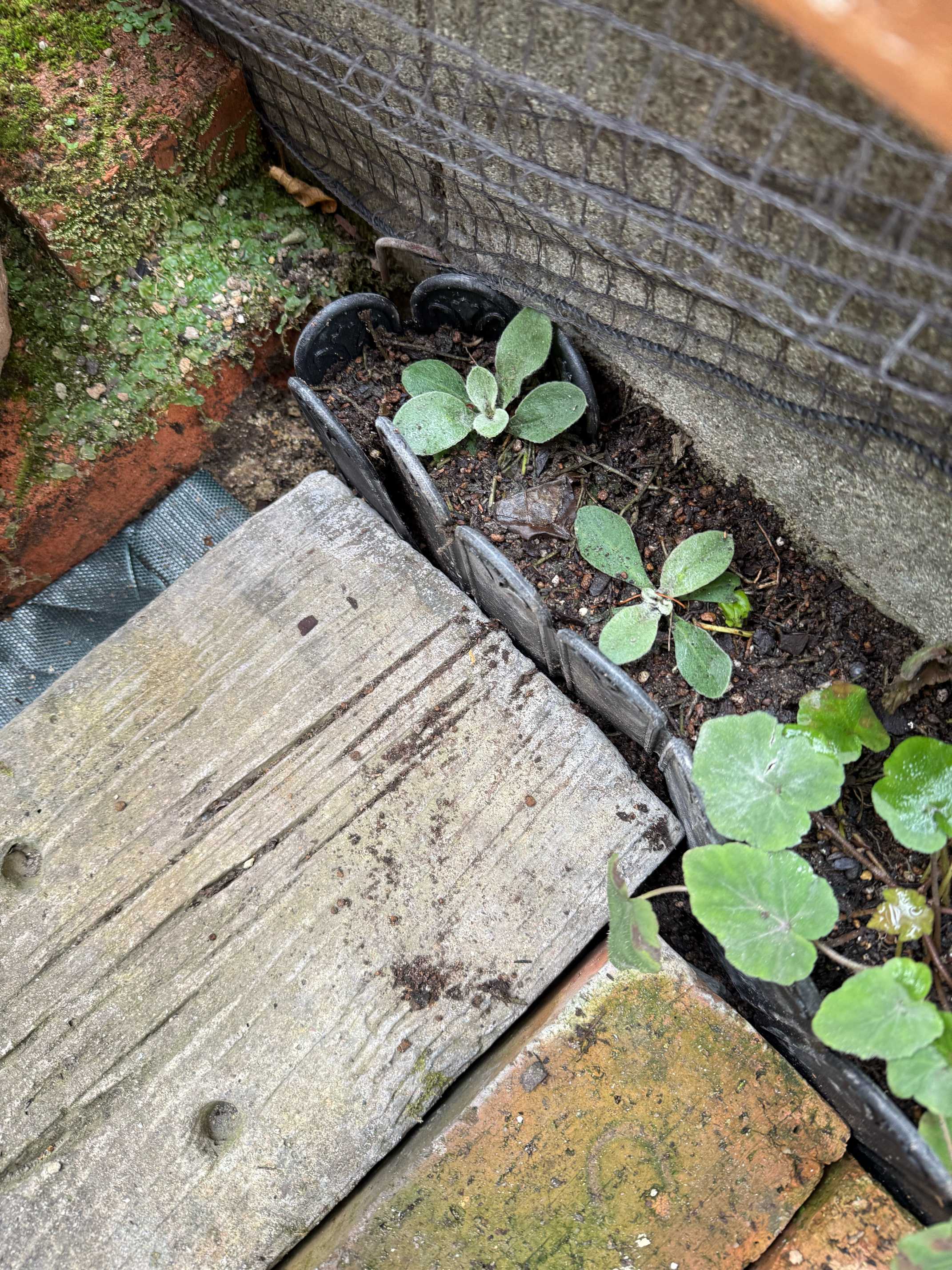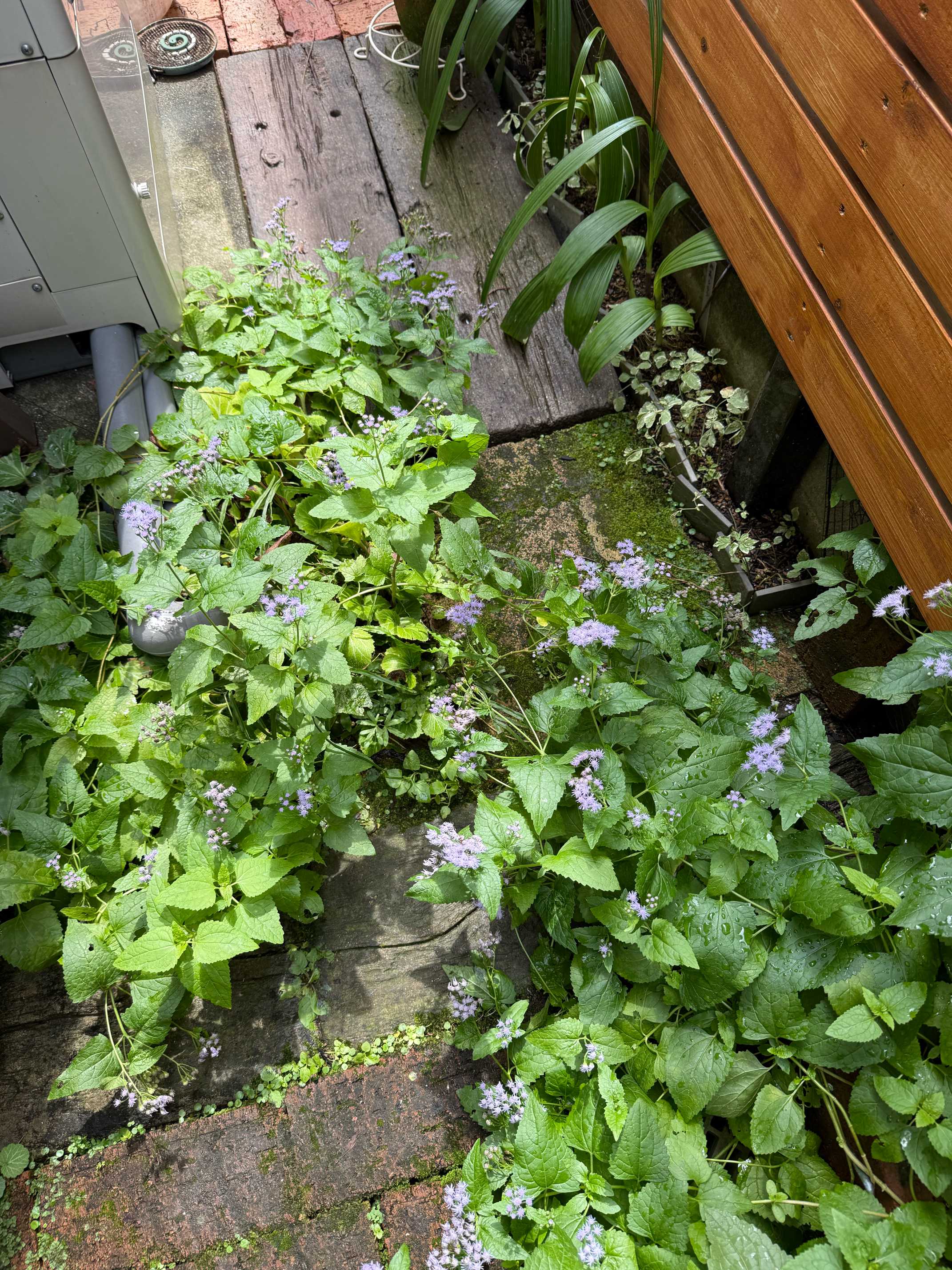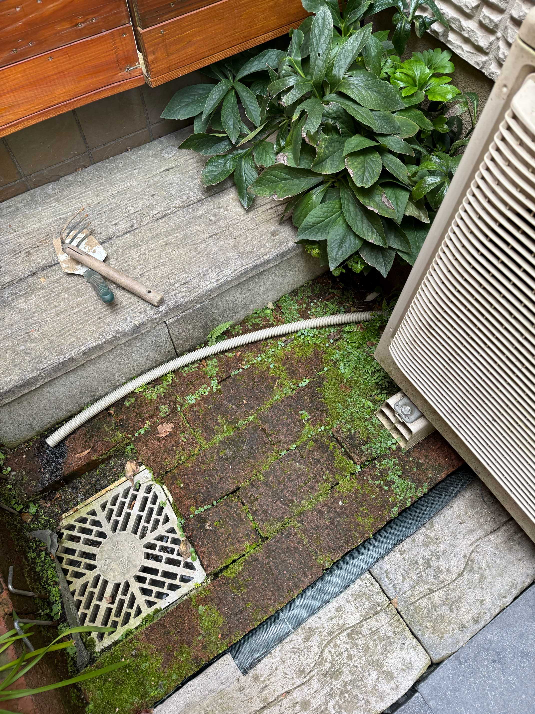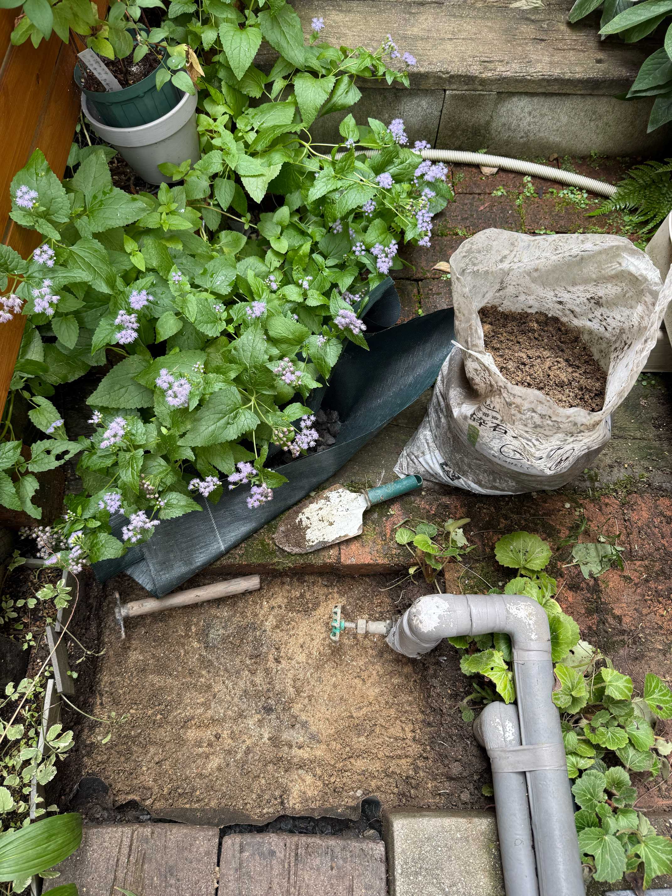 レンガの隙間を小さな花壇にしていたが撤去することにした。
