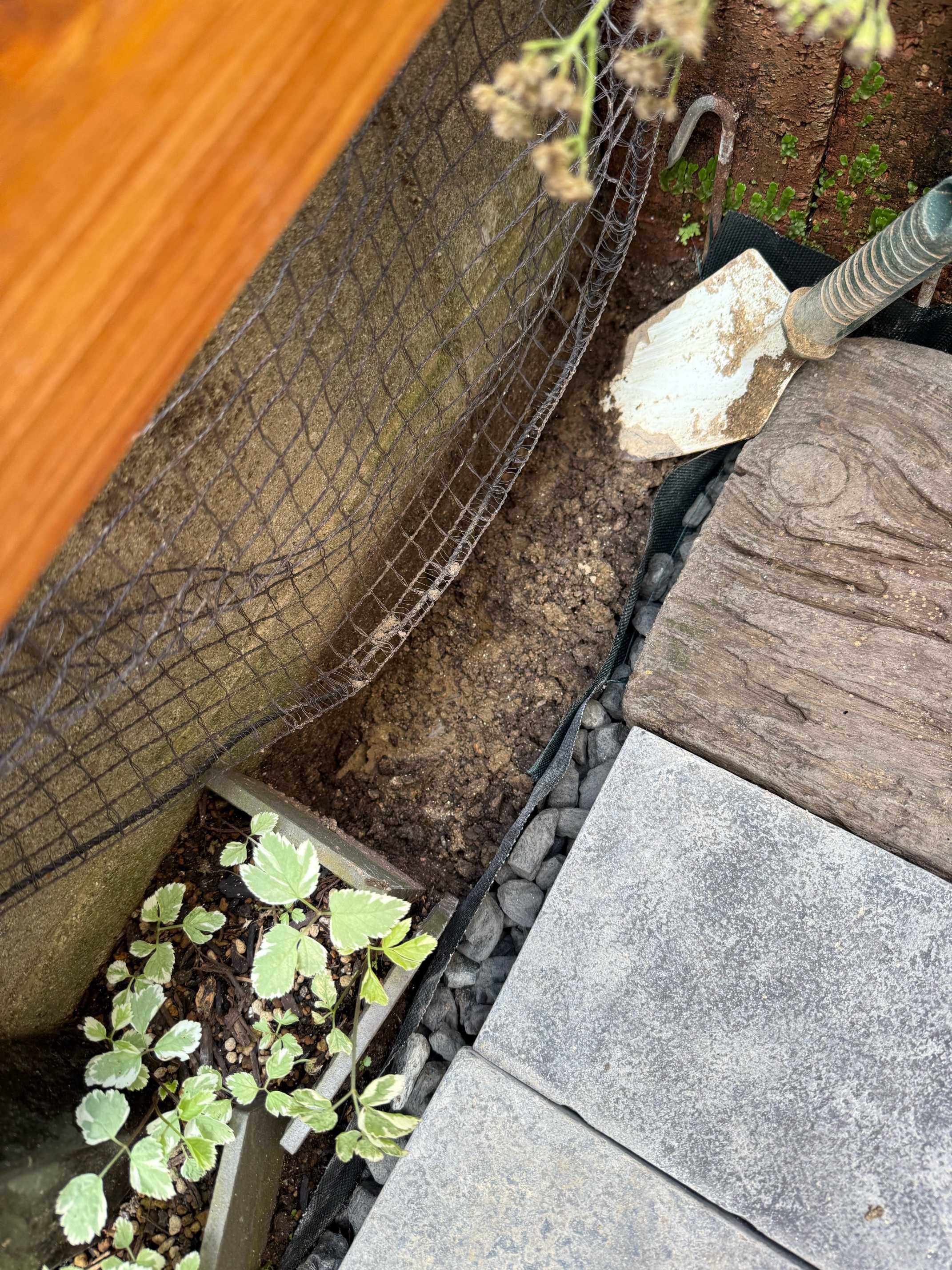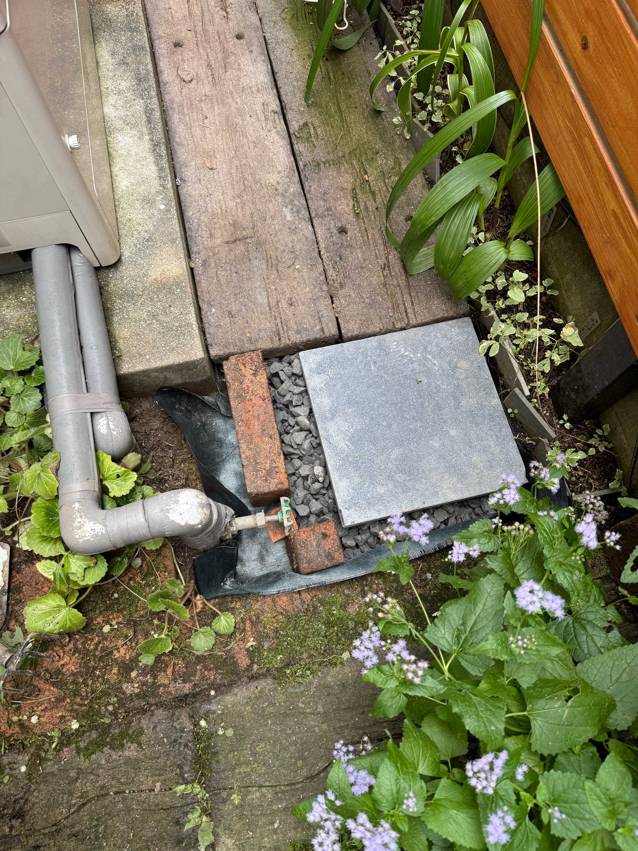 雨水枡の右側は以前掘って砂利と砂で施工し直した場所。