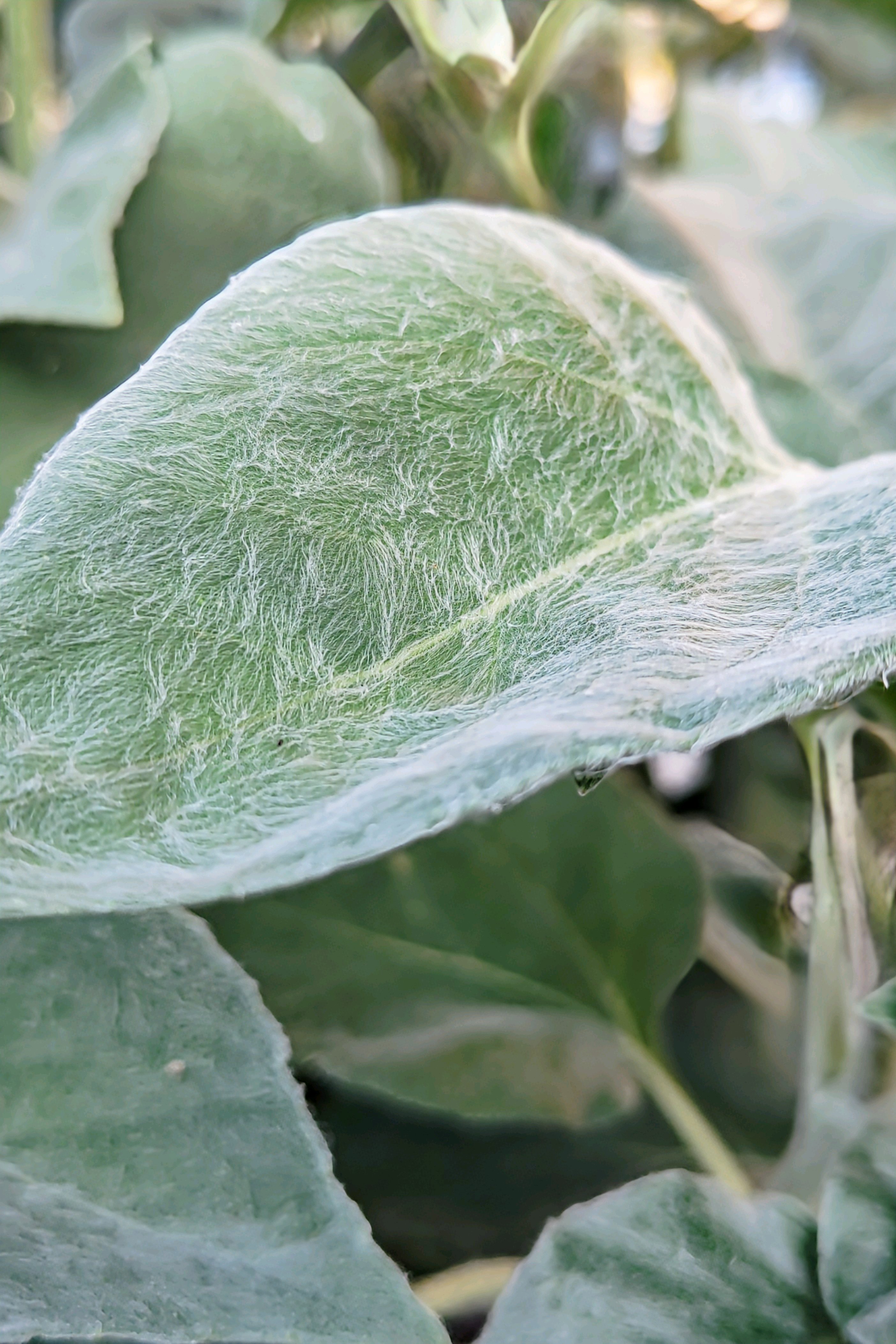 シロタエヒマワリの葉には、びっしりと綿毛が生えて。