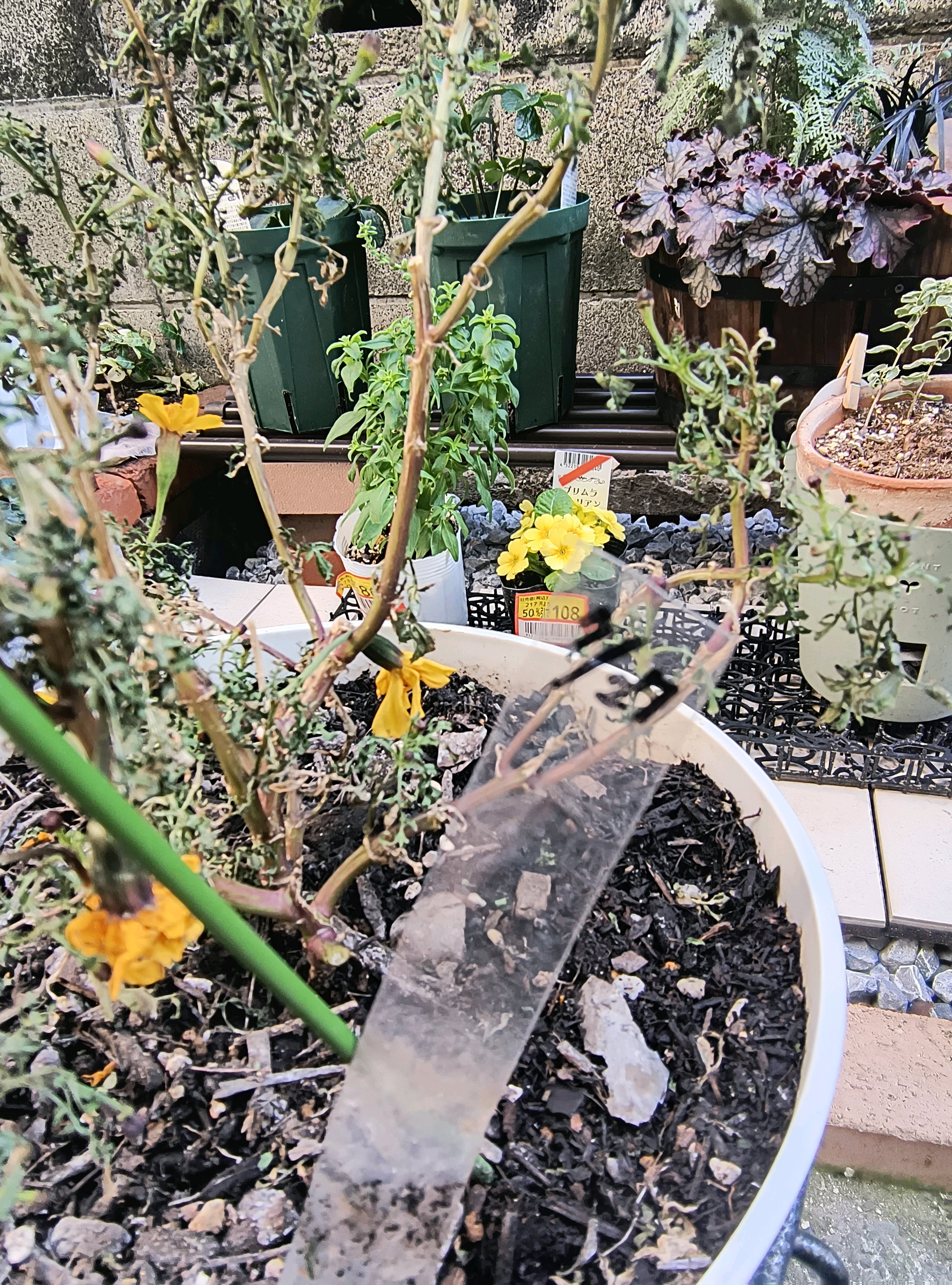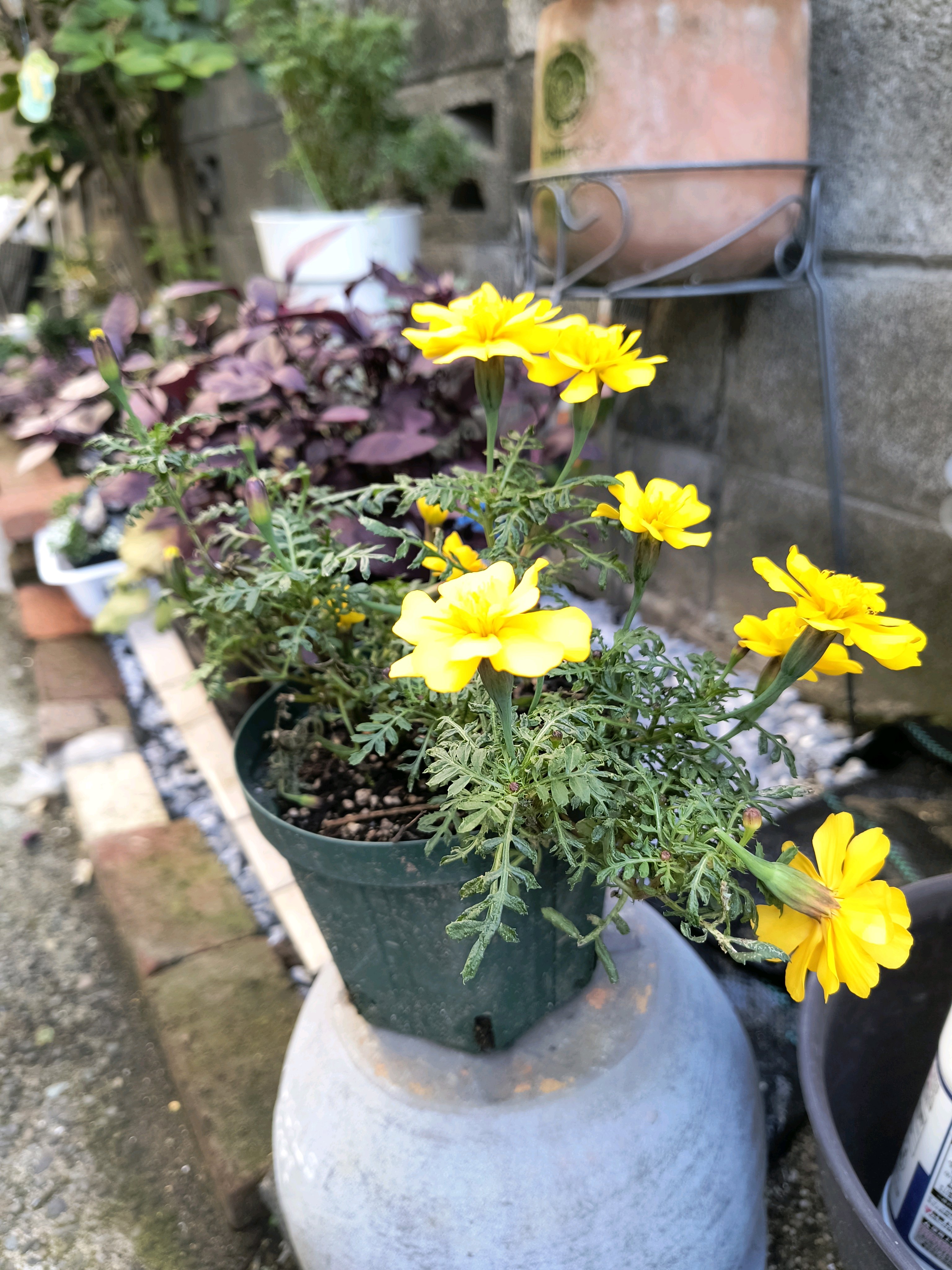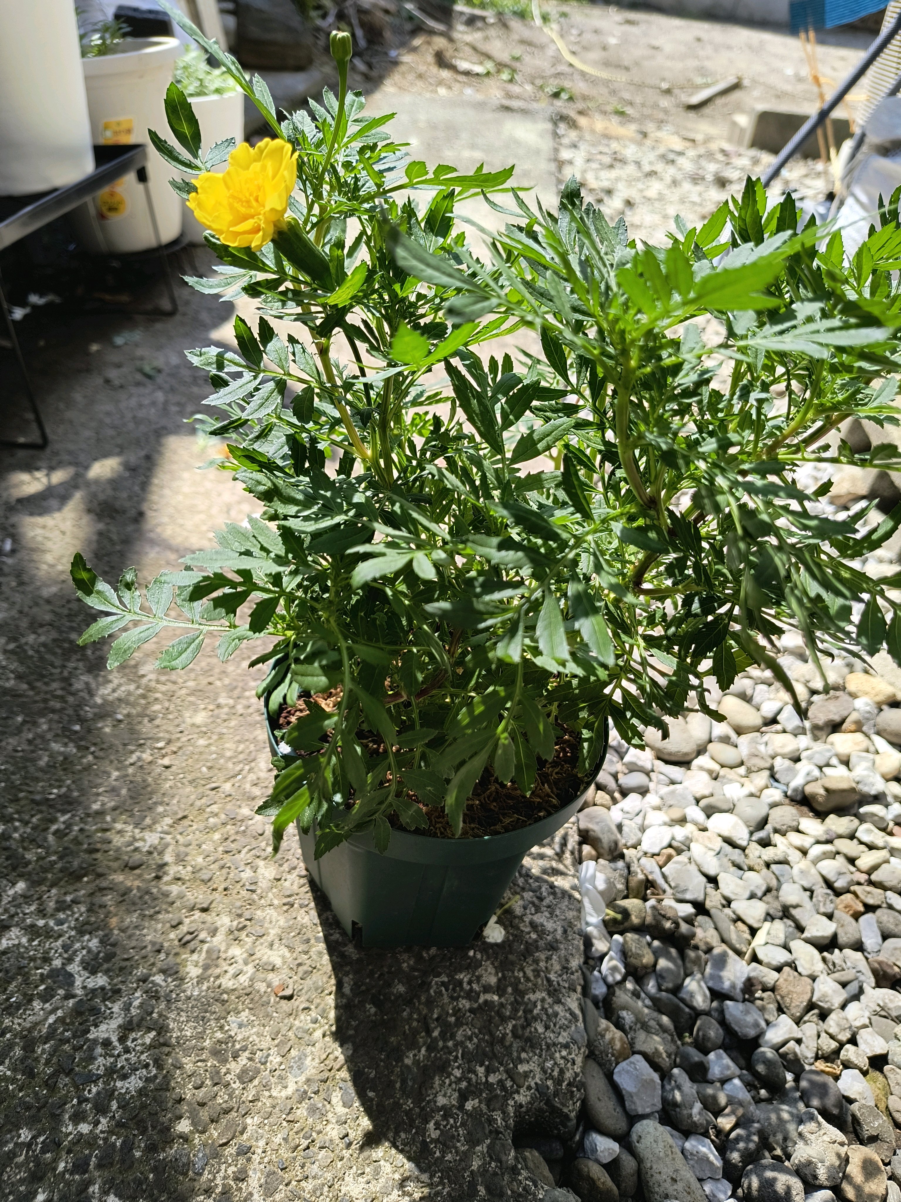 夏の間草丈だけがボリュームアップし続けたマリーゴールドですが、折角なので五合鉢から七合鉢へ鉢上げしてみました。