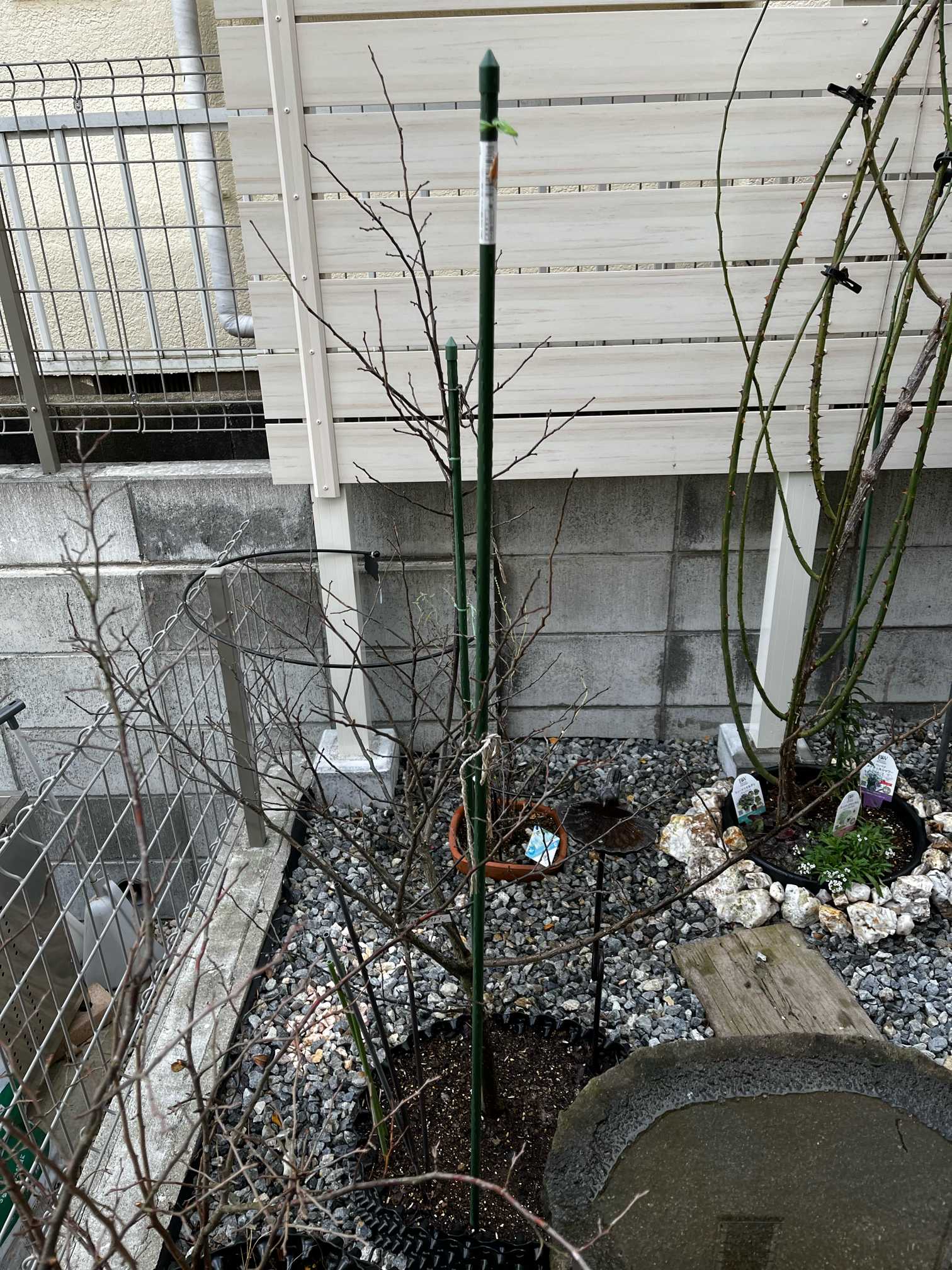 他の木々や薔薇の芽が赤くふっくらしてるなか全く兆しがない。やはり早く地植えしすぎてしまったか? 生きてるか枯れてしまったかドキドキ