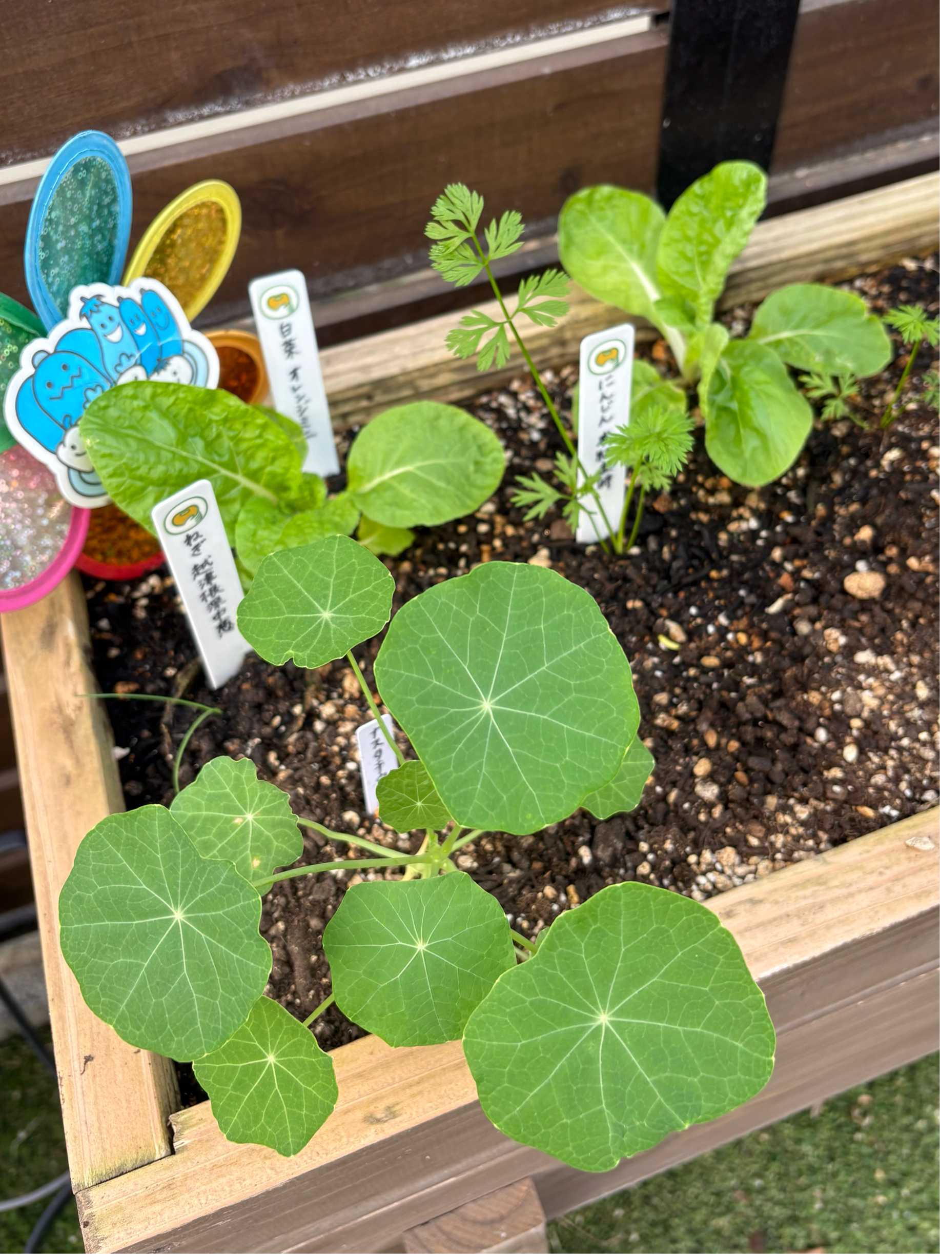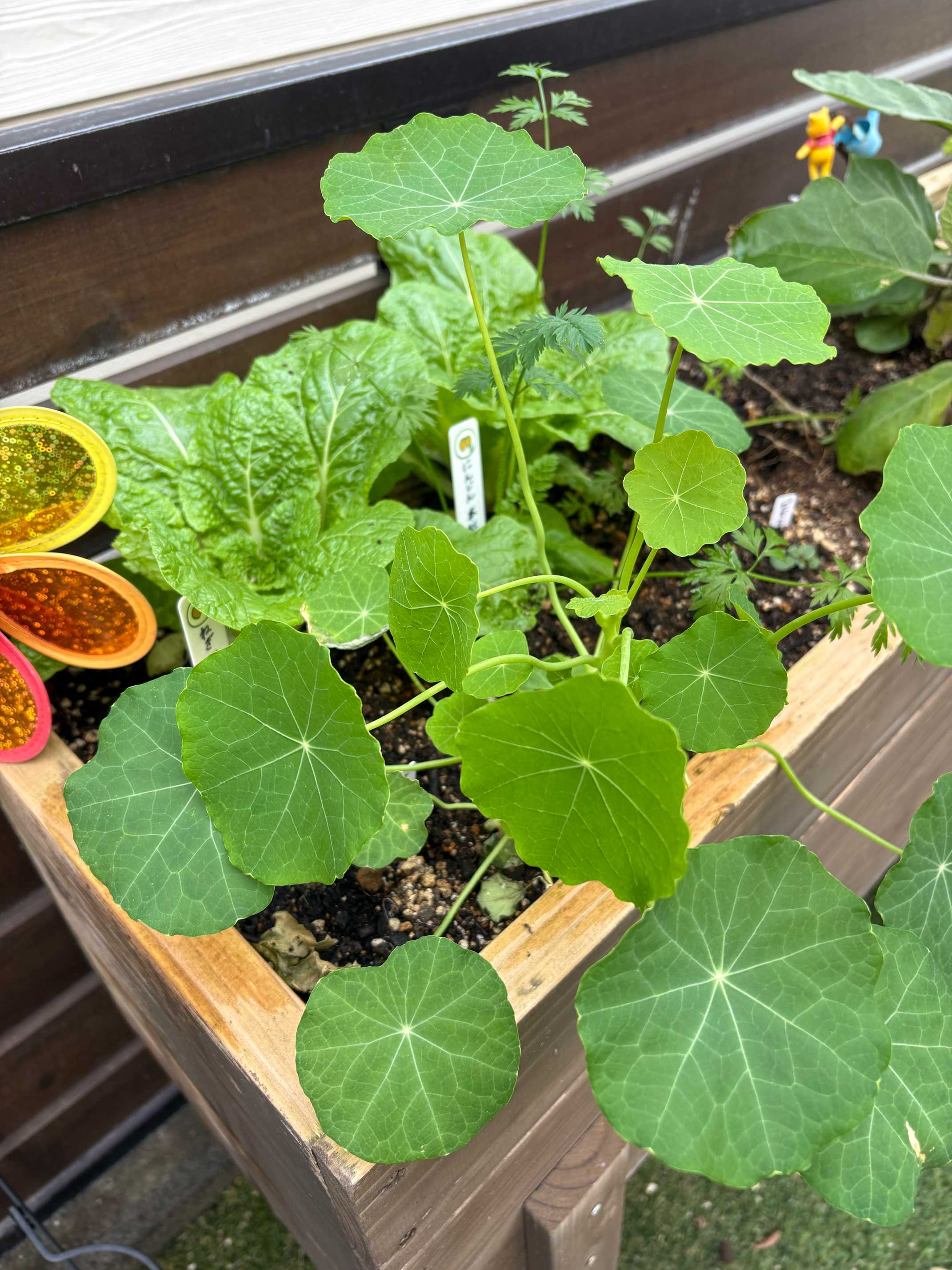 ナスタチウムの香りでアブラムシの忌避効果があり、益虫を引き寄せるバンカープランツにもなるそうです。