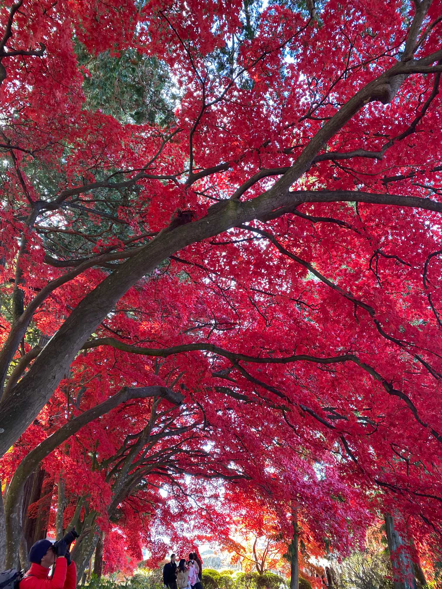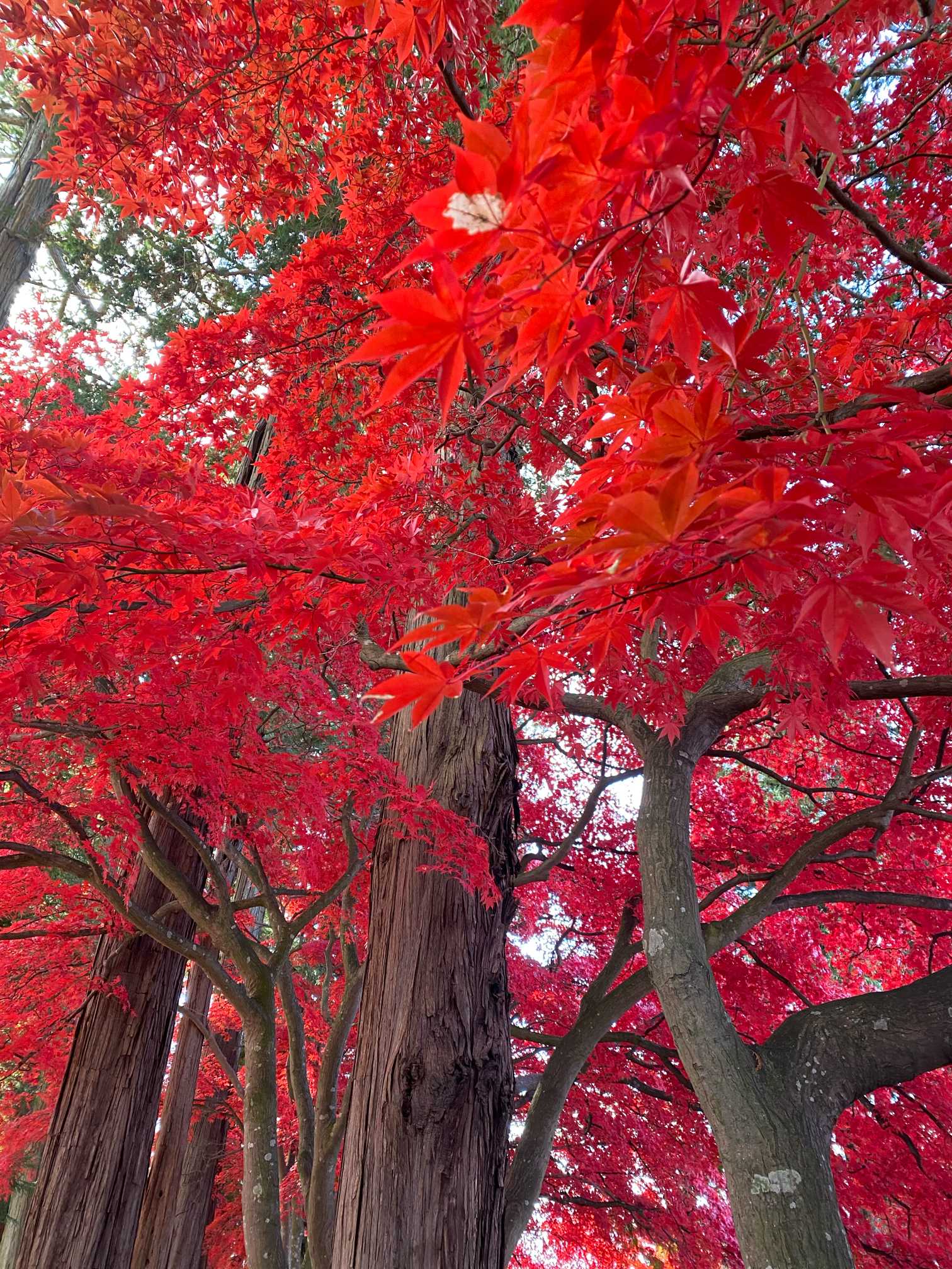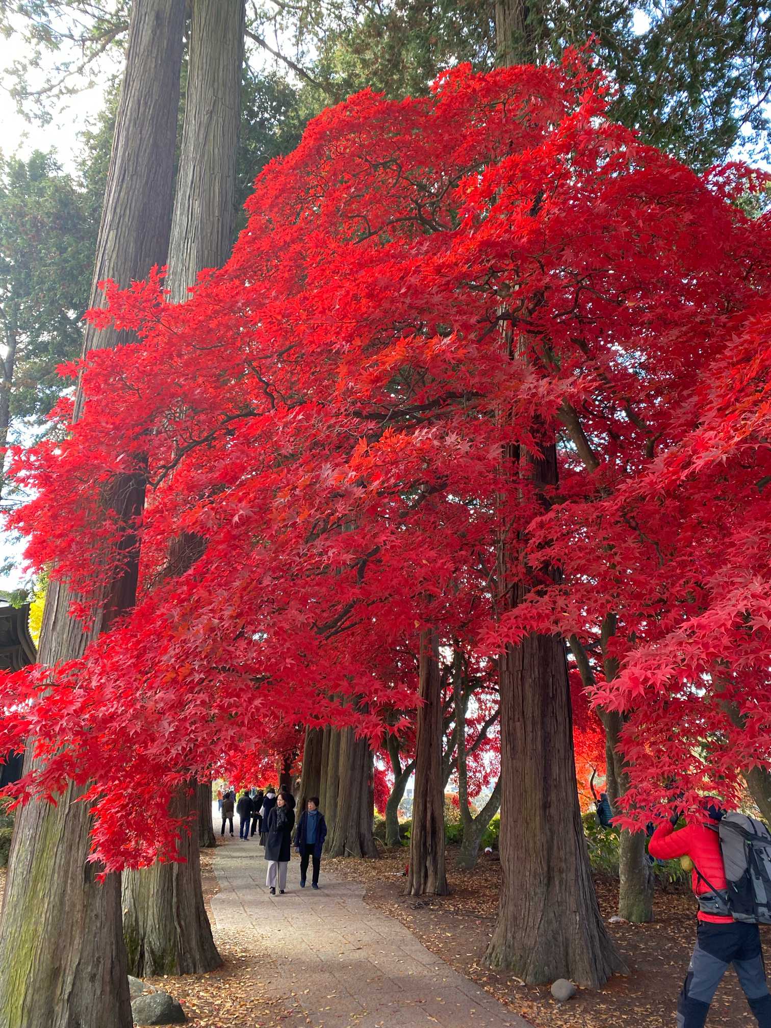 参道には樹齢300年とも言われる杉が立ち並び、大きく枝を伸ばす真紅の紅葉が見事でした😌