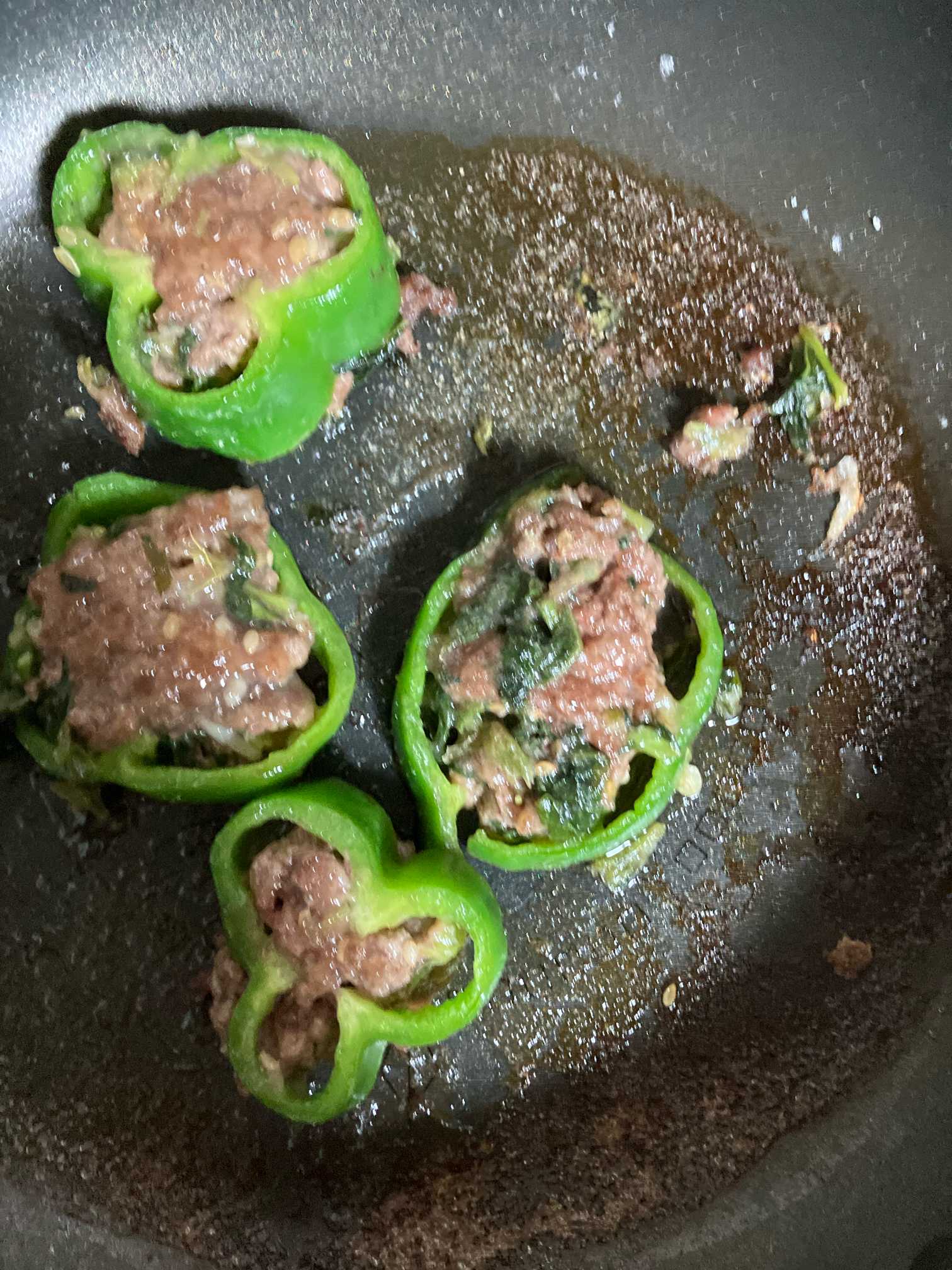 ピーマン肉詰め 作りました 野沢菜チリメン入り(・へ・)!