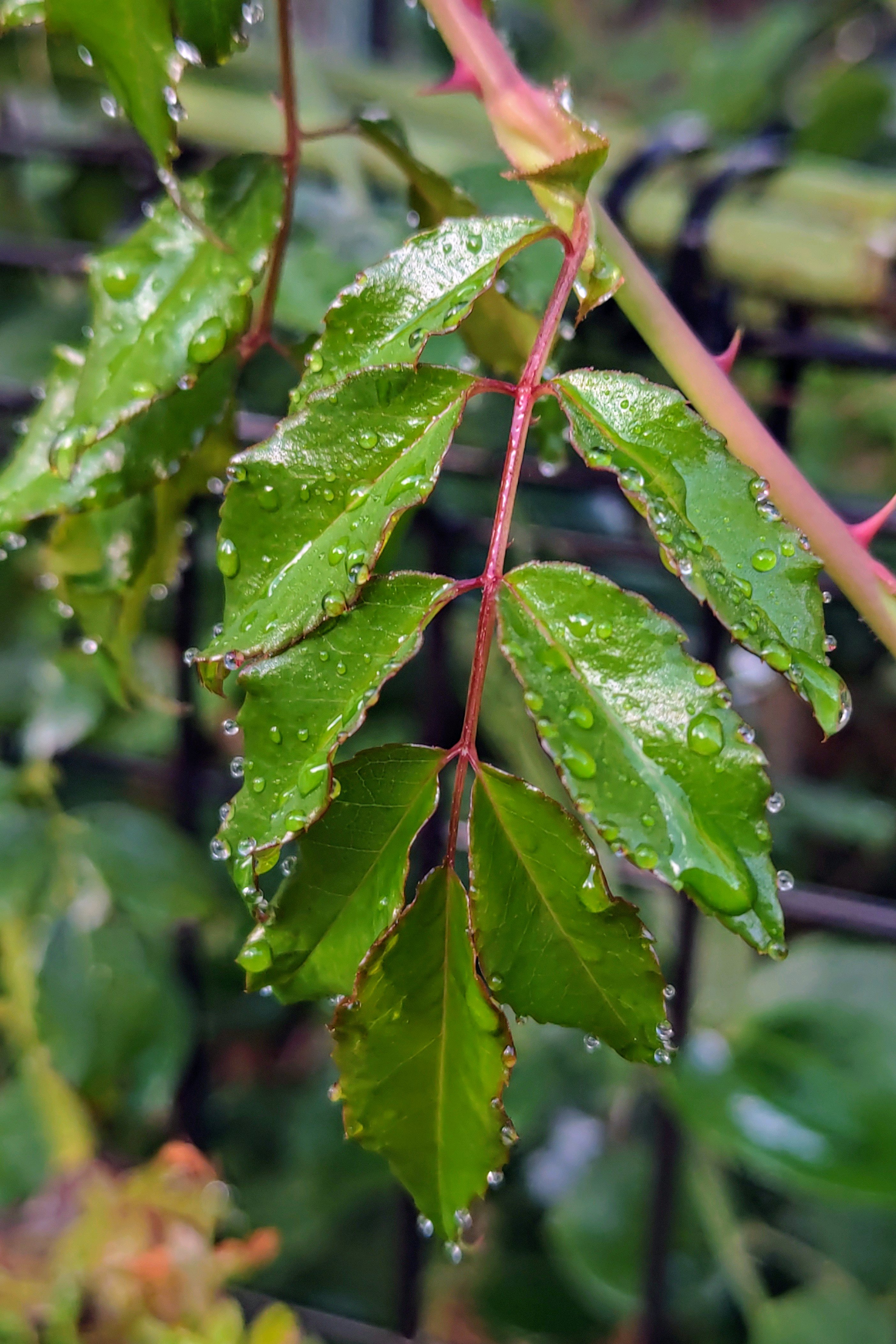 夜の雨に濡れて雨粒を纏ったバラの若葉