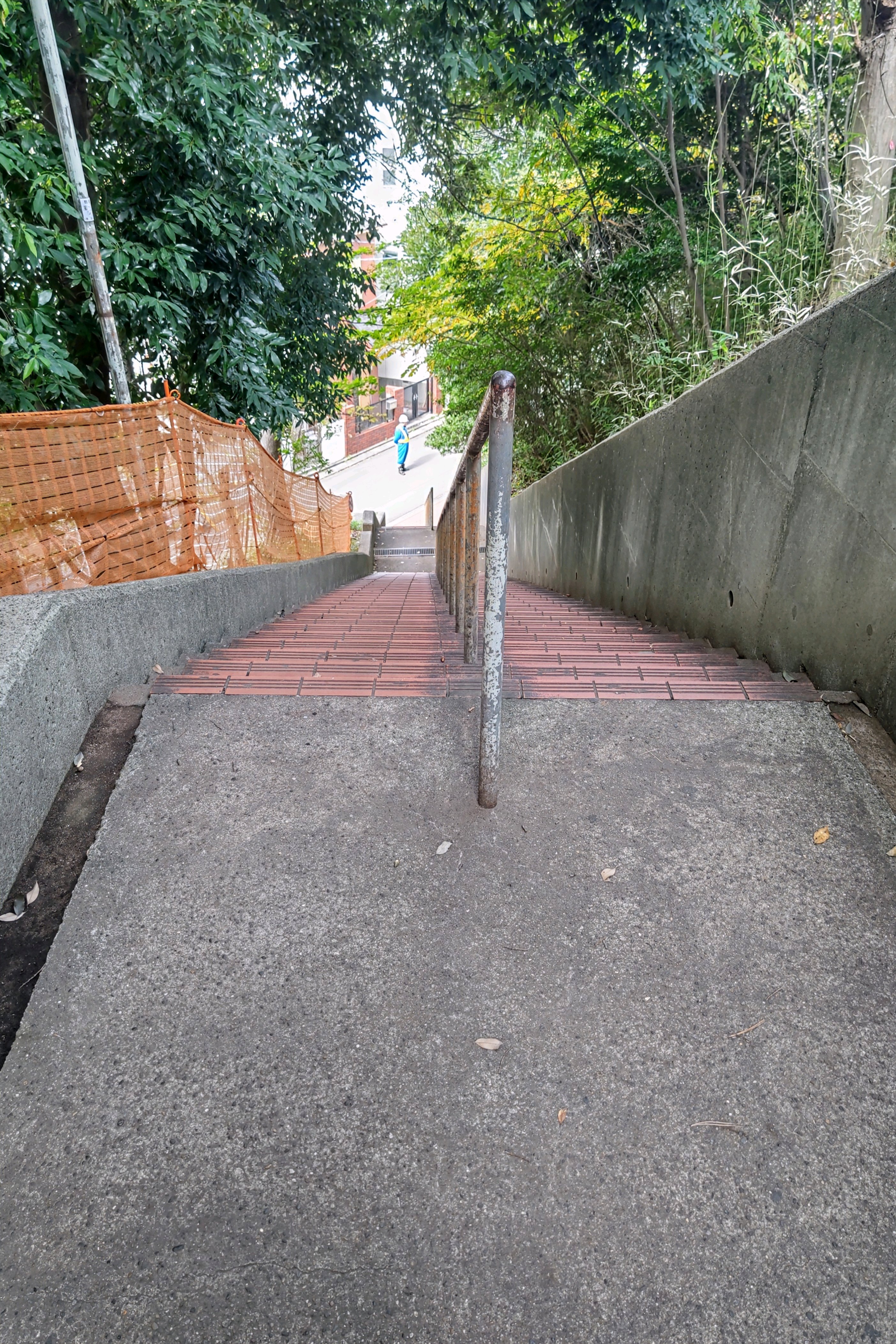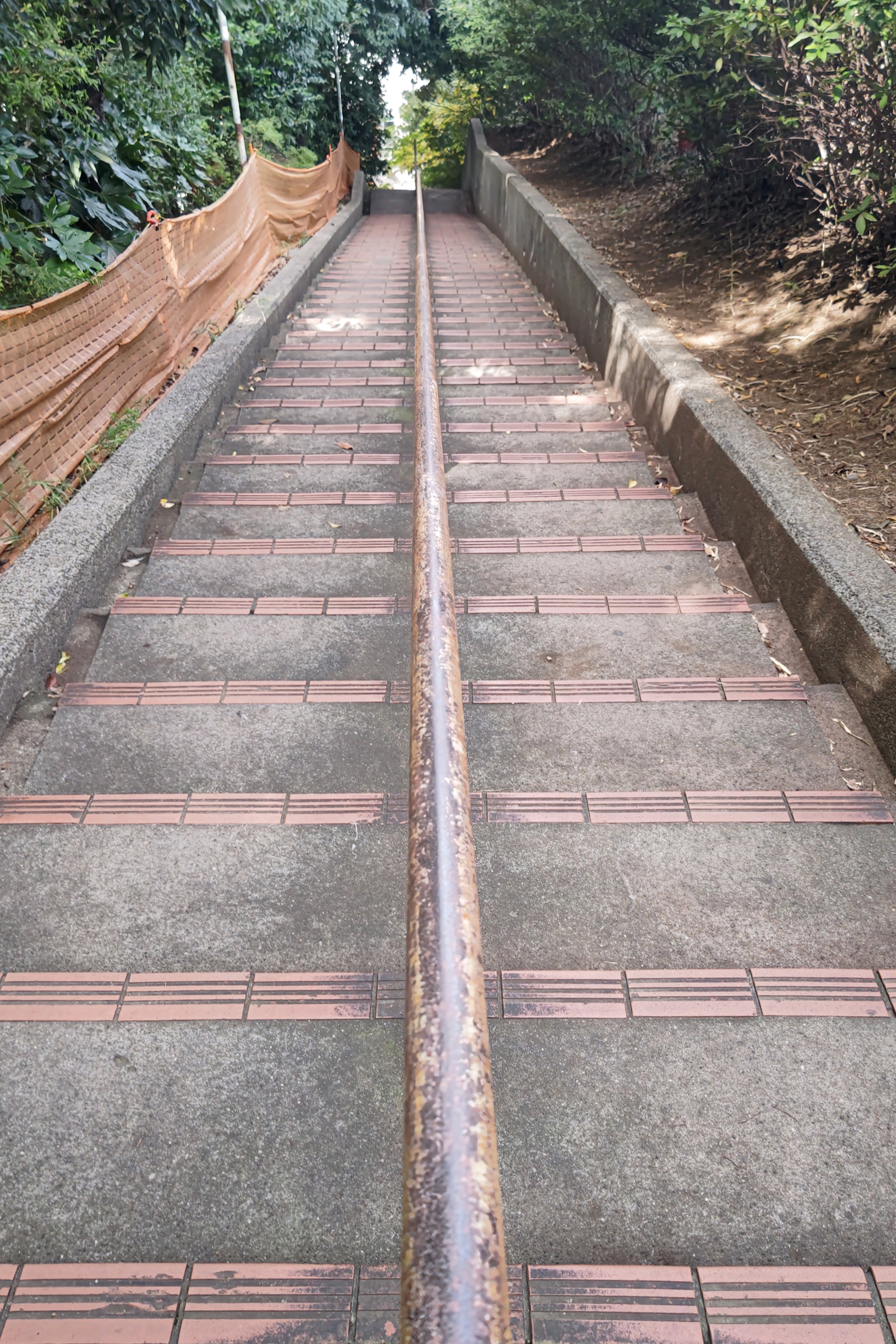 道路から見上げる。この先、2か所の踊り場を経て階段が続く。⬆️