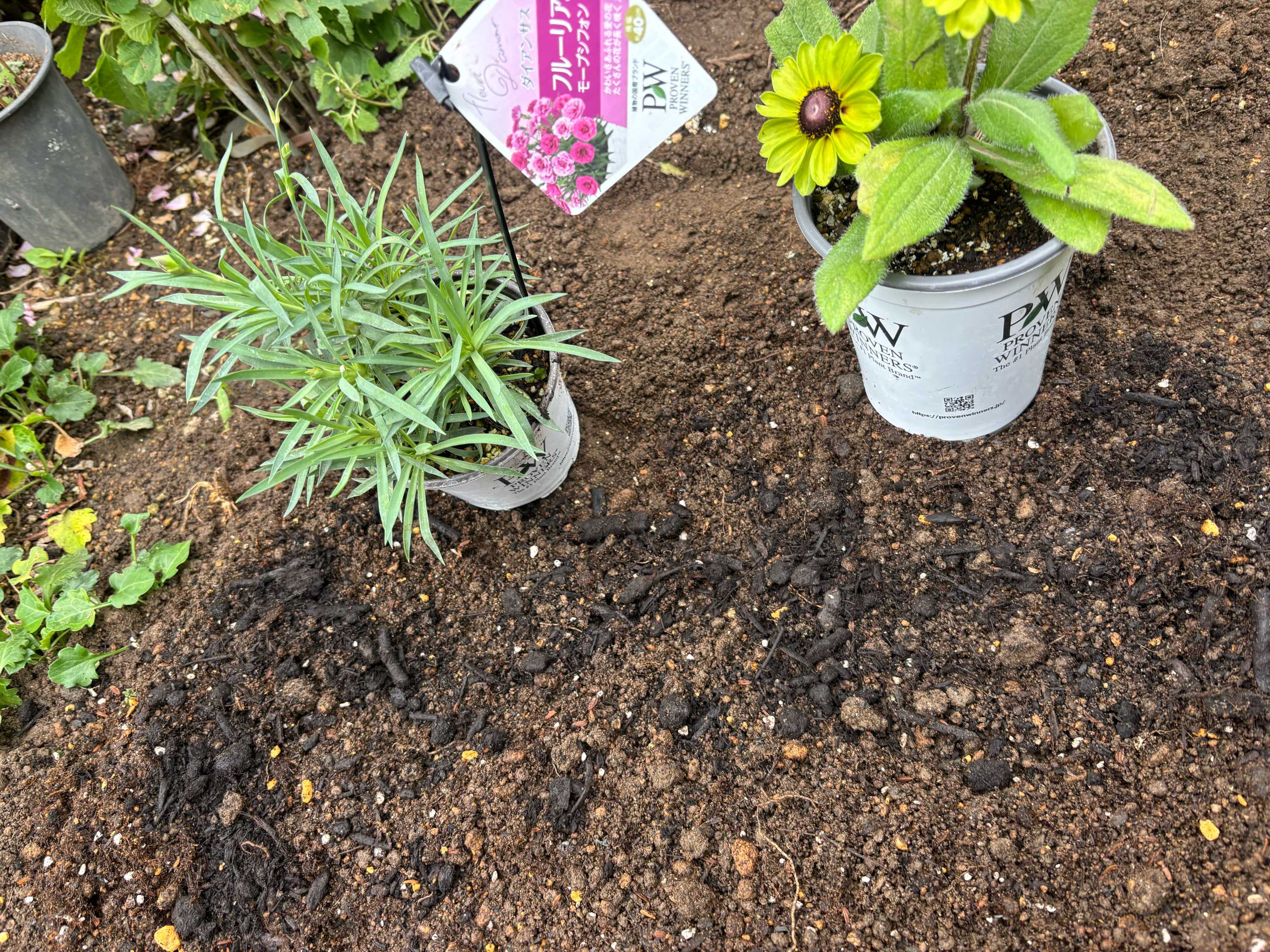 そばにあるダイアンサスフルーリアムールモーヴシフォンは、地植えにしようと思って持って来ましたが、夏の蒸れを考えて、鉢植えにすることにします。