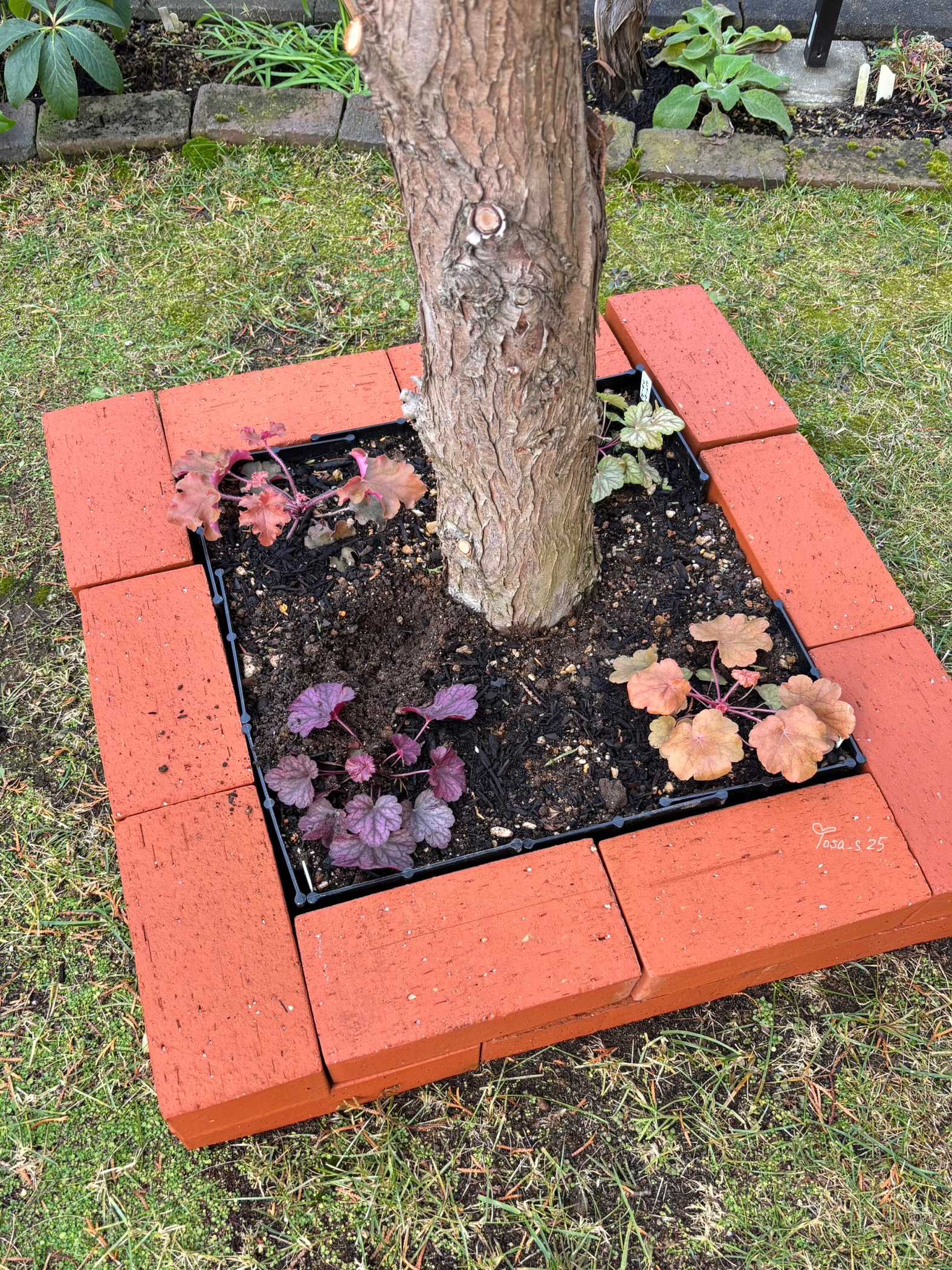 芝生が思うように育たない木の下に花壇を作ることにしました🍀ヒューケラドルチェも植えられて明るくなり一石二鳥✨スクスク育ちますように☺️