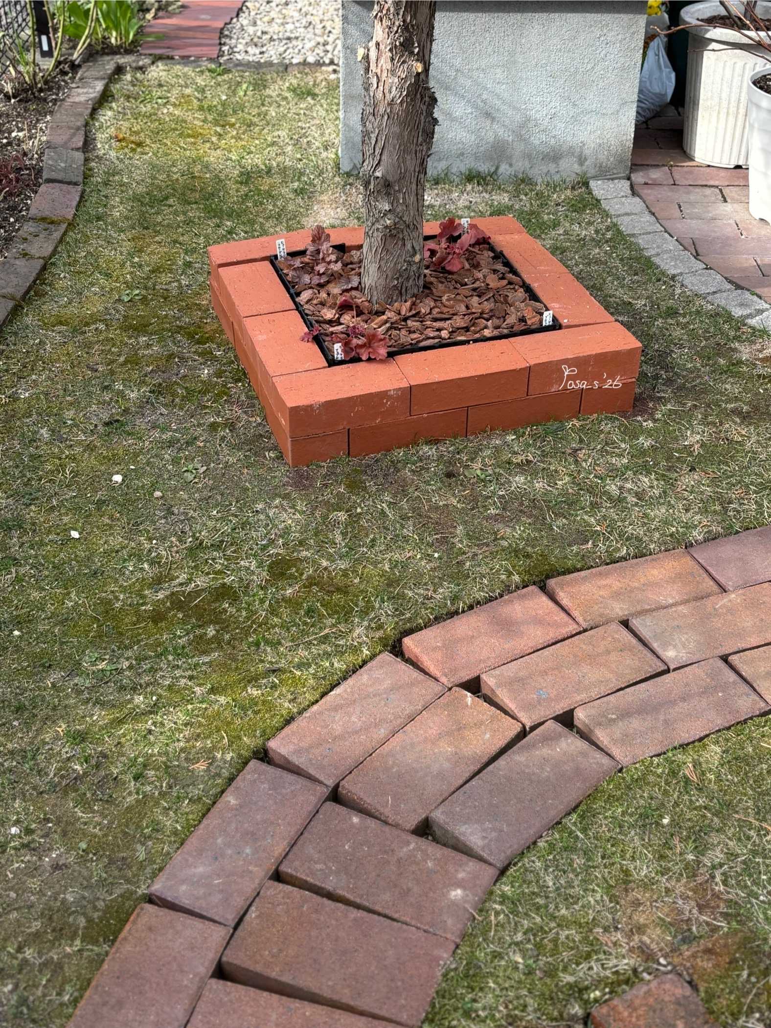 左花壇のレンガを増やし小道にして