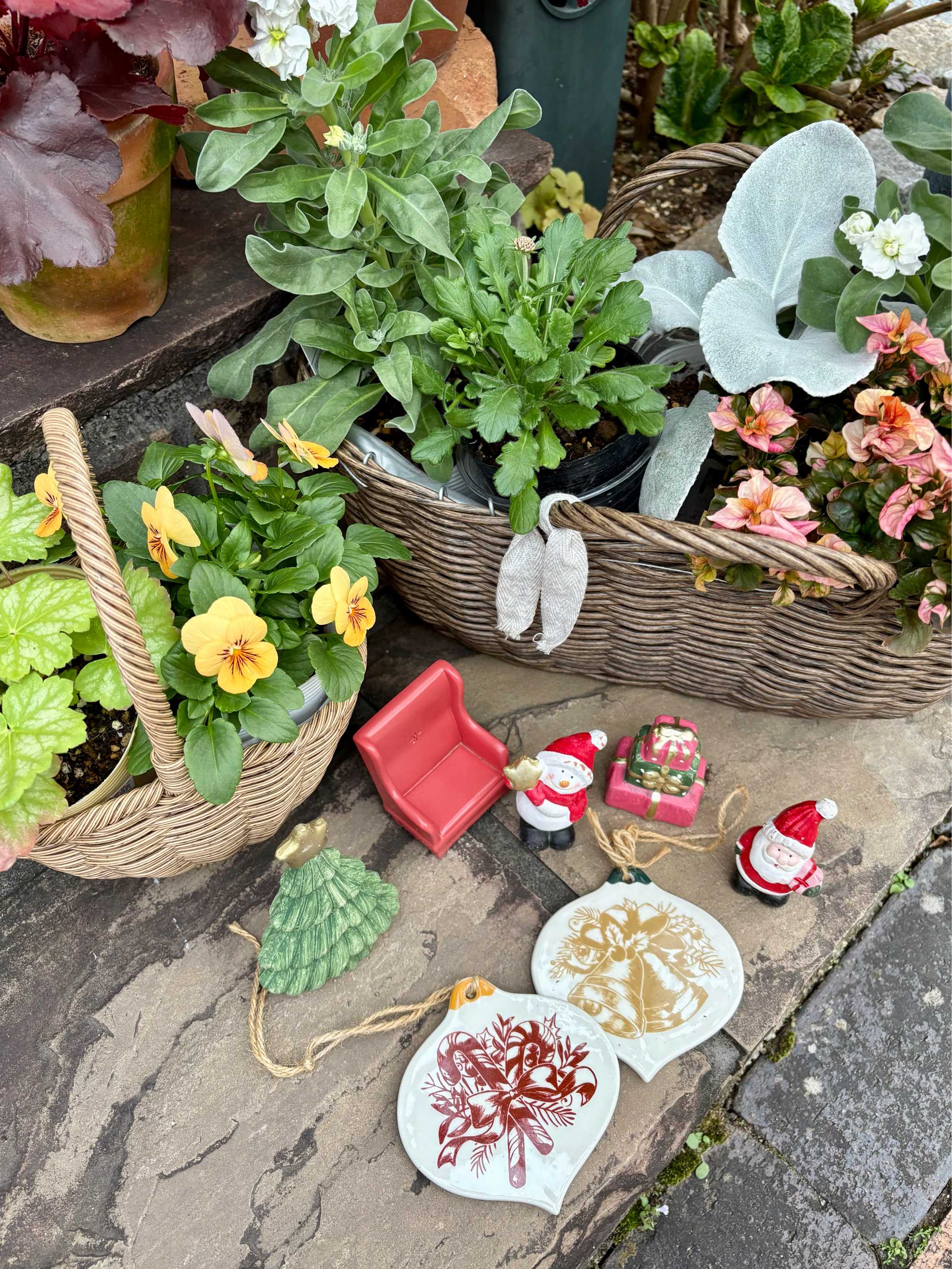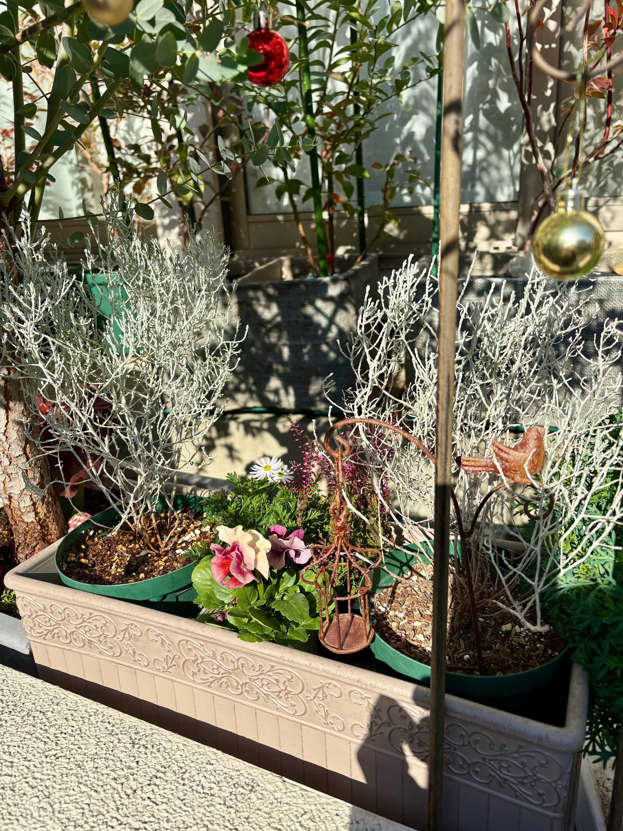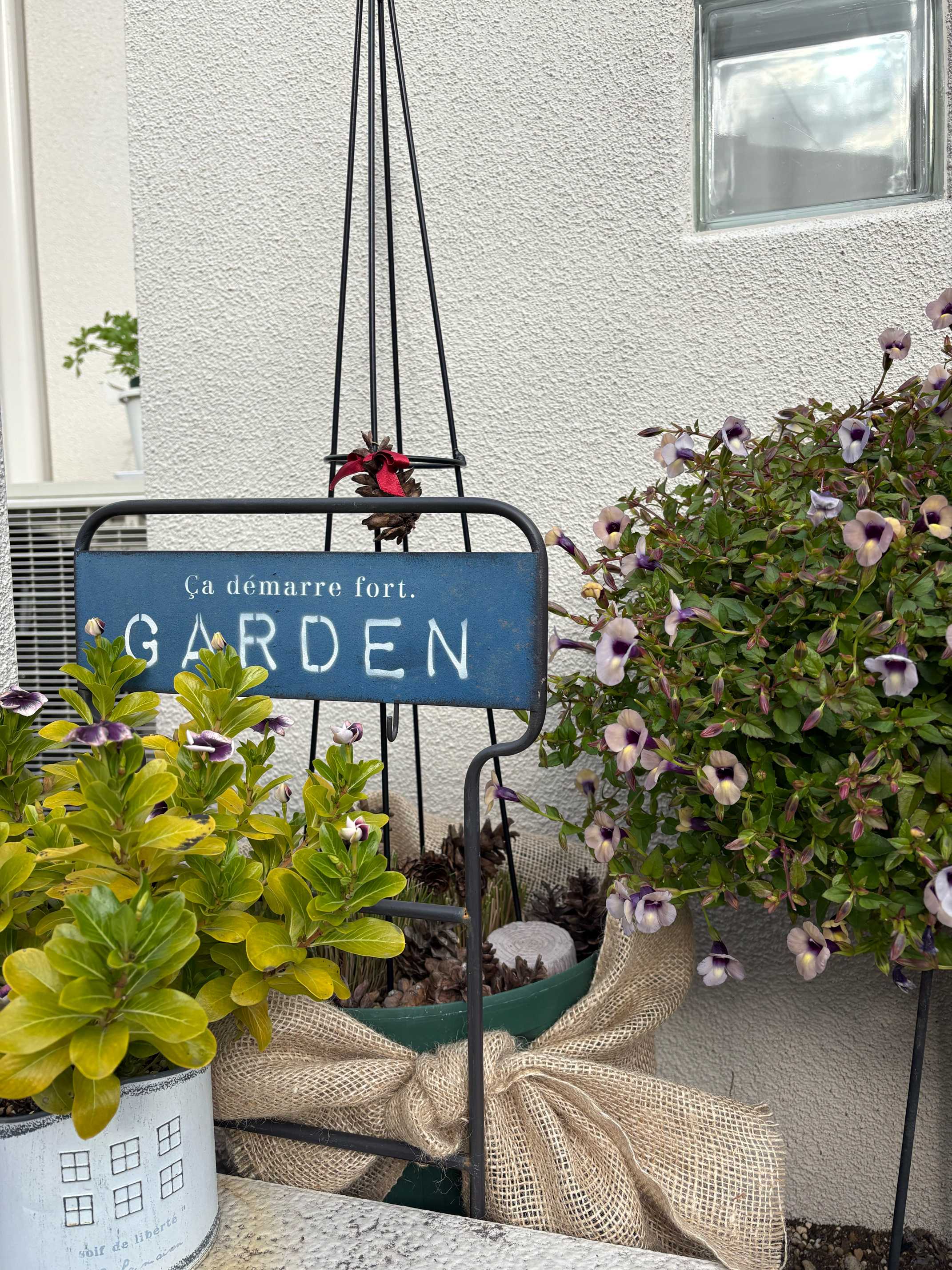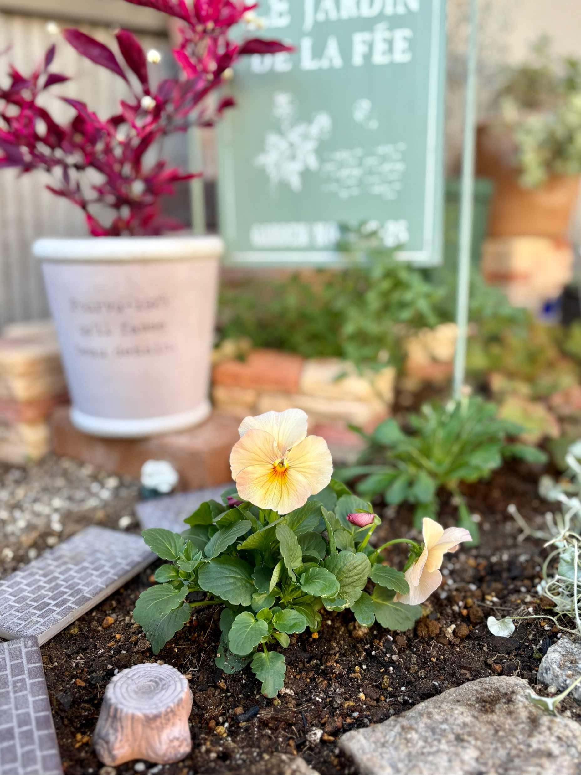 パンジー周りの土の面積が広いので、ガーデン雑貨でデコレーション。