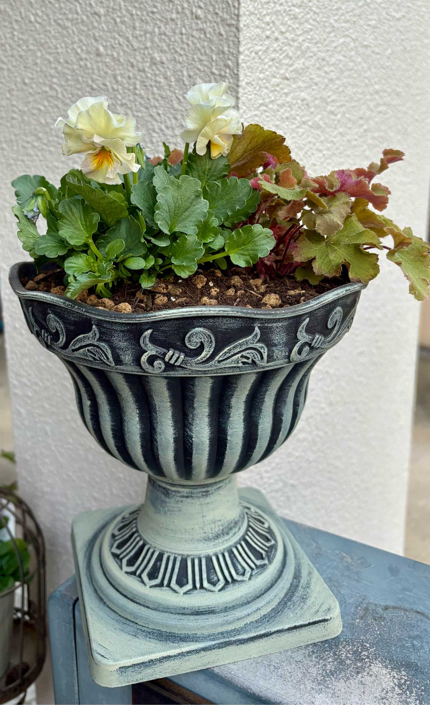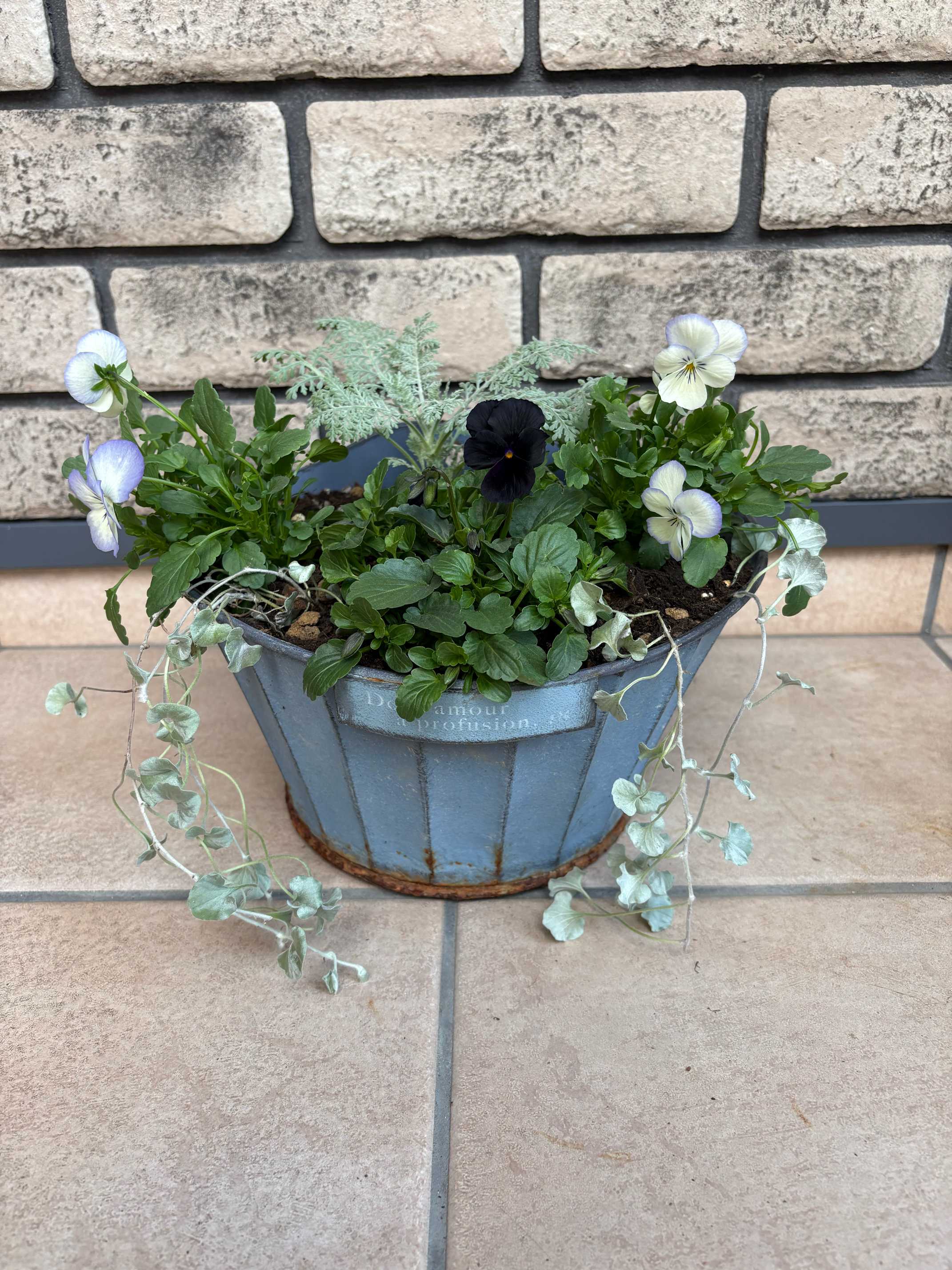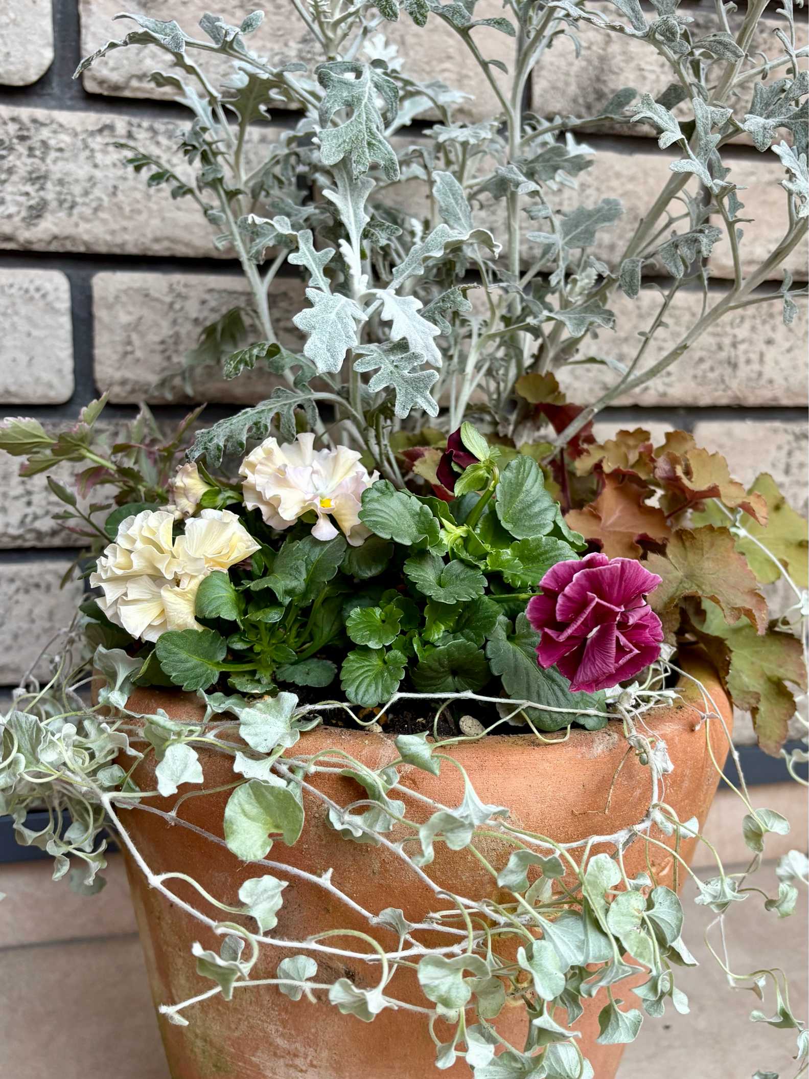 ブラックカラーのビオラに憧れ、今年初購入!ブラック、淡いブルーやホワイト、シルバー系でシックにまとめました。