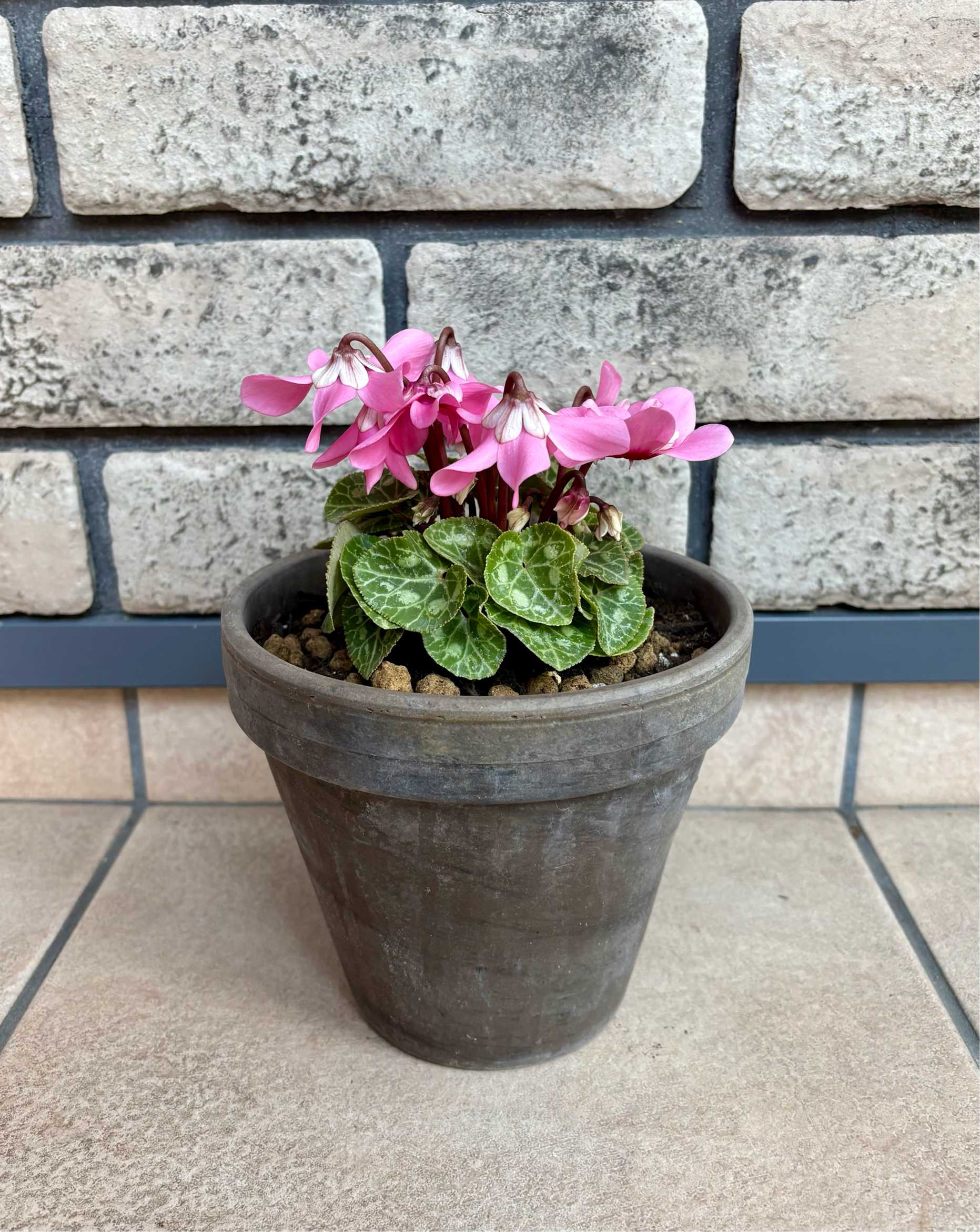 シクラメンの色味が落ち着いたワインレッドなので、焦茶の鉢でアンティークな雰囲気にしました!