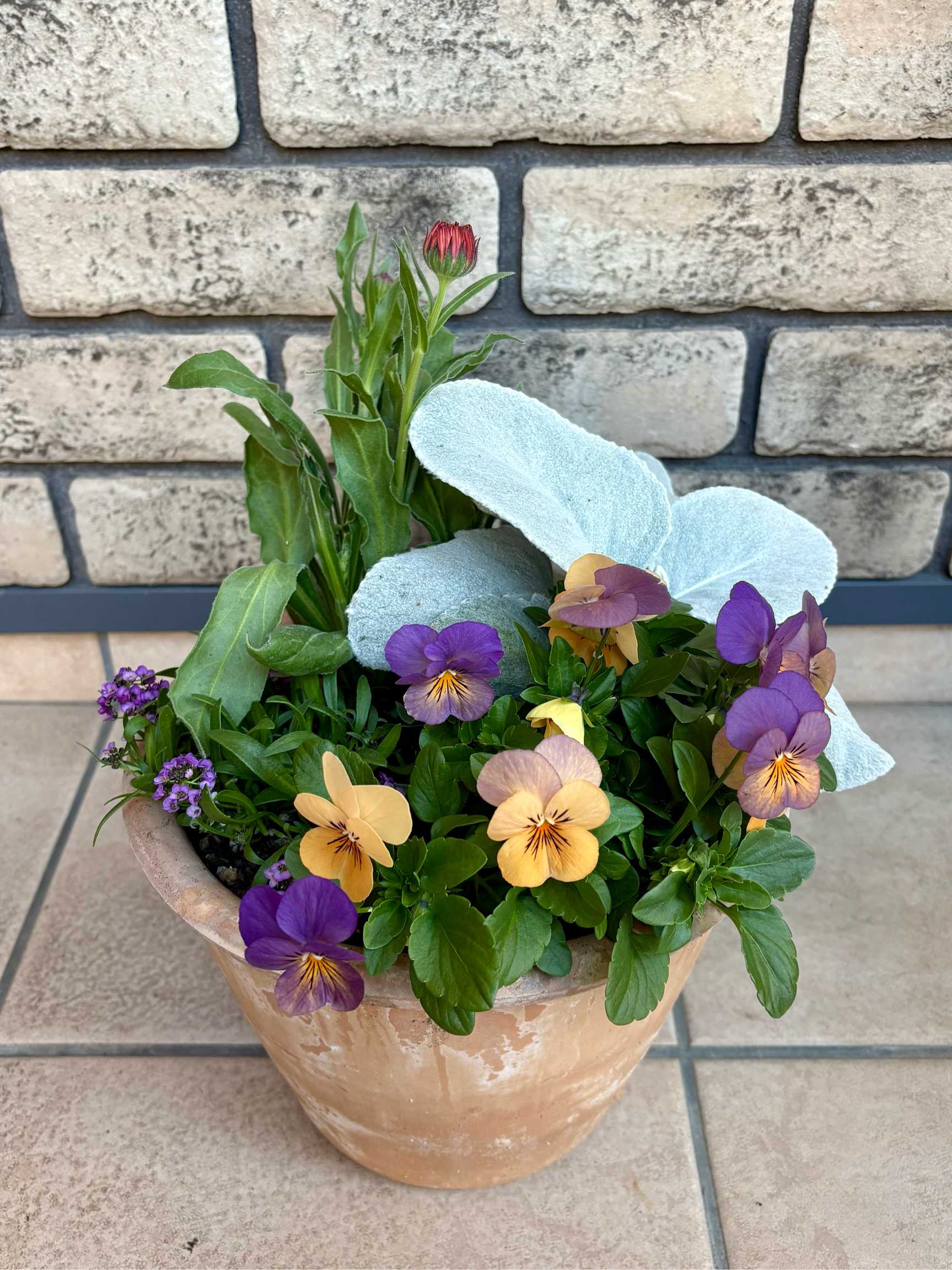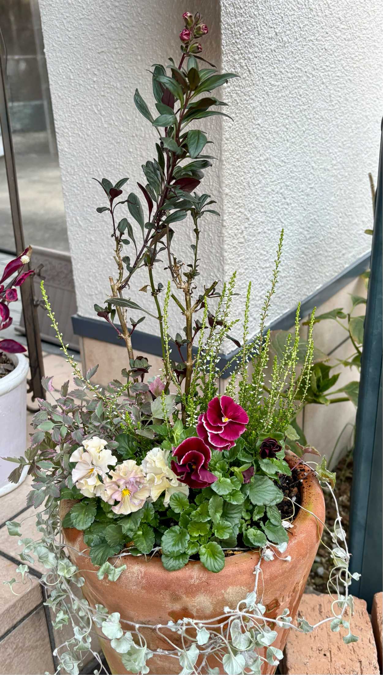 花色の可愛らしいピンクとチョコカラーの鉢で、ストロベリーチョコを連想しながら植え付けました 笑