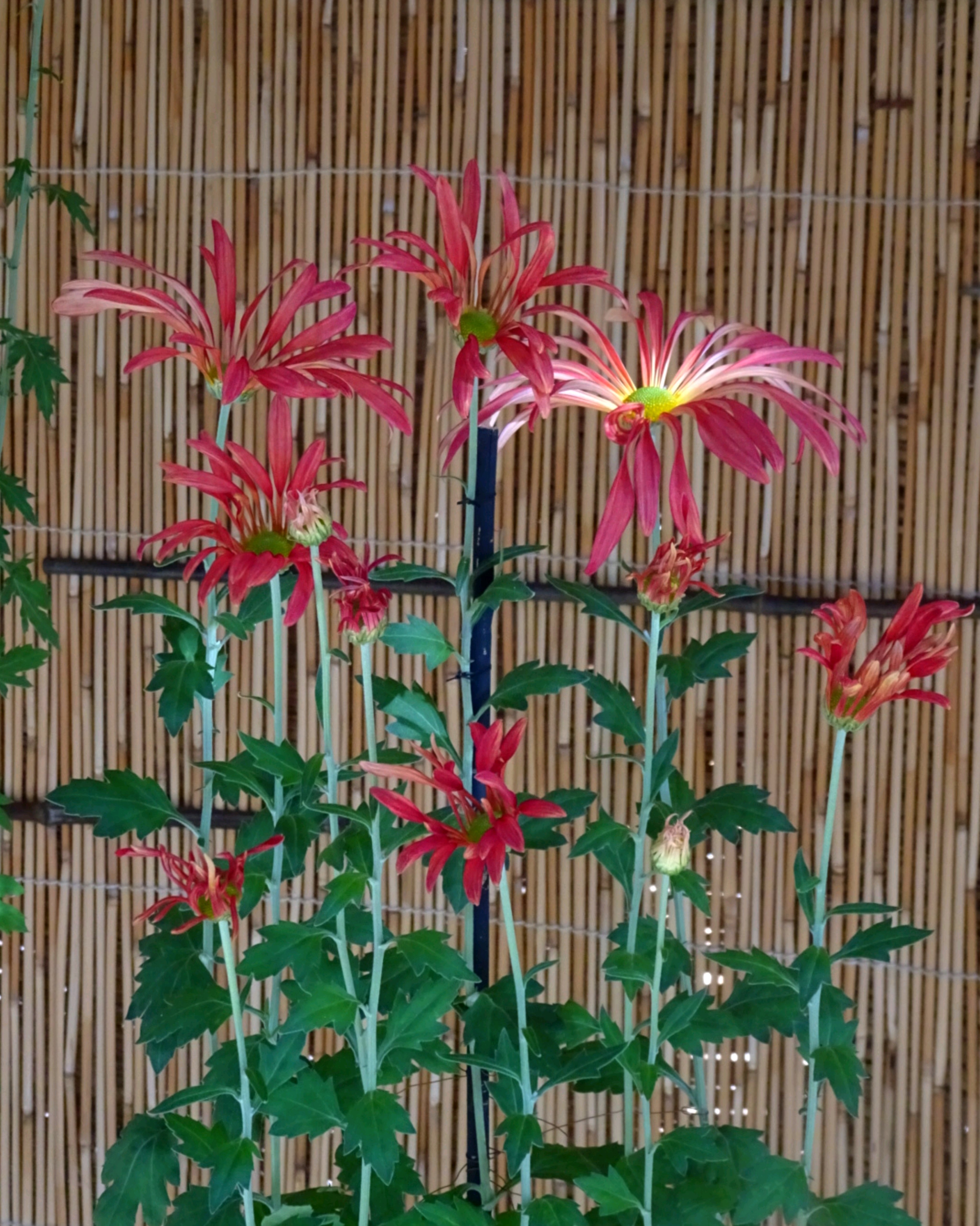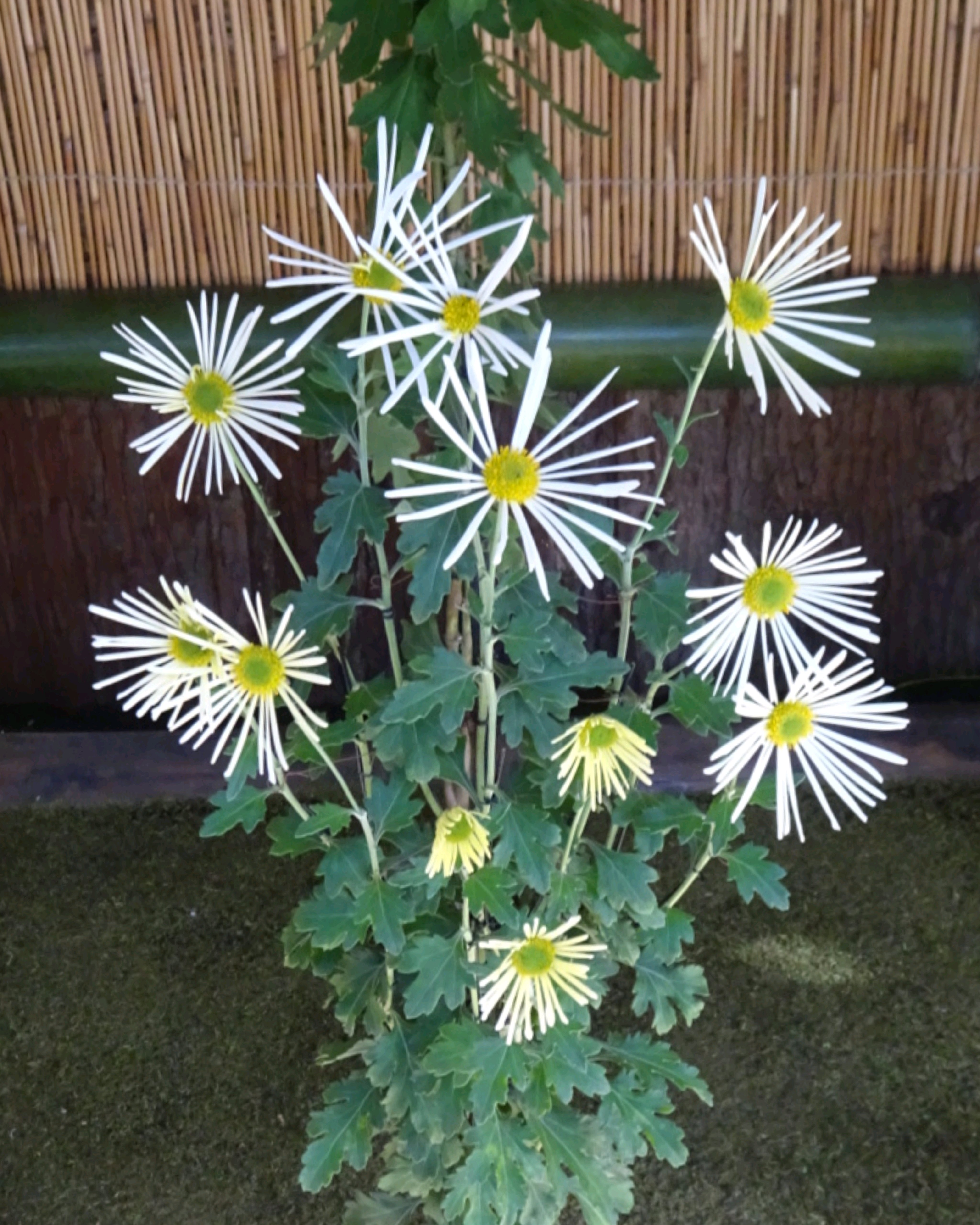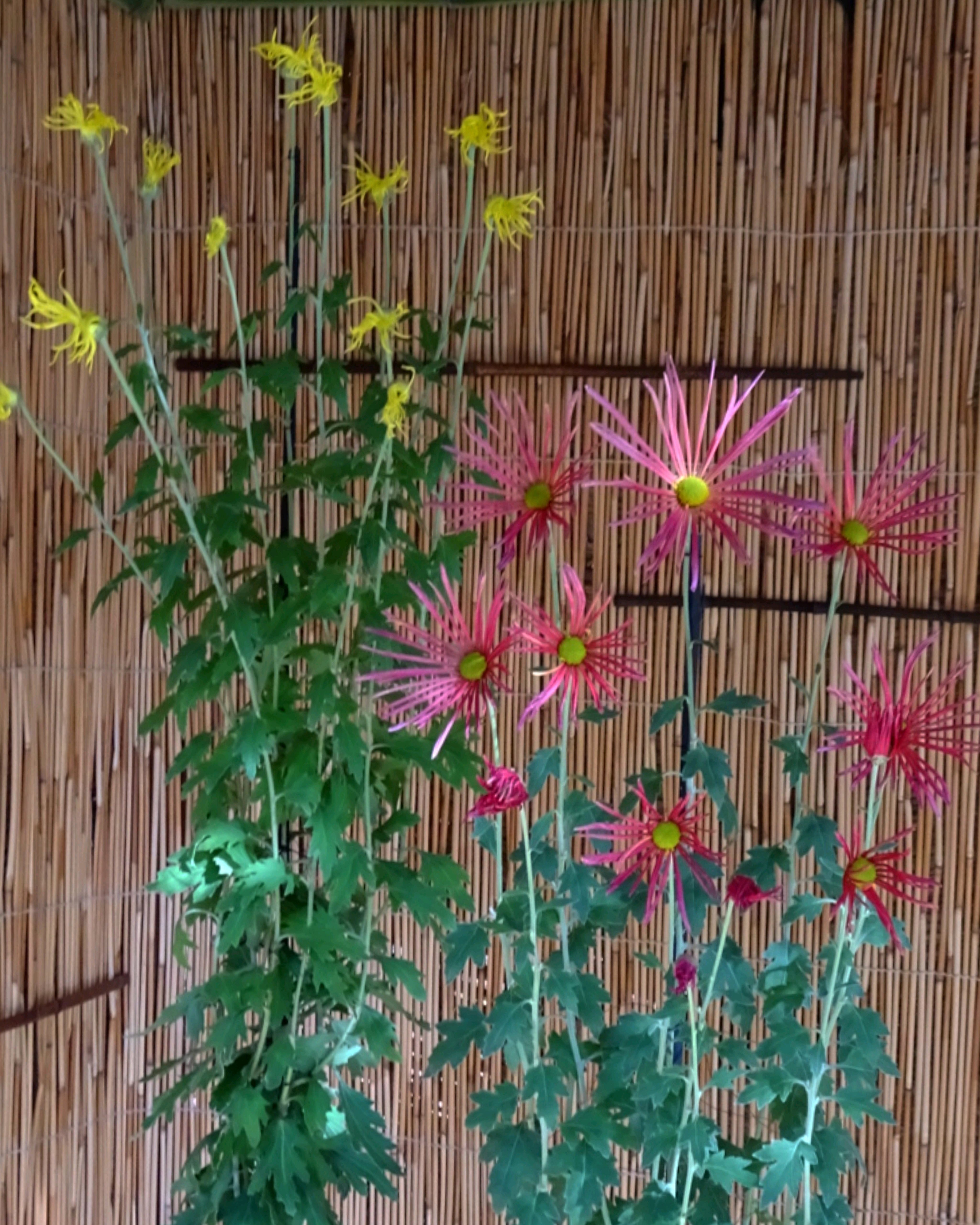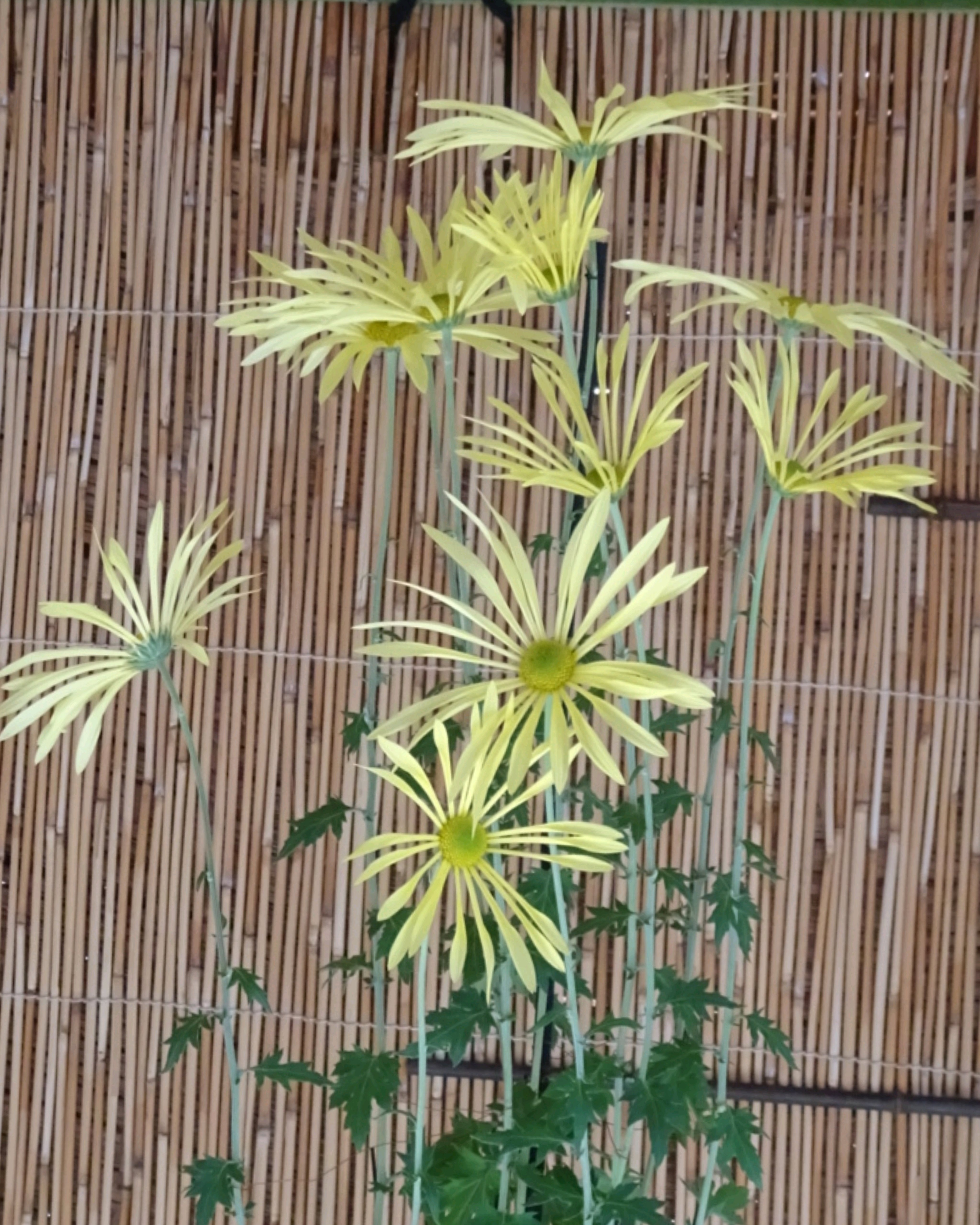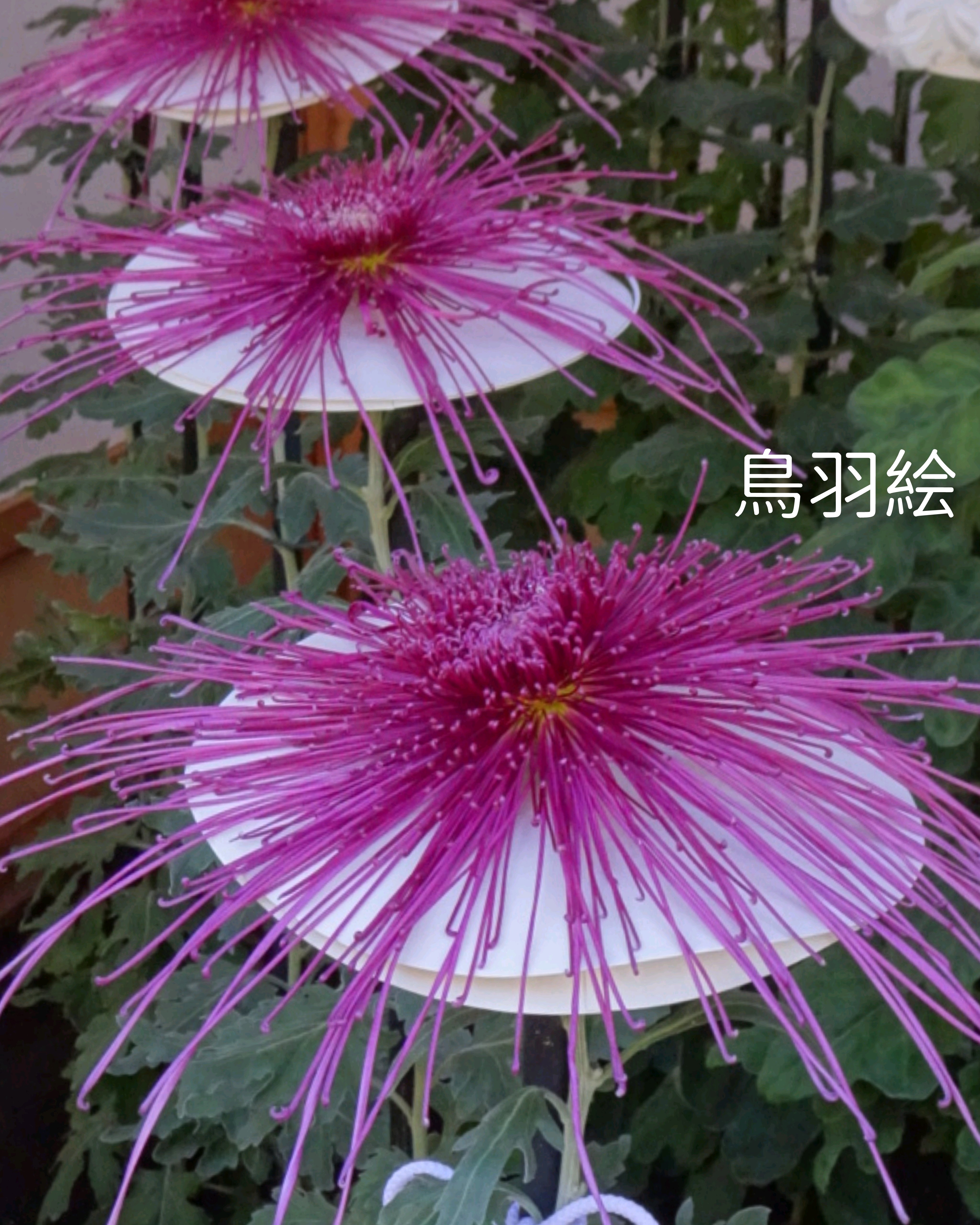 一文字菊と管物菊が交互に並べられていました。厚紙で支えて大きく開いた花びらを美しく見せていました