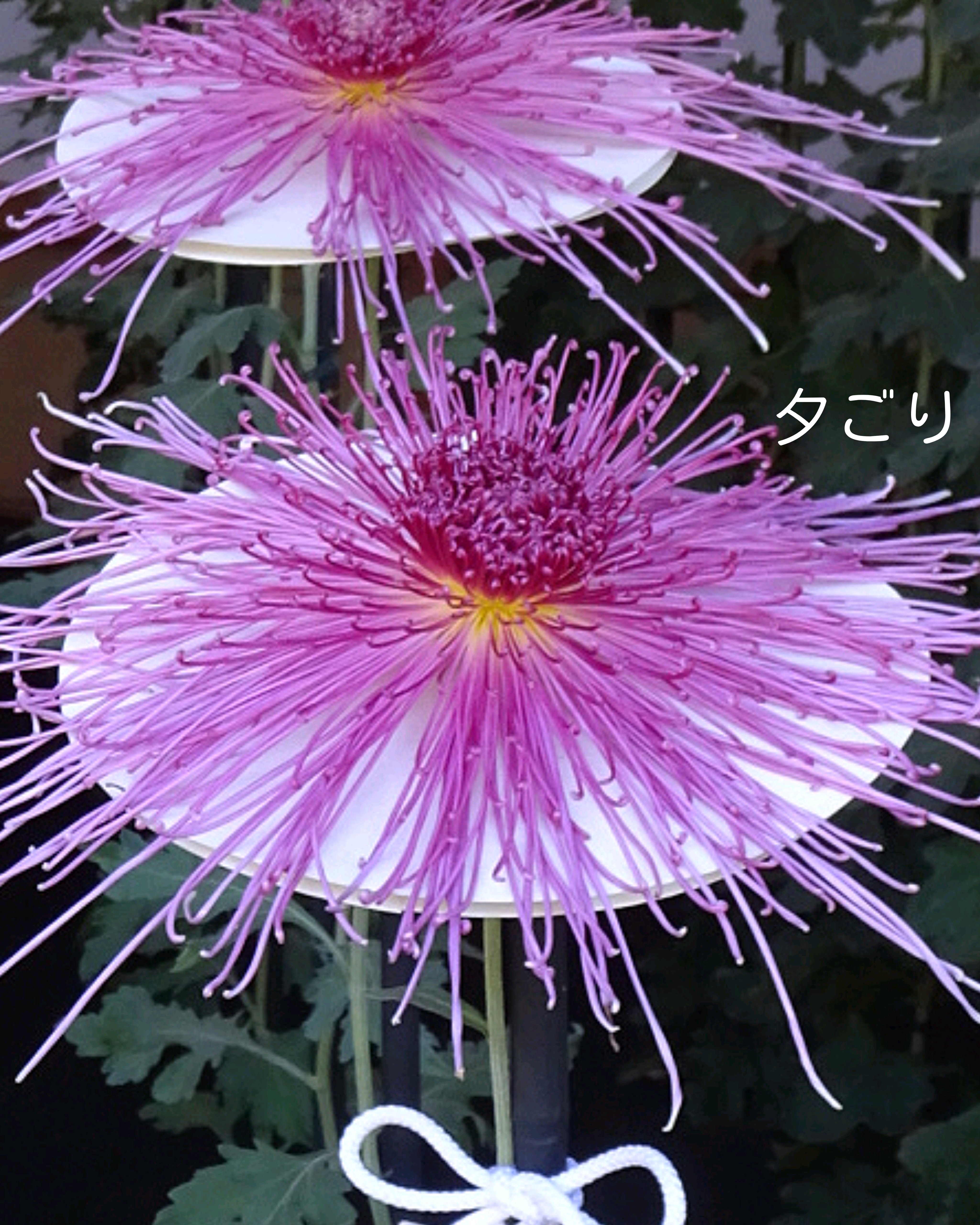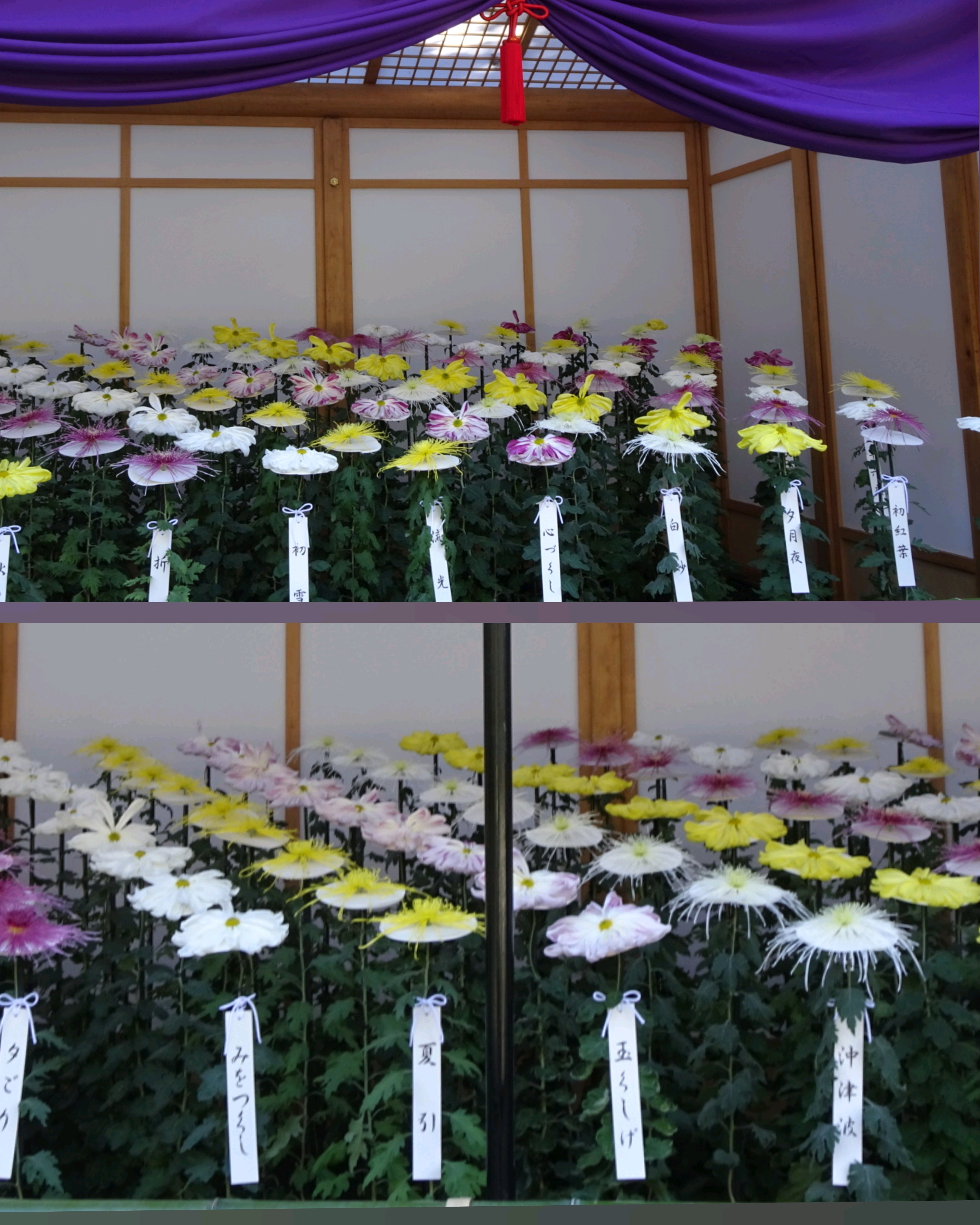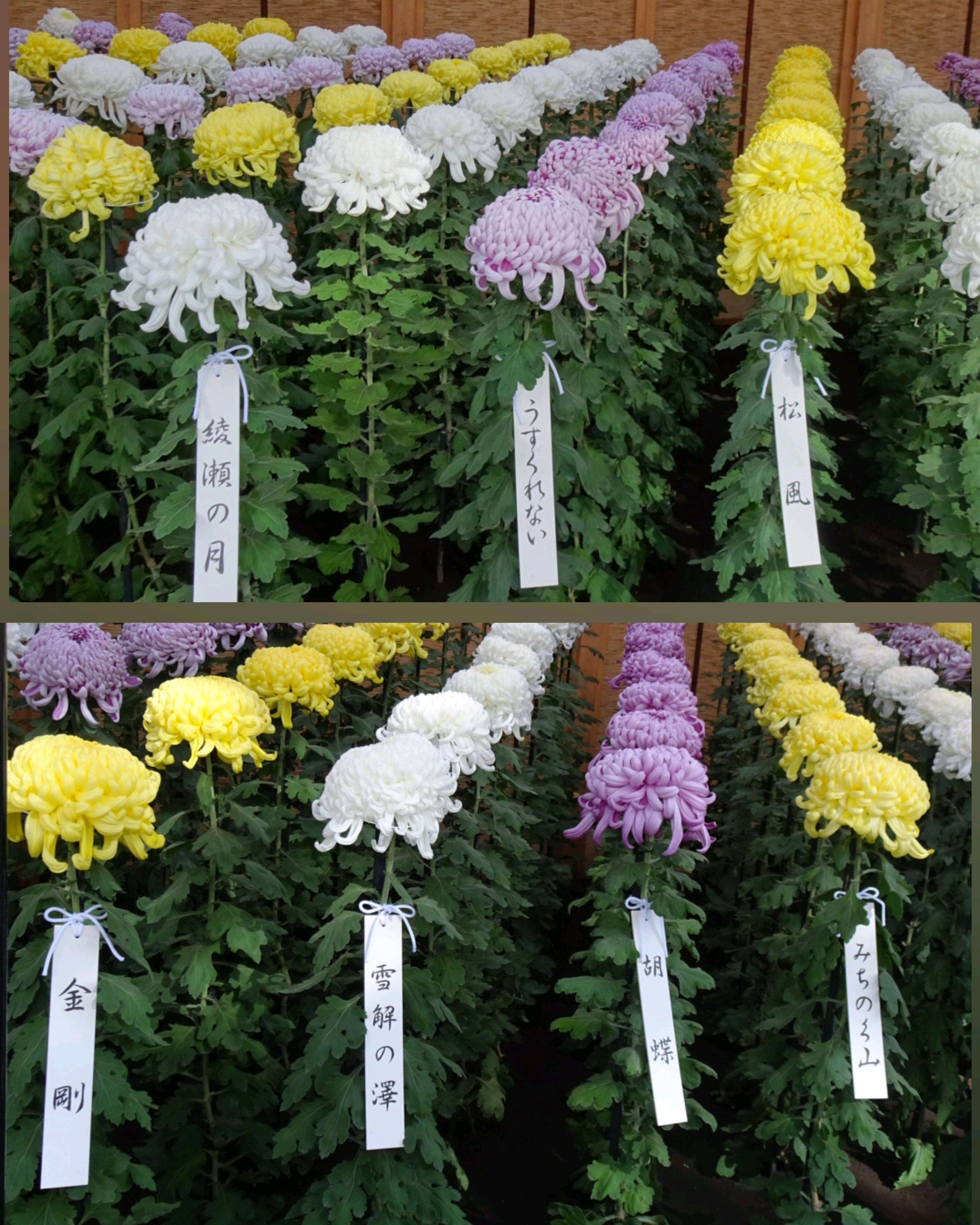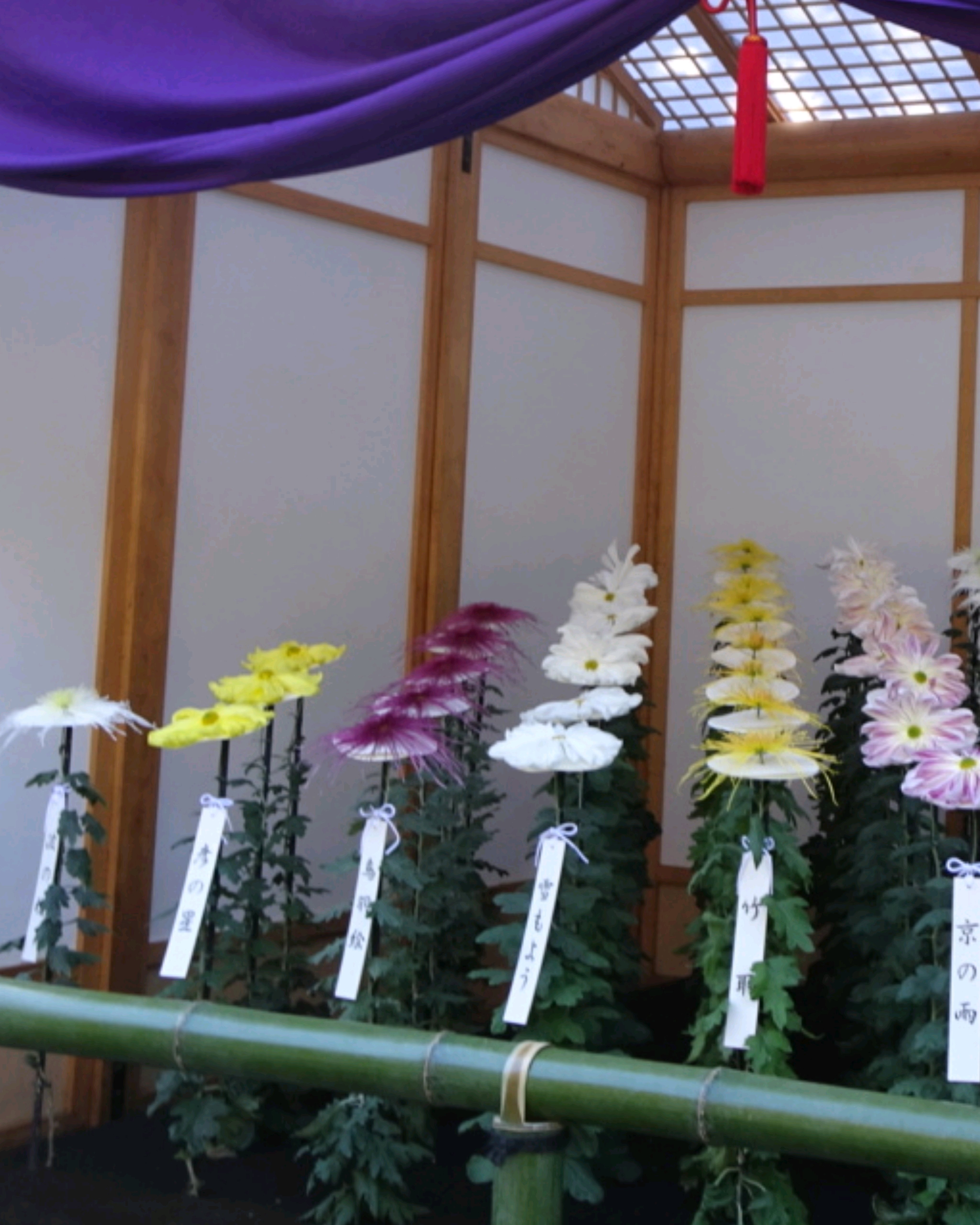 一文字菊と管物菊が交互に並べられていました。厚紙で支えて大きく開いた花びらを美しく見せていました