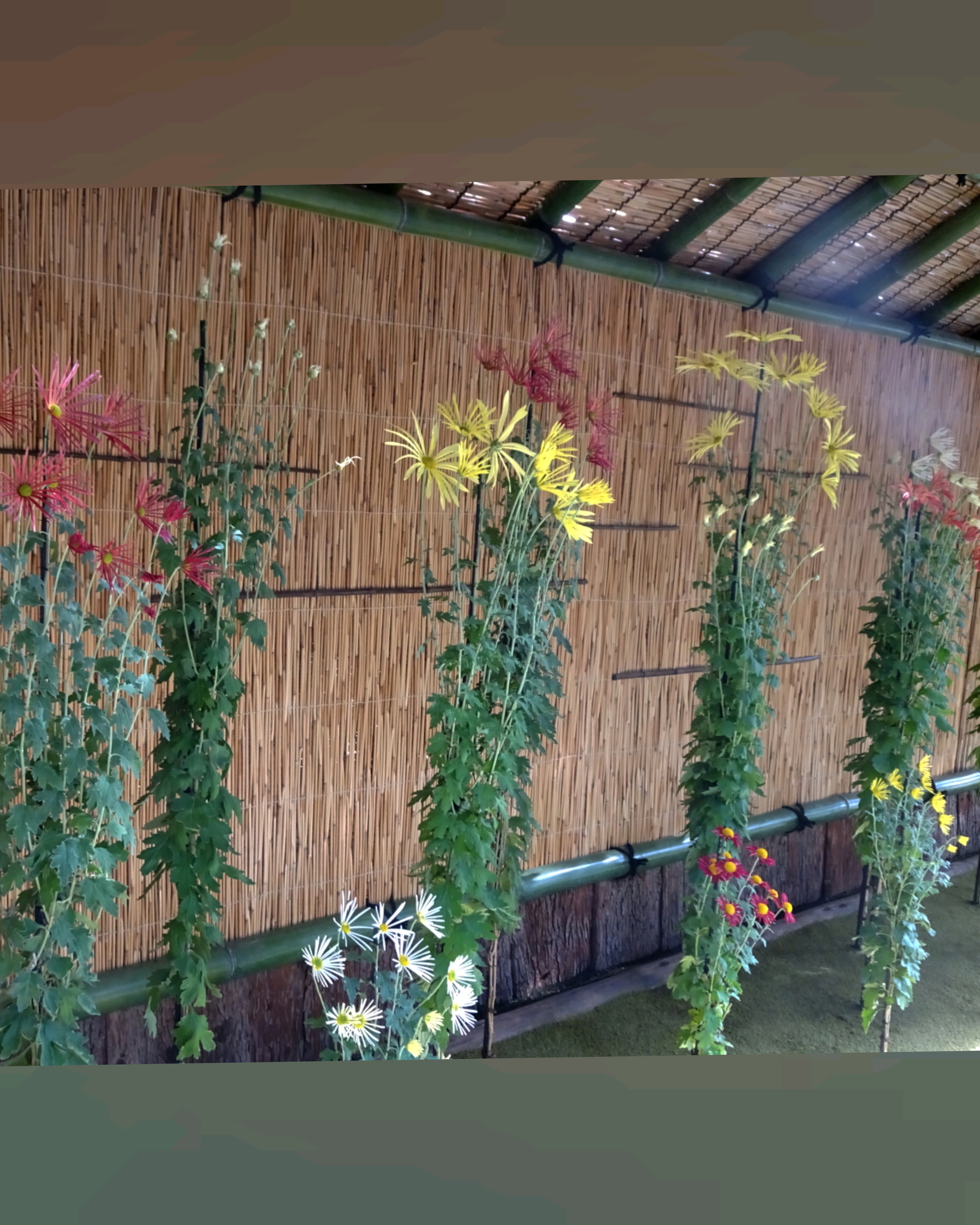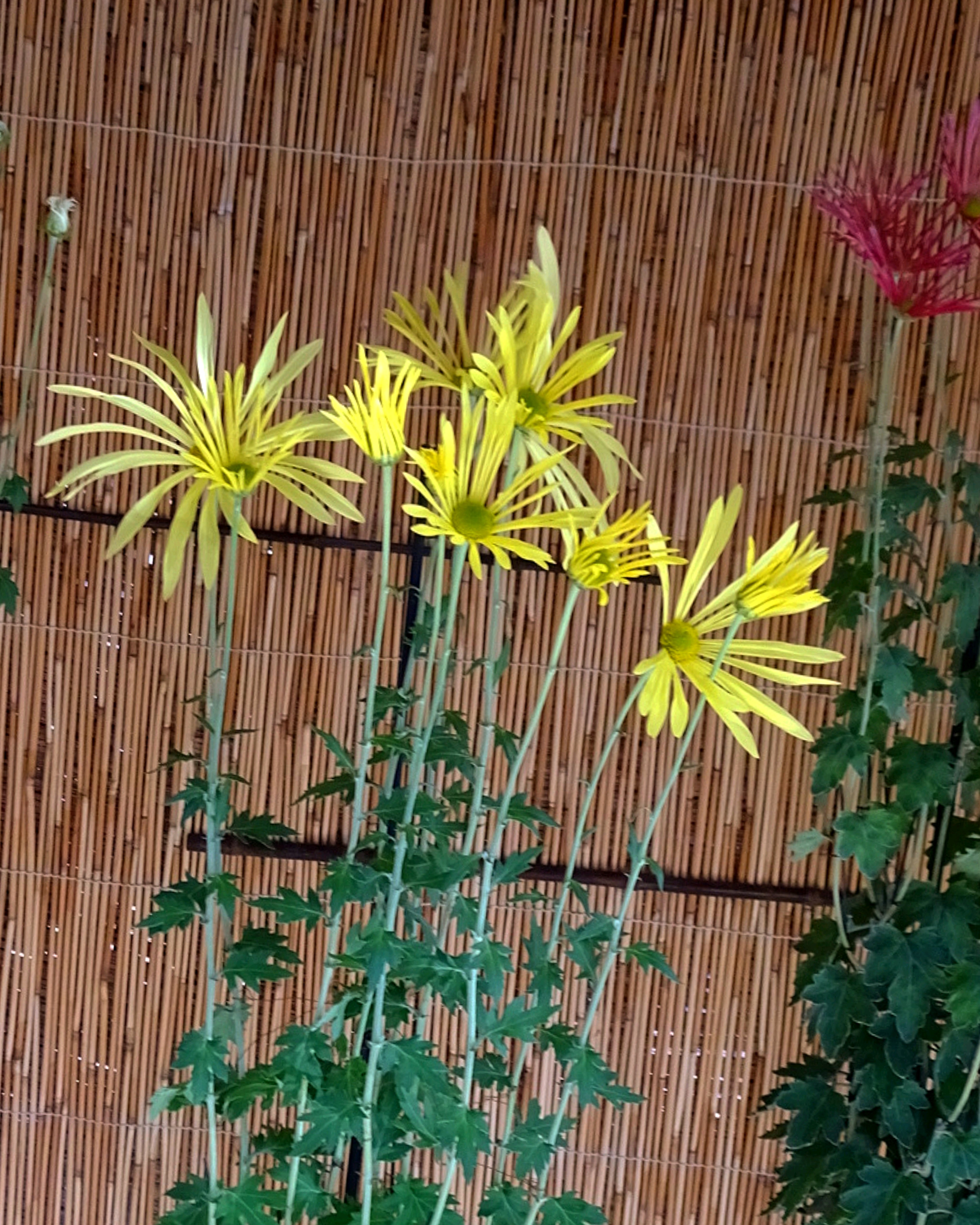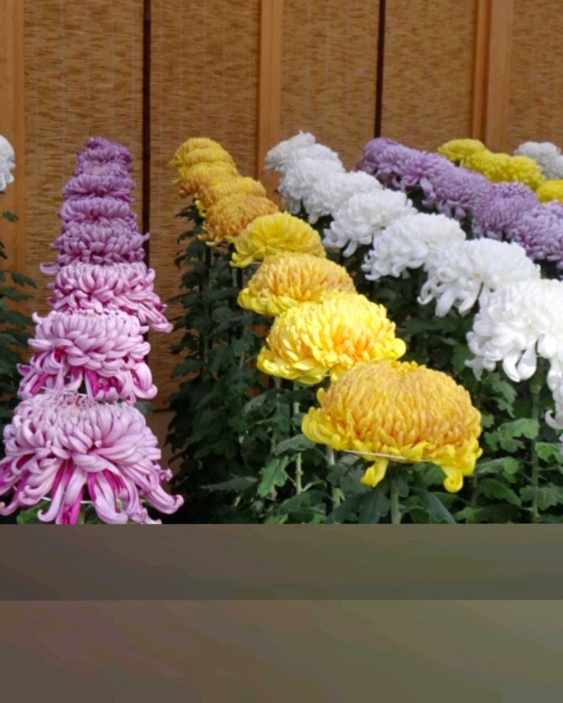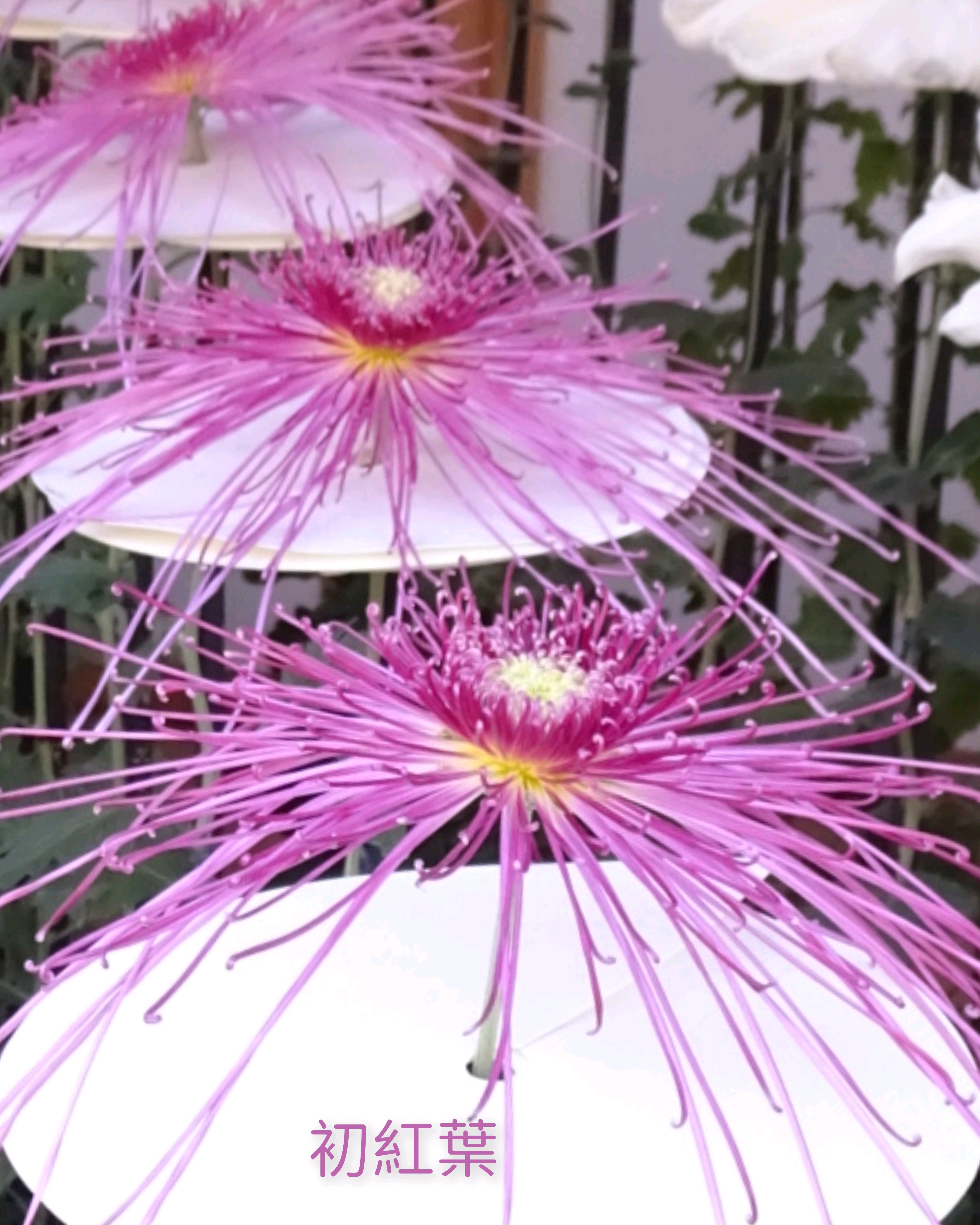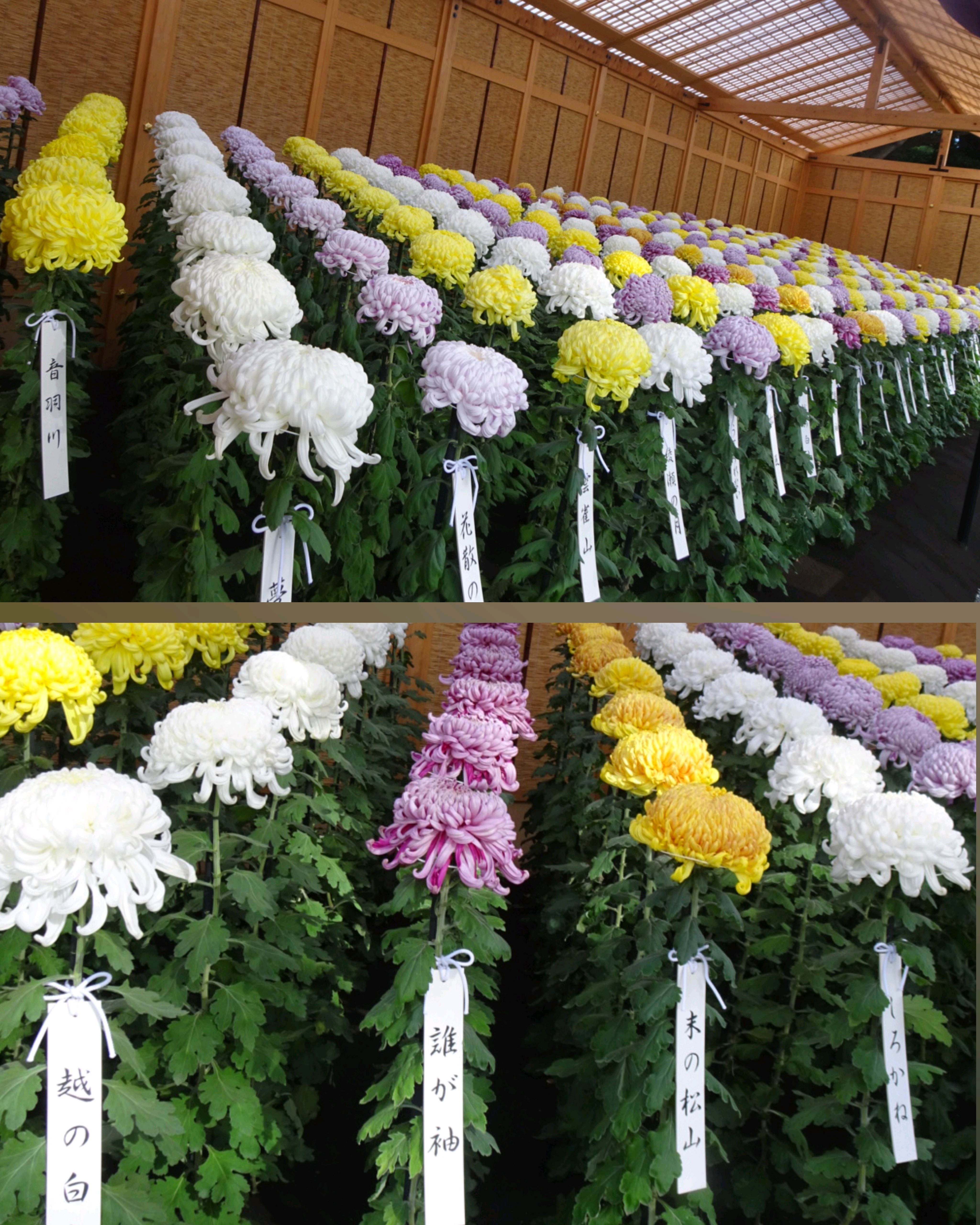 一文字菊と管物菊が交互に並べられていました。厚紙で支えて大きく開いた花びらを美しく見せていました