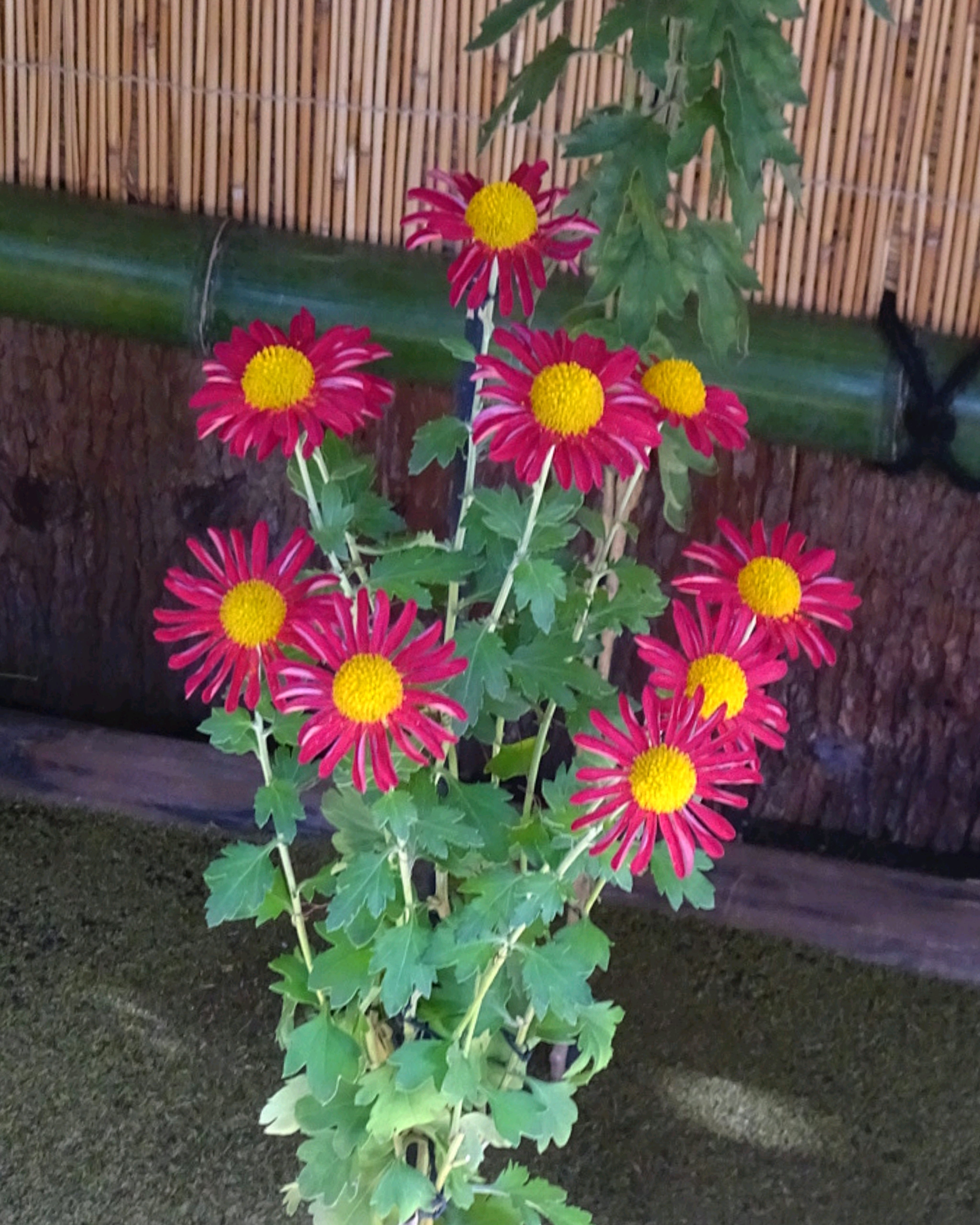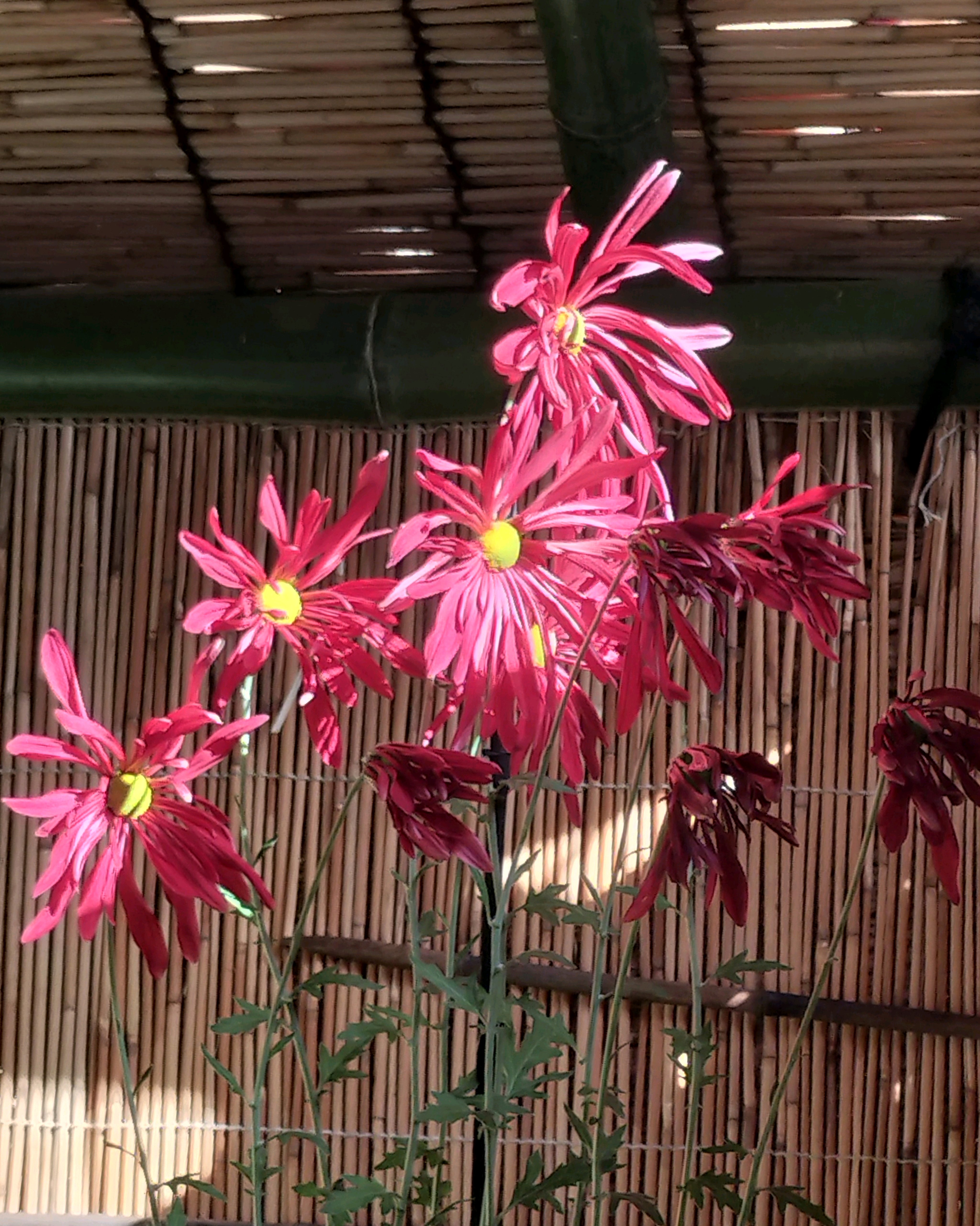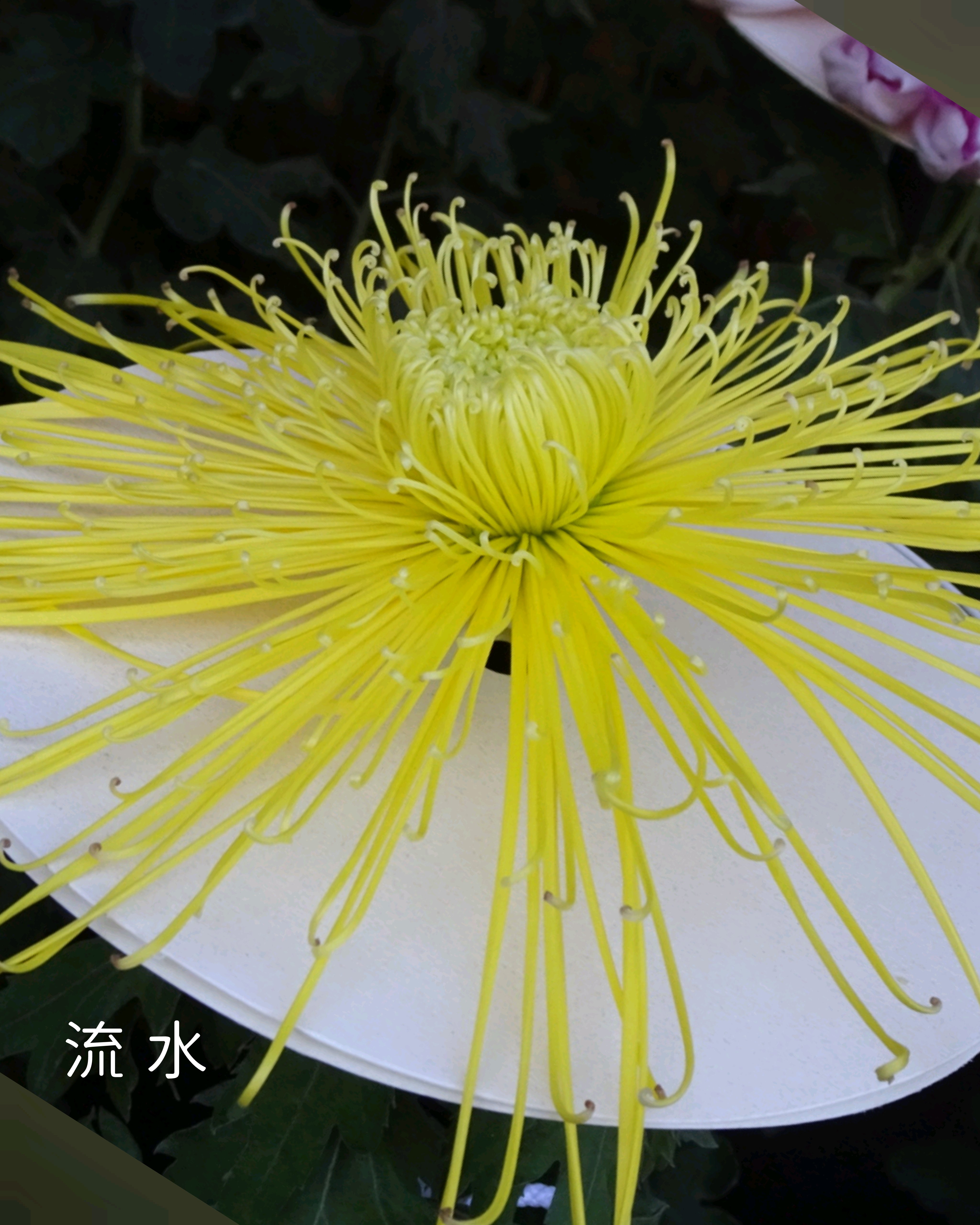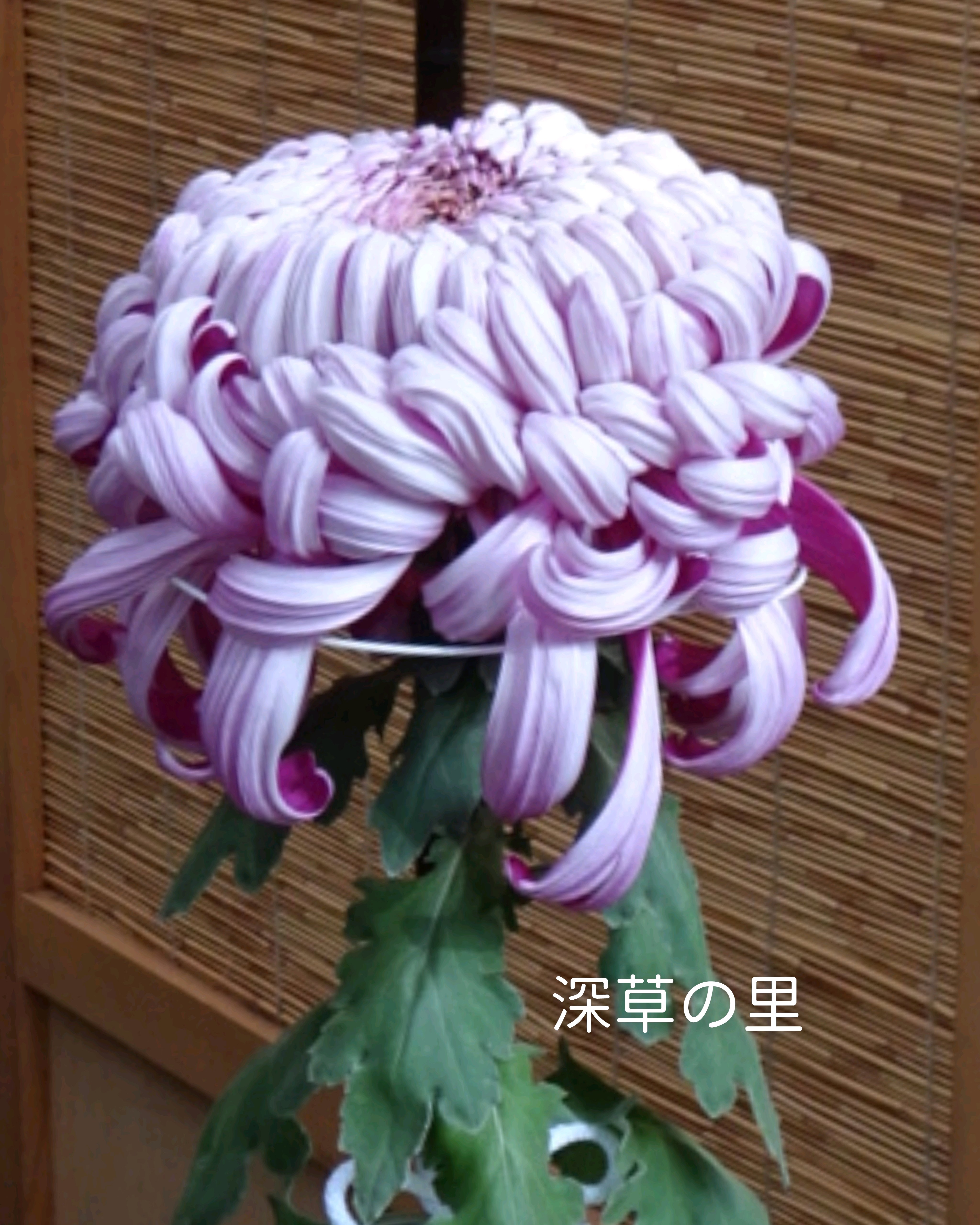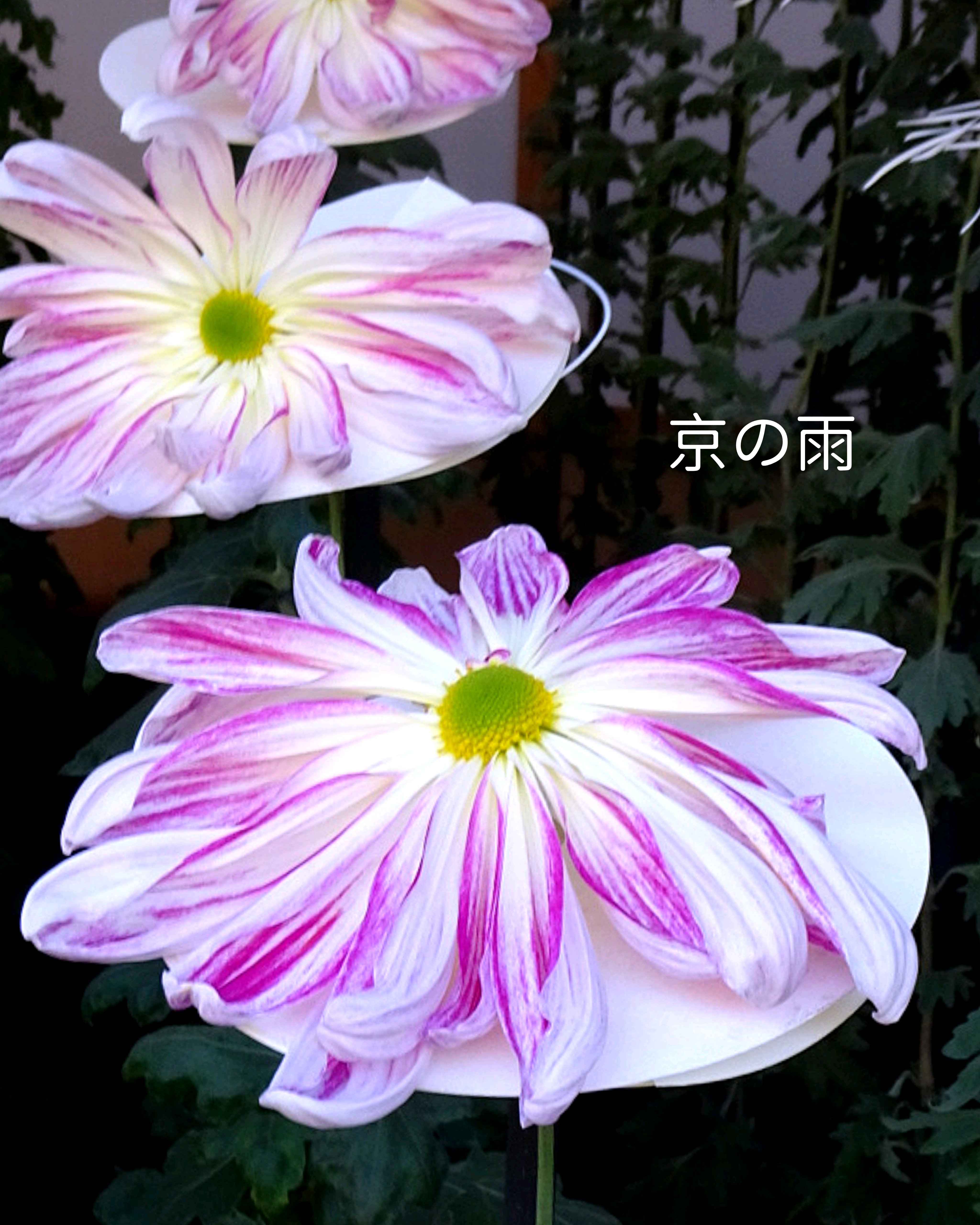 一文字菊と管物菊が交互に並べられていました。厚紙で支えて大きく開いた花びらを美しく見せていました