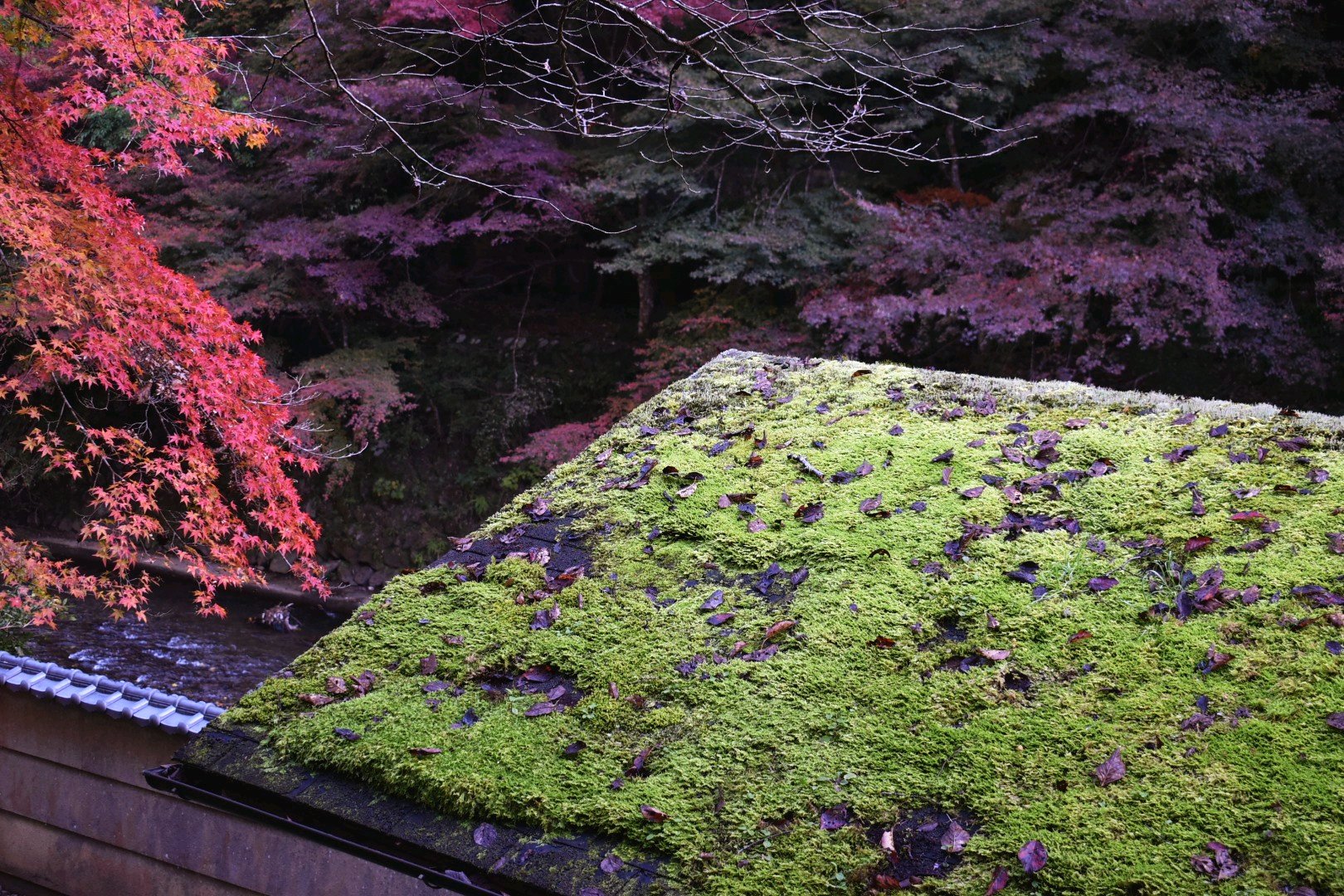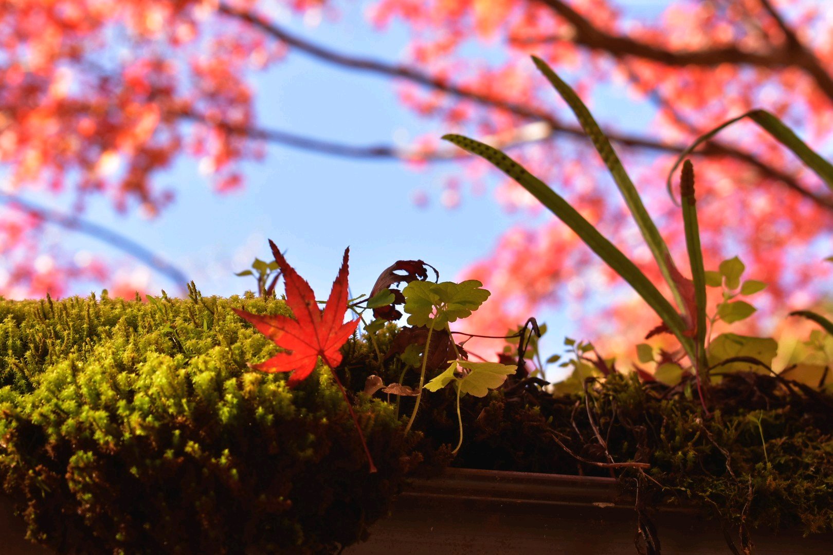屋根の上の苔と散り紅葉🍁のコラボ✨😃
