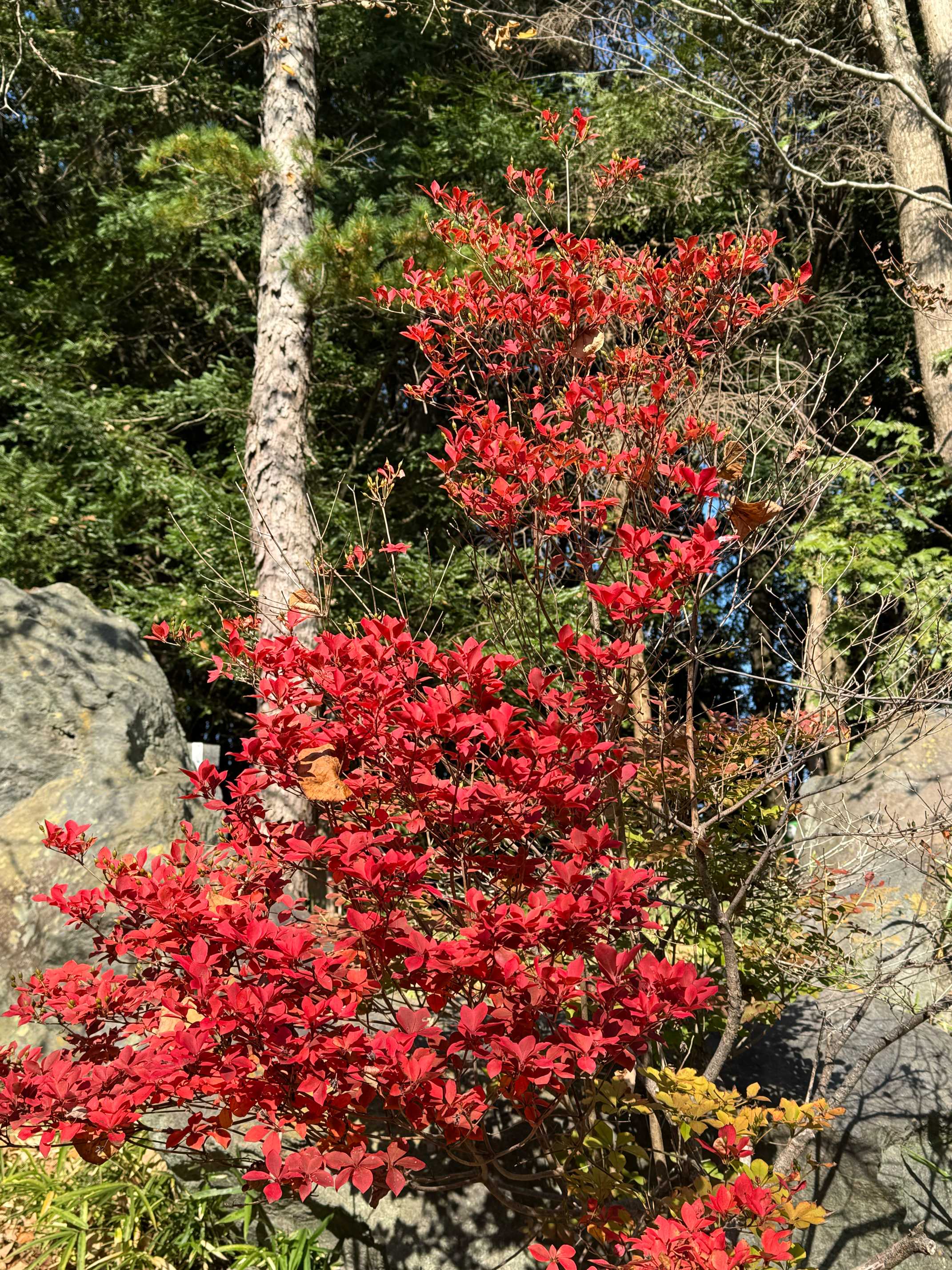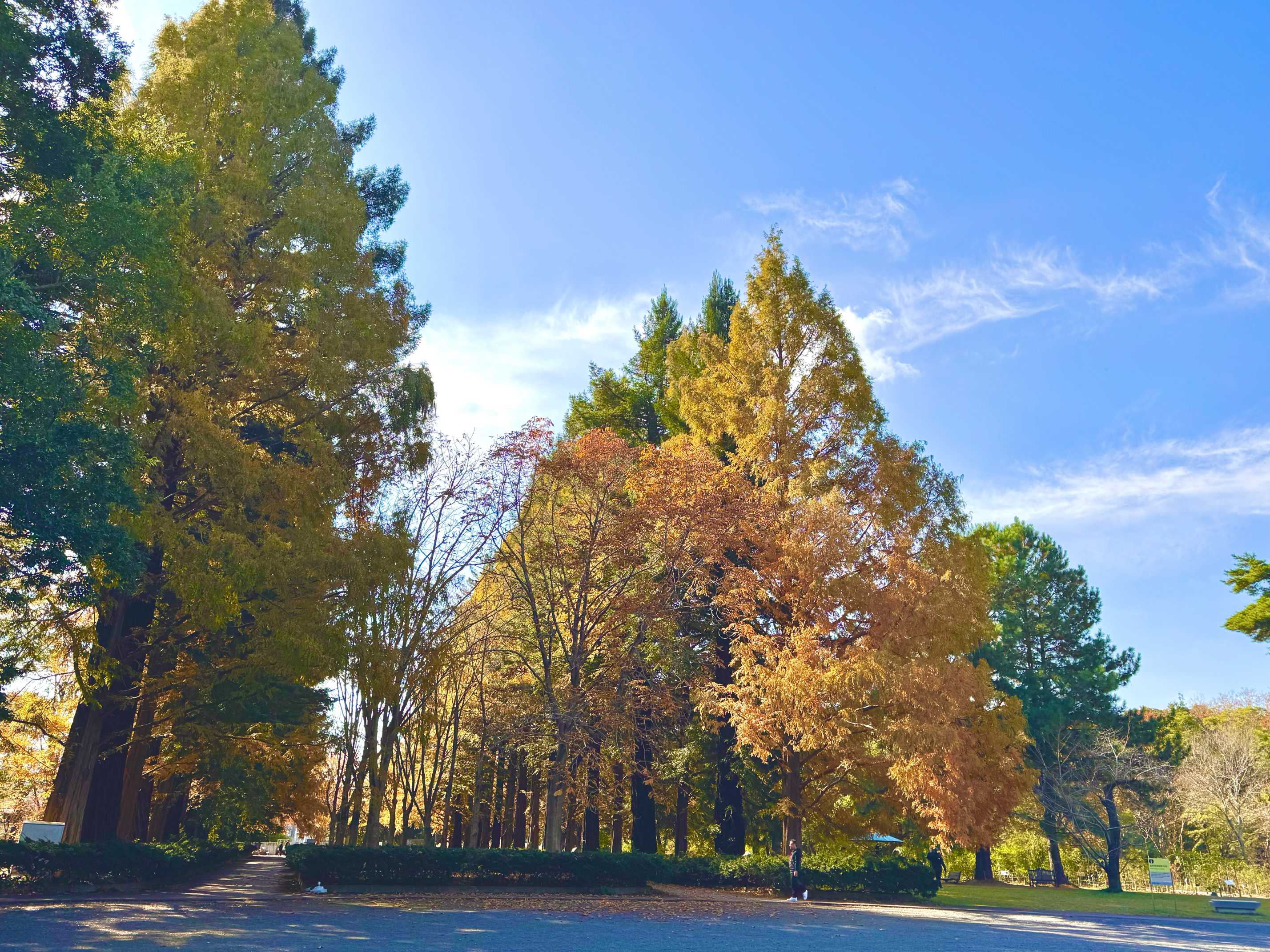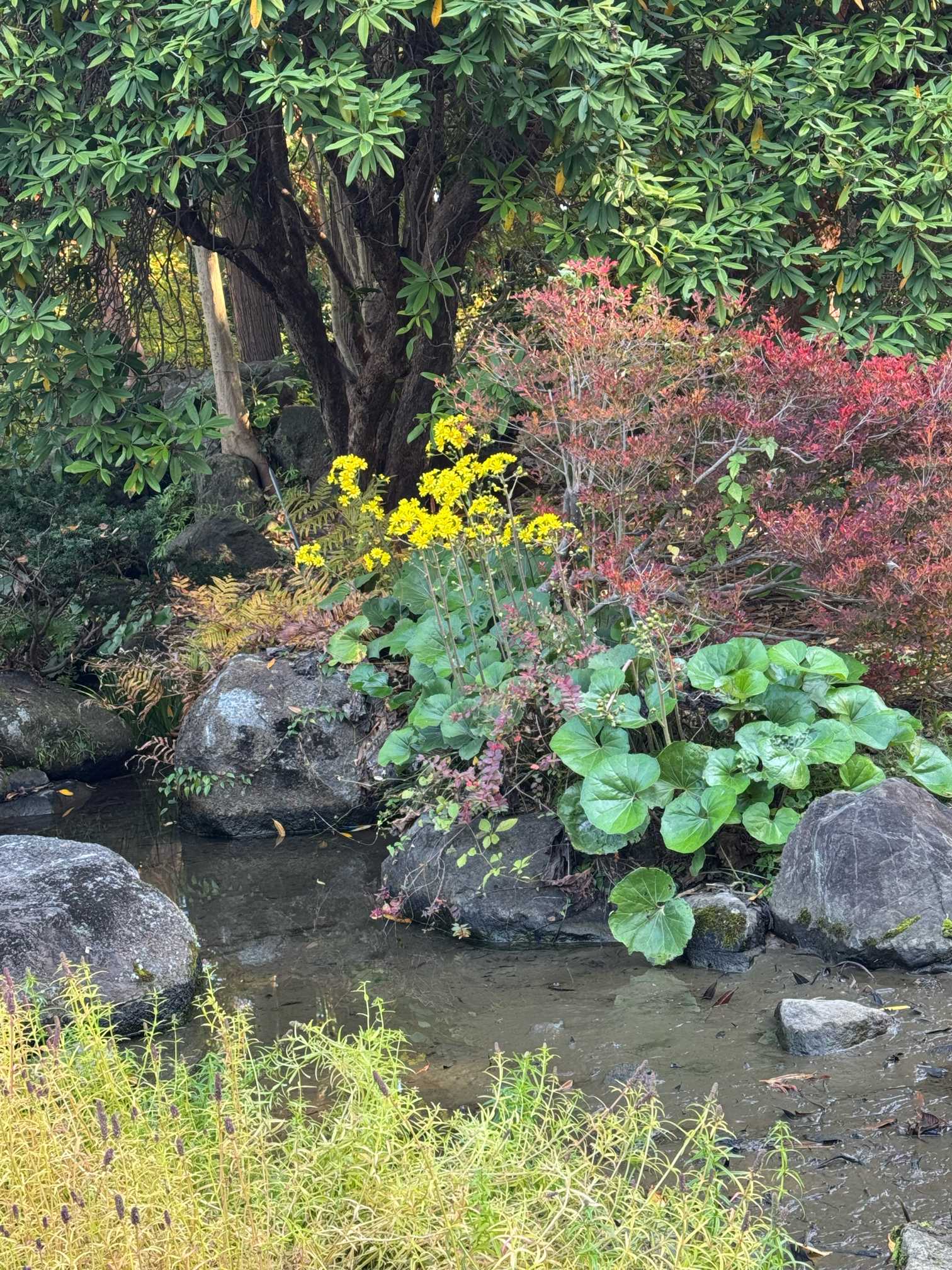 紅葉が進む樹木が、自分のカラー見せてくれます。メタセコイア、イロハモミジは、これからがもっときれいになるでしょう。コマユミは真っ赤に色づき、とてもきれいでした。カツラの木は、落ち葉が甘い香りを漂わせ散策を楽しくさせてくれました。黄色のツワブキはあちらこちらで見られましたが、場所によっては蕾のところも。珍しいキクの種類の多さには驚かされます。花が少なくなってきた時期ですが、ゆるり散策して楽しめる場所です。
