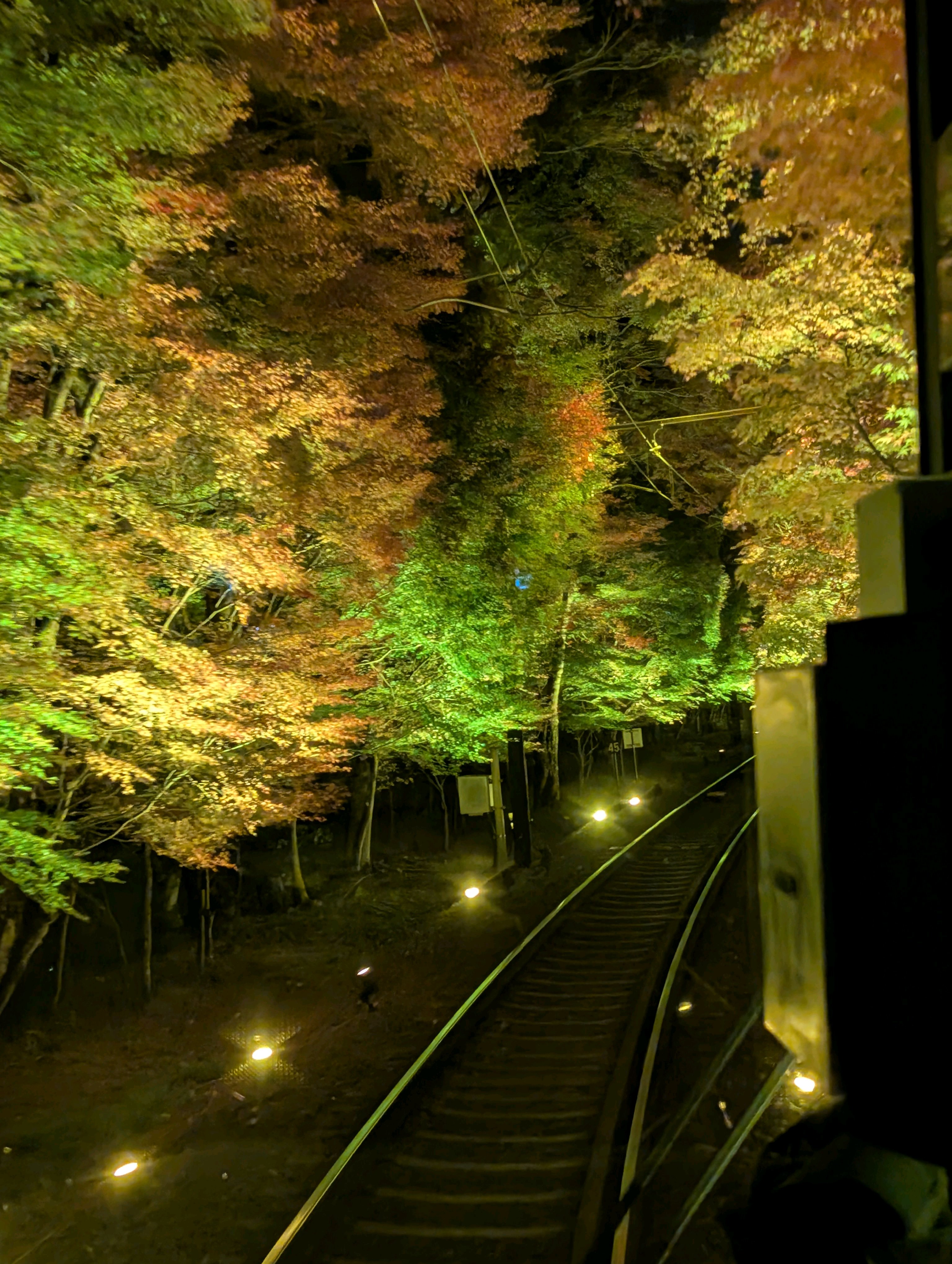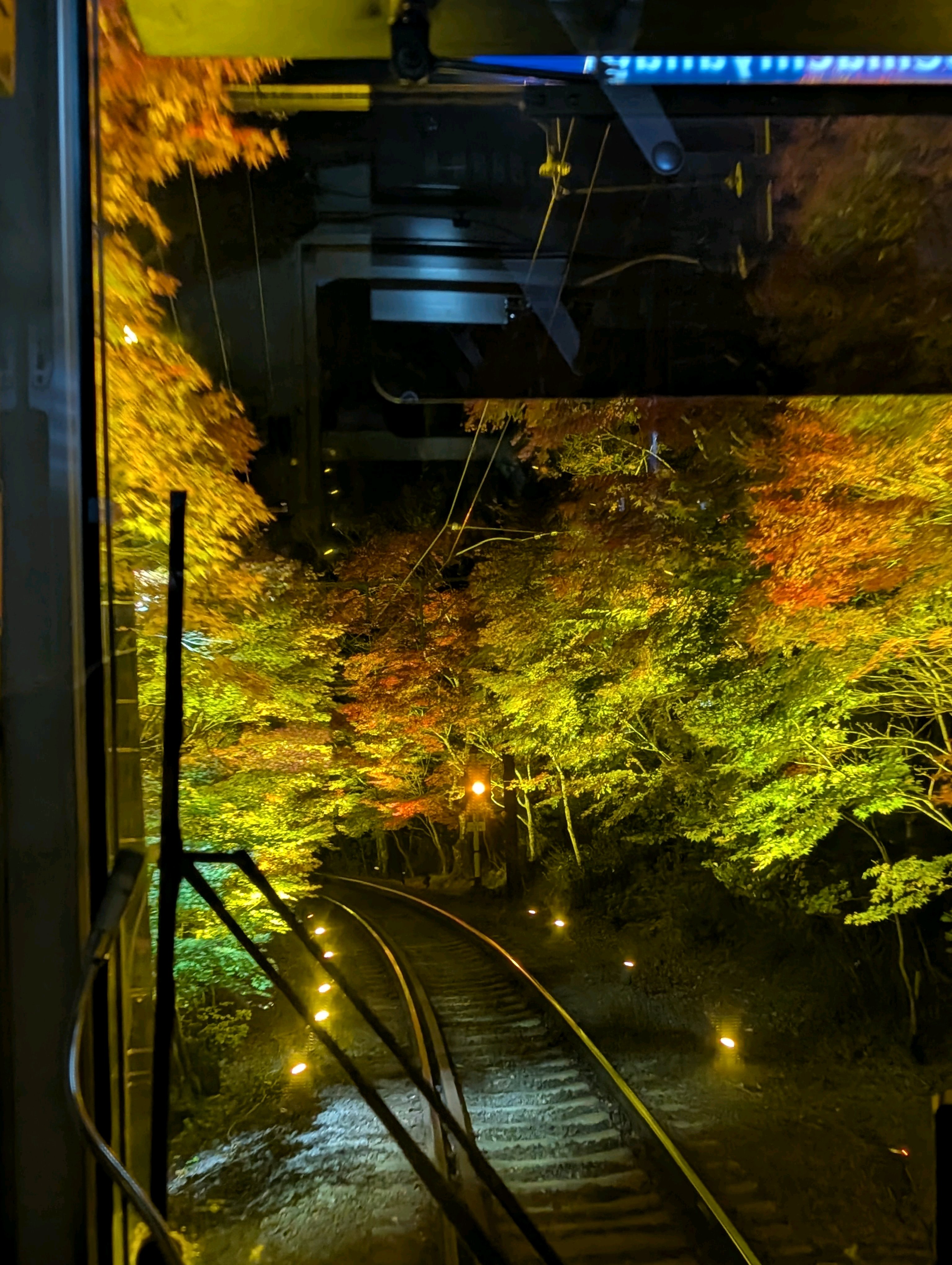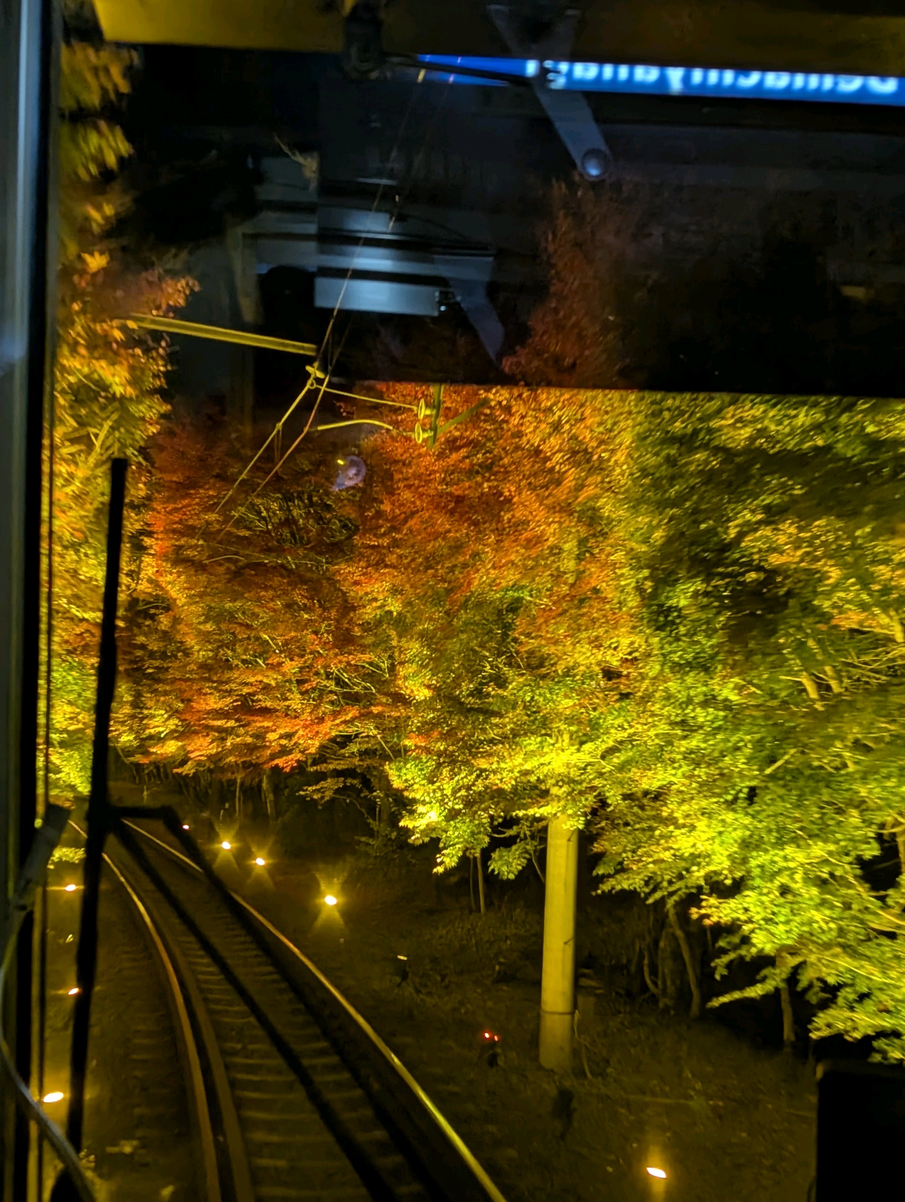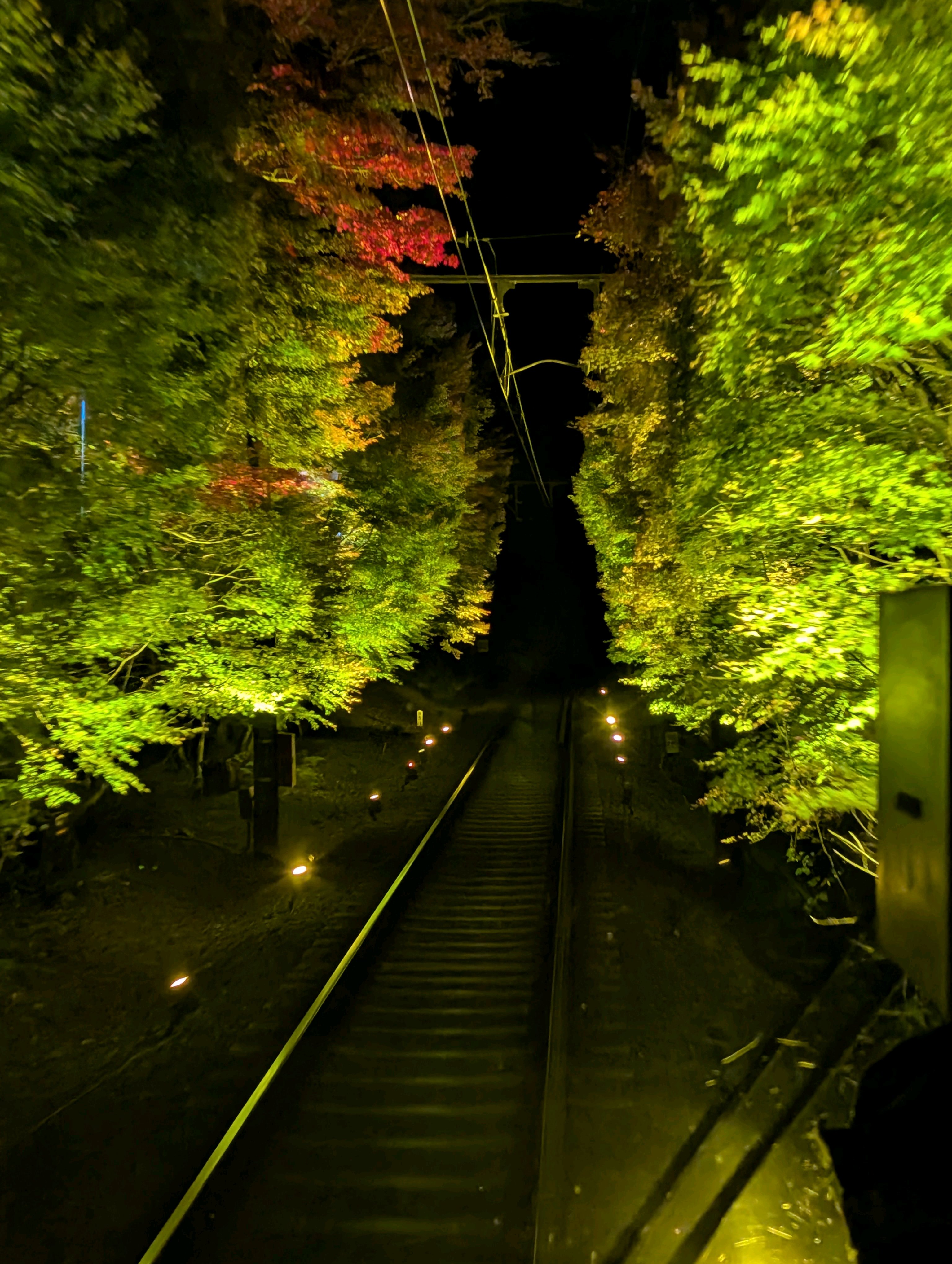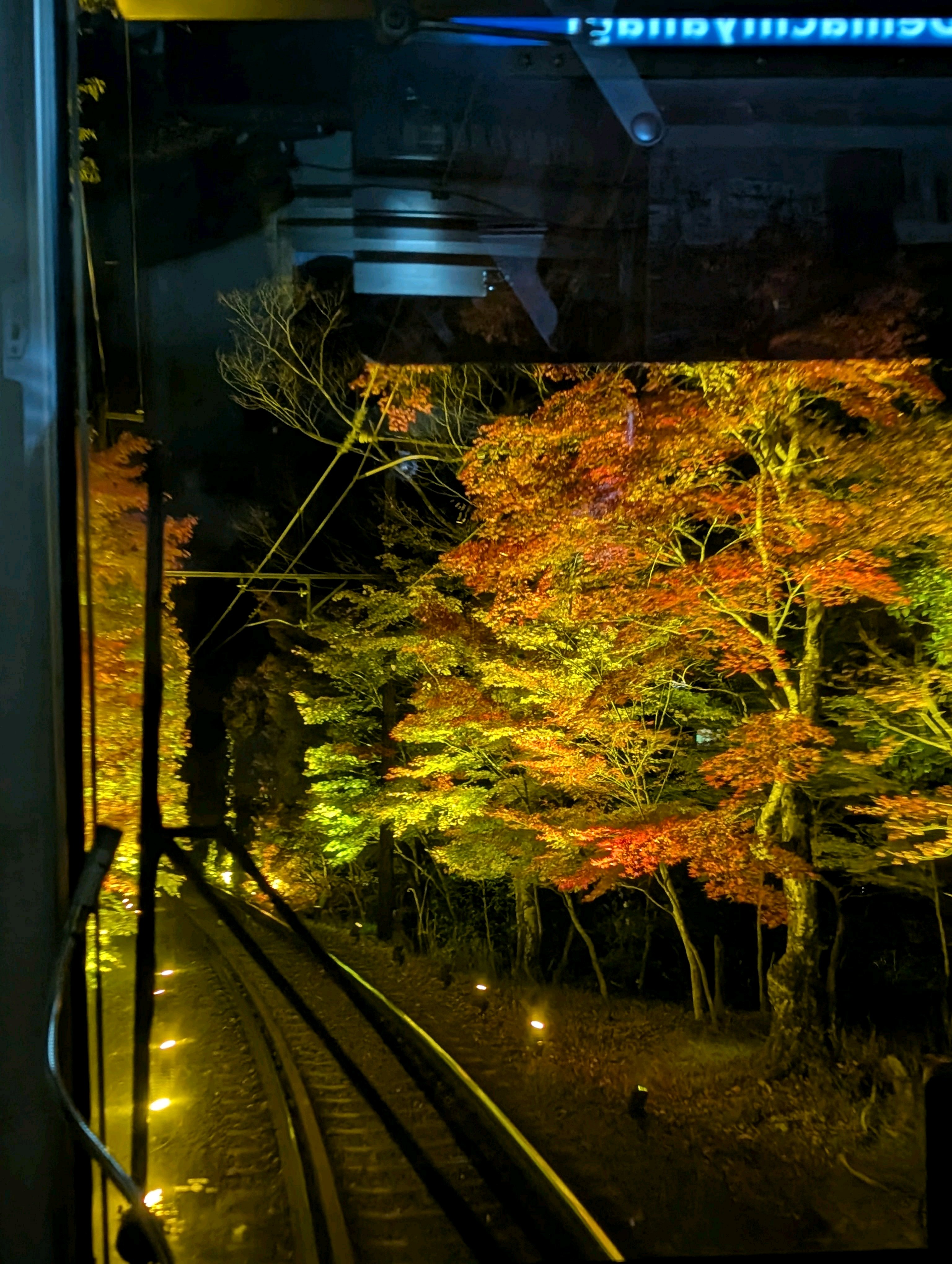 夜間に楽しめる叡山(えいざん)電車の車窓からの紅葉(こうよう)を紹介します
